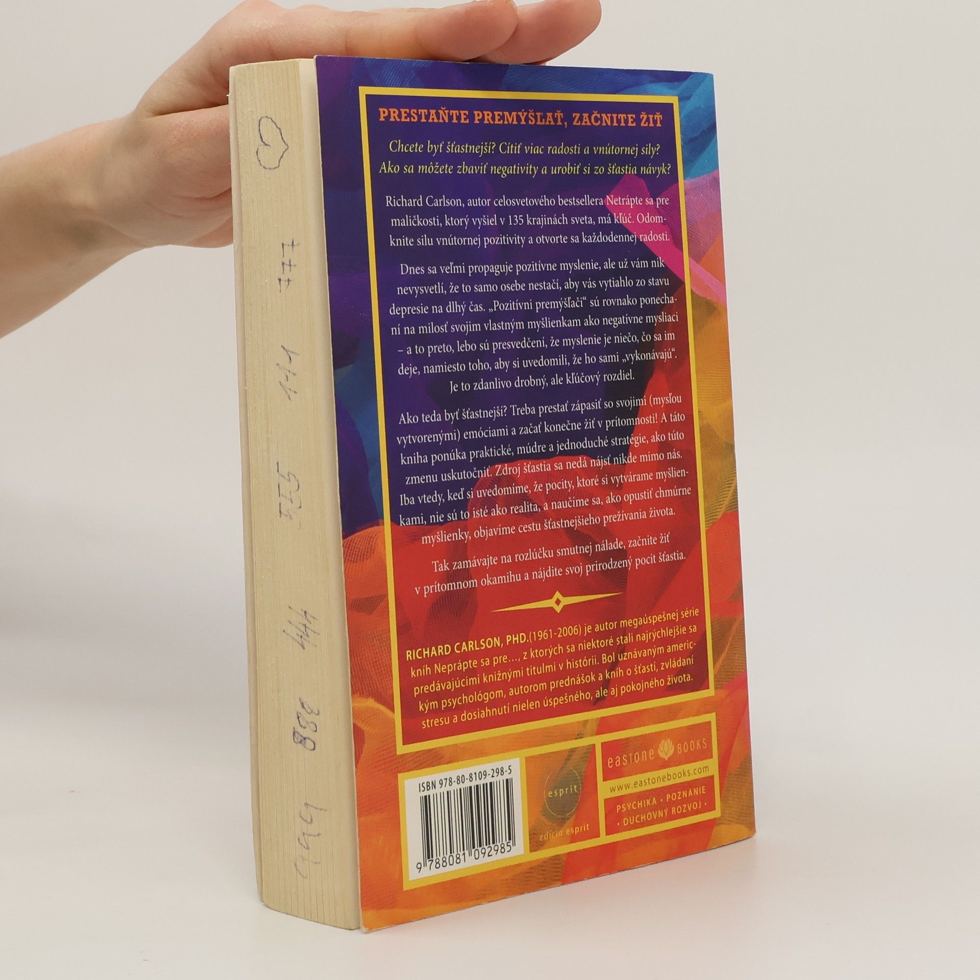 Chcete byť šťastnejší? Cítiť viac radosti a vnútornej sily? Ako sa môžete zbaviť negativity a urobiť si zo šťastia návyk? Richard Carlson, autor celosvetového bestsellera Netrápte sa pre maličkosti, ktorý vyšiel v 135 krajinách sveta, má kľúč. Odomknite silu vnútornej pozitivity a otvorte sa každodennej radosti. Dnes sa veľmi propaguje pozitívne myslenie, ale už vám nik nevysvetlí, že to samo osebe nestačí, aby vás vytiahlo zo stavu depresie na dlhý čas. „Pozitívni premýšľači“ sú rovnako ponechaní na milosť svojim vlastným myšlienkam ako negatívne mysliaci – a to preto, lebo sú presvedčení, že myslenie je niečo, čo sa im deje, namiesto aby si uvedomili, že ho sami „vykonávajú“. Je to zdanlivo drobný, ale kľúčový rozdiel. Ako teda byť šťastnejší? Treba prestať zápasiť so svojimi (mysľou vytvorenými) emóciami a začať konečne žiť v prítomnosti! A táto kniha ponúka praktické, múdre a jednoduché stratégie, ako túto zmenu uskutočniť.