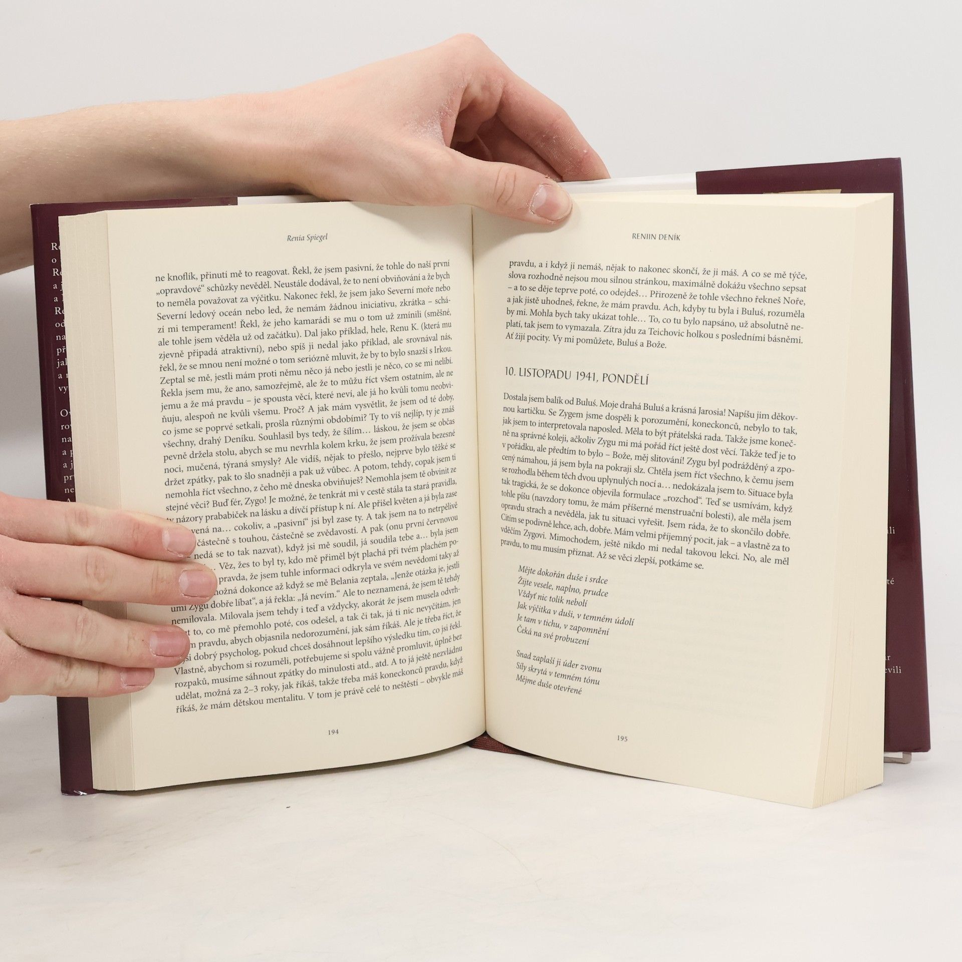 15. července 1942, středa Pamatuj si tenhle den; pamatuj si ho dobře. Od dnešních 8 hodin jsme uzavřeni v ghettu. Tady teď žiju. Svět je ode mě oddělen a já jsem oddělena od světa. Renia, mladá dívka z Polska, sní o tom, že se stane básnířkou. Když v roce 1939 napadne její zemi Sovětský svaz a Německo, její svět se roztříští. Oddělená od matky prchá z Přemyšli před bombardováním, přihlíží mizení židovských rodin a stává se svědkem vzniku ghetta. Navzdory hrůzám války nachází Renia krásu ve svém psaní a poprvé se zamilovává. Se Zygmuntem si vymění první polibek těsně před tím, než jejich město dobydou nacisté. Zygmunt napíše poslední, srdcervoucí zápis do Reniina deníku. Reniin deník, objevený po sedmdesáti letech, je považován za klasiku literatury o holocaustu. Renia Spiegel je označována za „polskou Annu Frankovou“. Její psaní je mimořádným svědectvím o hrůzách války, ale také o životě, který může existovat i v nejtemnějších dobách. Renia se narodila ve východním Polsku v roce 1924 a začala si psát deník v lednu 1939. Válka ji oddělila od matky a přivedla ji do Přemyšle, kde zažila brutalitu Sovětů a později nacistů. V létě 1942 se musela ukrývat, aby se vyhnula deportacím do vyhlazovacích táborů. Nacisti její úkryt objevili a zastřelili ji, když jí bylo čerstvě osmnáct let.