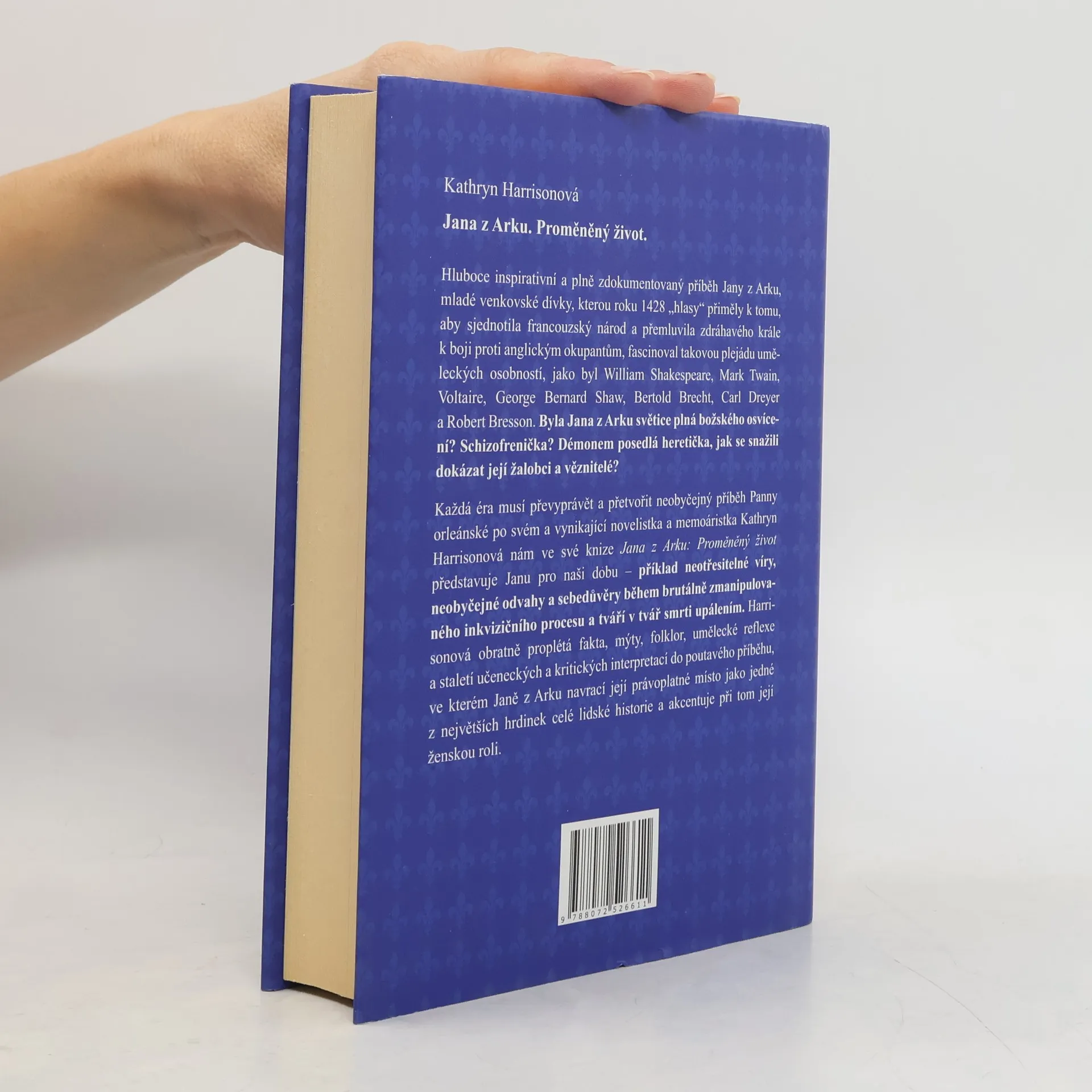 Nesmrtelný příběh o síle lidské odvahy. Hluboce inspirativní a plně zdokumentovaný příběh Jany z Arku, kterou roku 1428 „hlasy“ přiměly k tomu, aby sjednotila francouzský národ a přemluvila zdráhavého krále k boji proti anglickým okupantům, fascinoval takovou plejádu uměleckých osobností, jako byl William Shakespeare, Mark Twain, Voltaire, Bertold Brecht nebo Robert Bresson. Byla Jana z Arku světice plná božského osvícení? Schizofrenička? Démonem posedlá heretička, jak se snažili dokázat její žalobci a věznitelé? Každá éra musí převyprávět a přetvořit neobyčejný příběh Panny orleánské po svém a vynikající novelistka a memoáristka Kathryn Harrisonová nám ve své knize Jana z Arku: Proměněný život představuje Janu pro naši dobu – příklad neotřesitelné víry, neobyčejné odvahy a sebedůvěry během brutálně zmanipulovaného inkvizičního procesu a tváří v tvář smrti upálením. Harrisonová obratně proplétá fakta, mýty, folklor, umělecké reflexe a staletí učeneckých a kritických interpretací do poutavého příběhu, ve kterém Janě z Arku navrací její právoplatné místo jedné z největších hrdinek celé lidské historie a akcentuje při tom její ženskou roli.