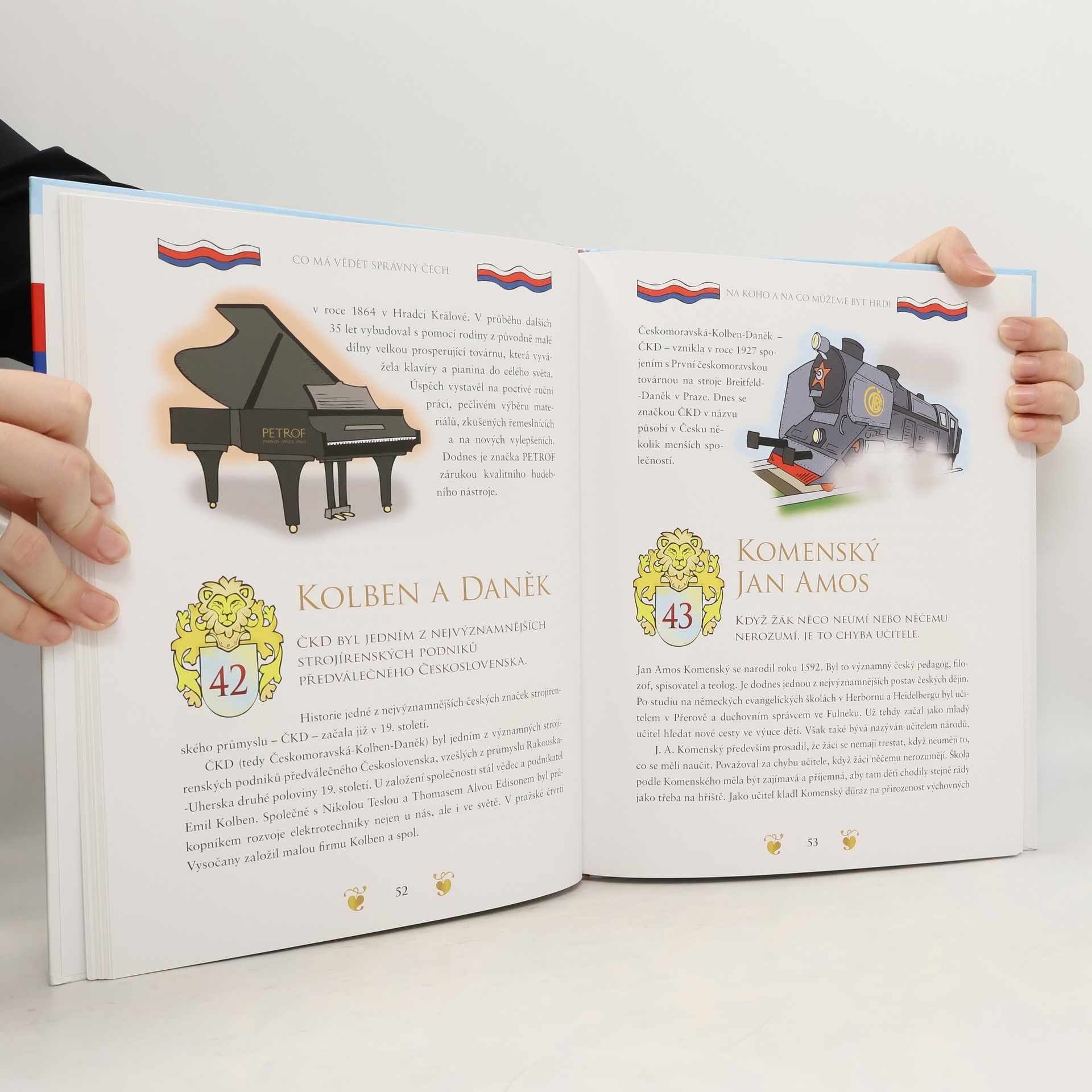 Znáte celou českou hymnu a kolik má slok? Víte, jaké jsou naše státní symboly a co znamenají? Kolik máme státních svátků a proč je slavíme? Nebo kteří Češi a jaké vynálezy se celosvětově proslavili? V této knížce se dozvíte odpověď nejen na tyto otázky, ale také spoustu dalších zajímavostí a střípků z naší historie. Máme právo být hrdi na to, co jsme v historii dokázali, kam jsme posunuli hranice vědy a techniky, hranice lidských možností ve sportu, co jsme dokázali v umění. Tato kniha pro vás jistě bude inspirací a připomene vám, proč být hrdý na to, že jsem Čech, a jací Češi byli a jsou kabrňáci!