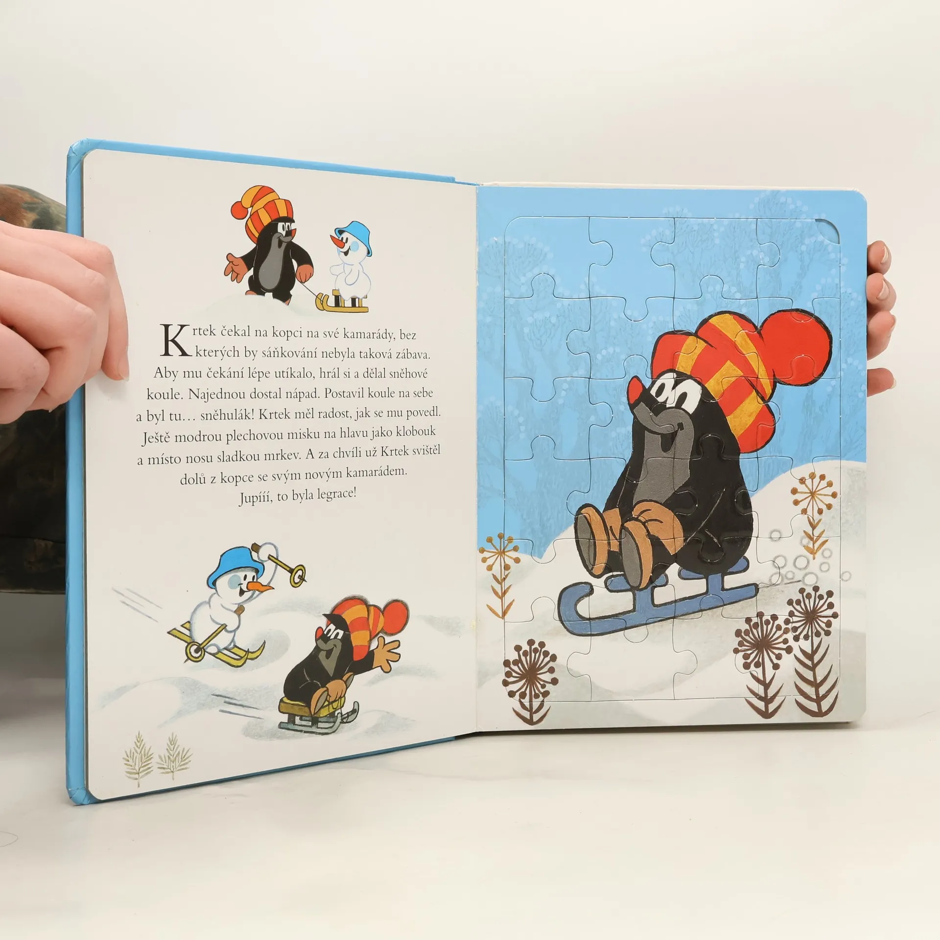 Kniha plná veselých skládaček potěší všechny malé děti. Začala zima a Krtek si ji užívá plnými doušky. Lyžuje, sáňkuje a dokonce si ze sněhu postaví nového kamaráda. S ostatními zvířátky z lesa krásně ozdobí stromeček a oslaví Vánoce. Kniha obsahuje 5 skládaček s 24 dílky.