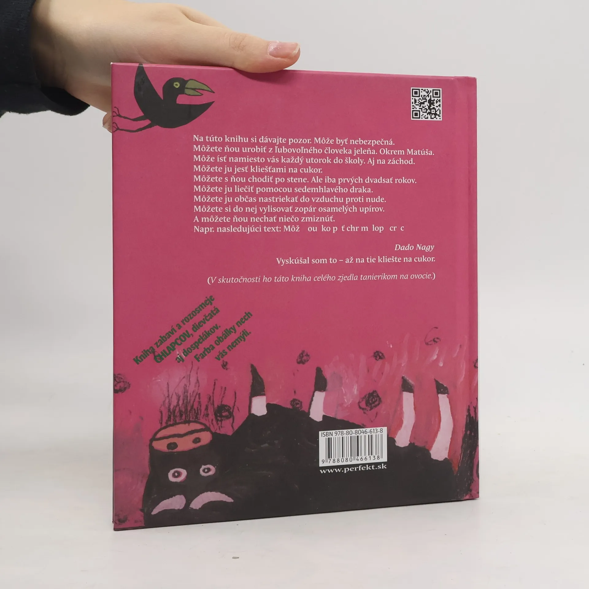 Na túto knihu si dávajte pozor. Môže byť nebezpečná. Môžete ňou urobiť z ľubovoľného človeka jeleňa. Okrem Matúša. Môže ísť namiesto vás každý utorok do školy. Aj na záchod. Môžete ju jesť kliešťami na cukor. Môžete s ňou chodiť po stene. Ale iba prvých dvadsať rokov. Môžete ju liečiť pomocou sedemhlavého draka. Môžete ju občas nastriekať do vzduchu proti nude. Môžete si do nej vylisovať zopár osamelých upírov. A môžete ňou nechať niečo zmiznúť. Napr. nasledujúci text : Môž ou ko p ť chr m lop cr c.