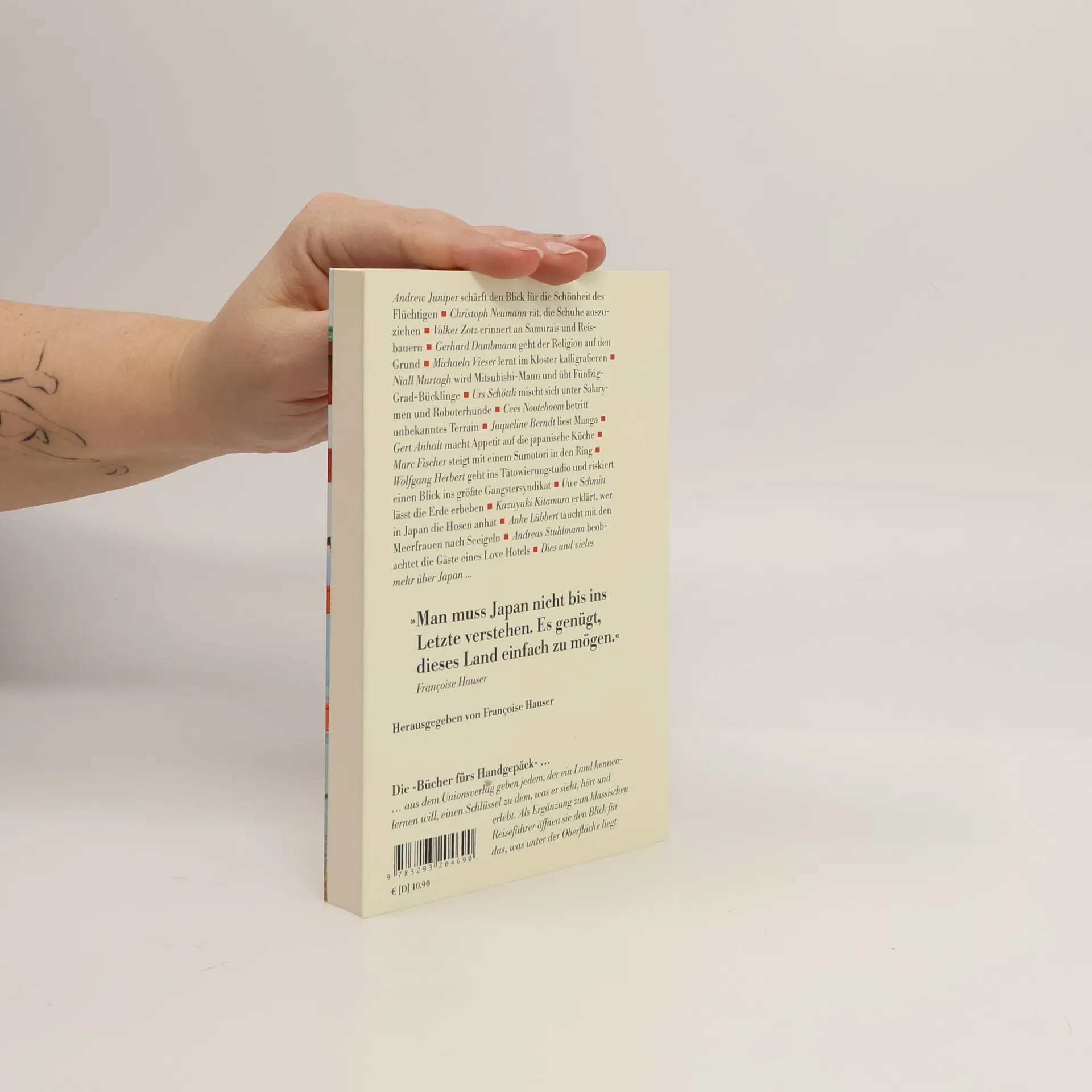Andrew Juniper schärft den Blick für die Schönheit des Flüchtigen Christoph Neumann rät, die Schuhe auszuziehen Volker Zotz erinnert an Samurais und Reisbauern Gerhard Dambmann geht der Religion auf den Grund Michaela Vieser lernt im Kloster kalligrafieren Niall Murtagh wird Mitsubishi-Mann und übt Fünfzig-Grad-Bücklinge Urs Schöttli mischt sich unter Salarymen und Roboterhunde Cees Nooteboom betritt unbekanntes Terrain Jaqueline Berndt liest Manga Gert Anhalt macht Appetit auf die japanische Küche Marc Fischer steigt mit einem Sumotori in den Ring Wolfgang Herbert geht ins Tätowierstudio und riskiert einen Blick ins größte Gangstersyndikat Uwe Schmitt lässt die Erde erbeben Kazuyuki Kitamura erklärt, wer in Japan die Hosen anhat Anke Lübbert taucht mit den Meerfrauen nach Seeigeln Andreas Stuhlmann beobachtet die Gäste eines Love Hotels Dies und vieles mehr über Japan …