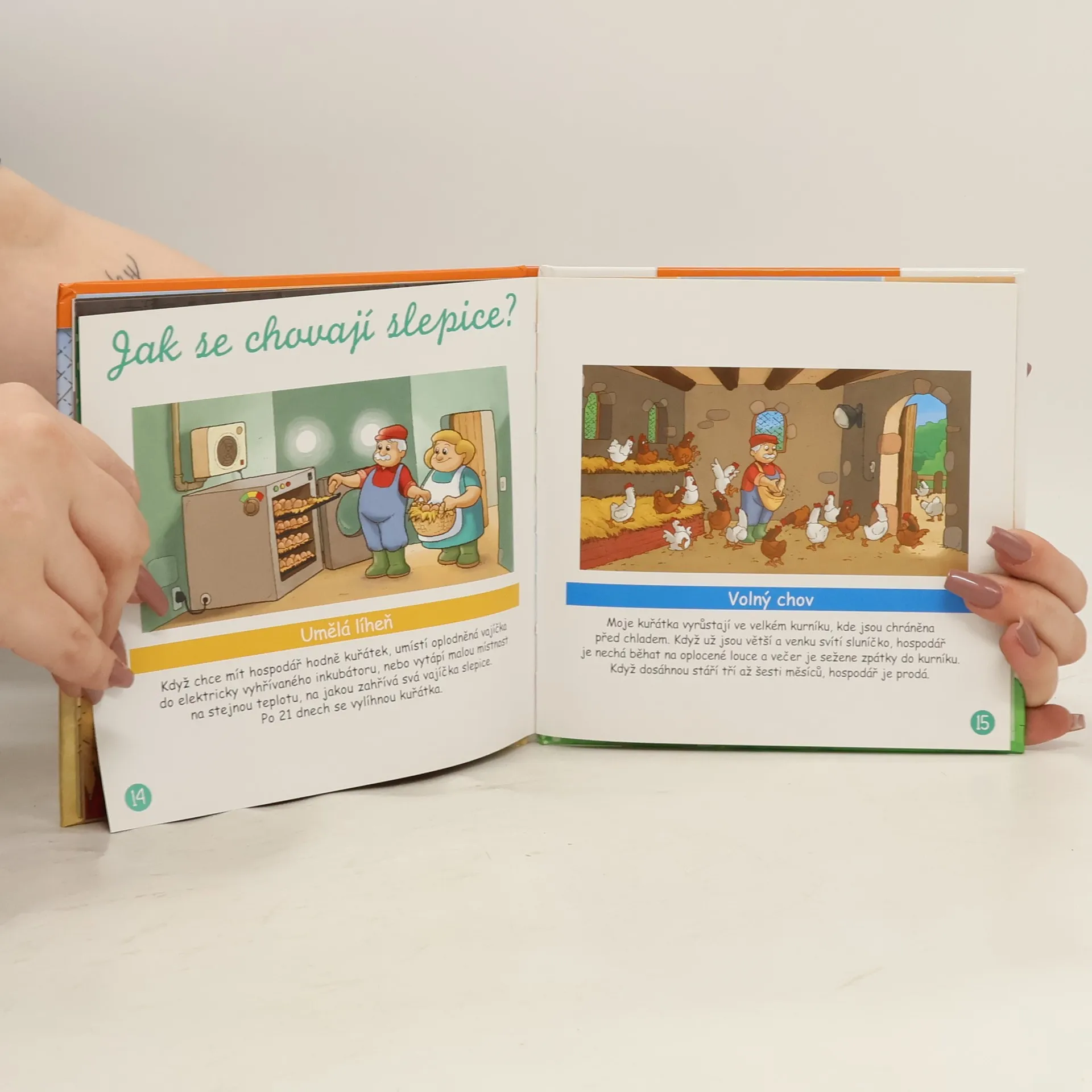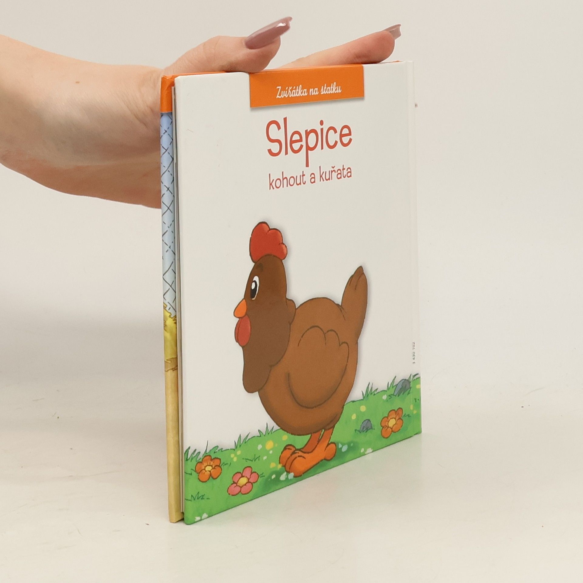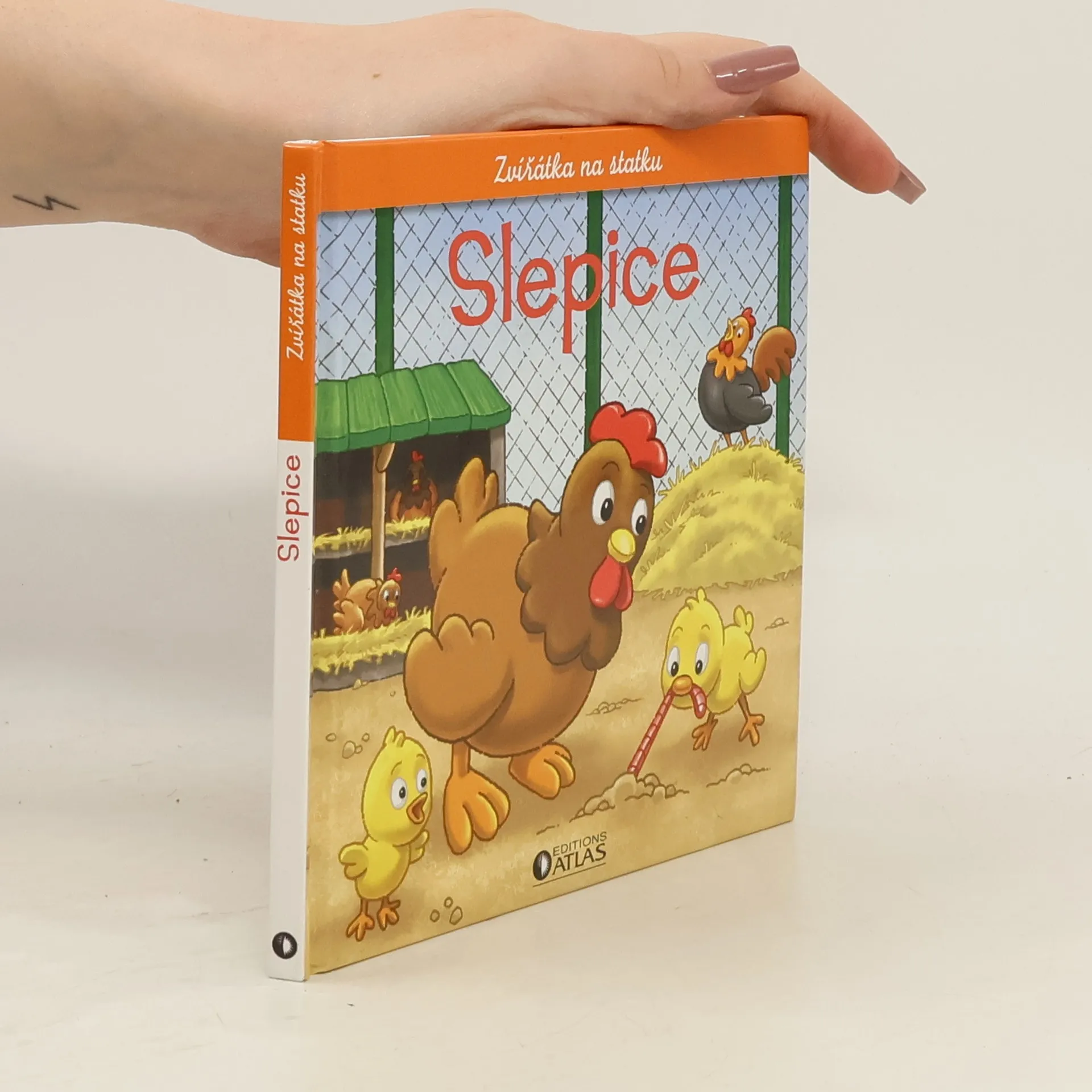 Slepice, kohout a kuřata. Kniha představuje slepici v jejím přirozeném prostředí, jak vypadá, jak se nazývají její části těla, co jí, kde bydlí. Dále představuje různá plemena. Na konci knihy jsou dvě krátké pohádky.