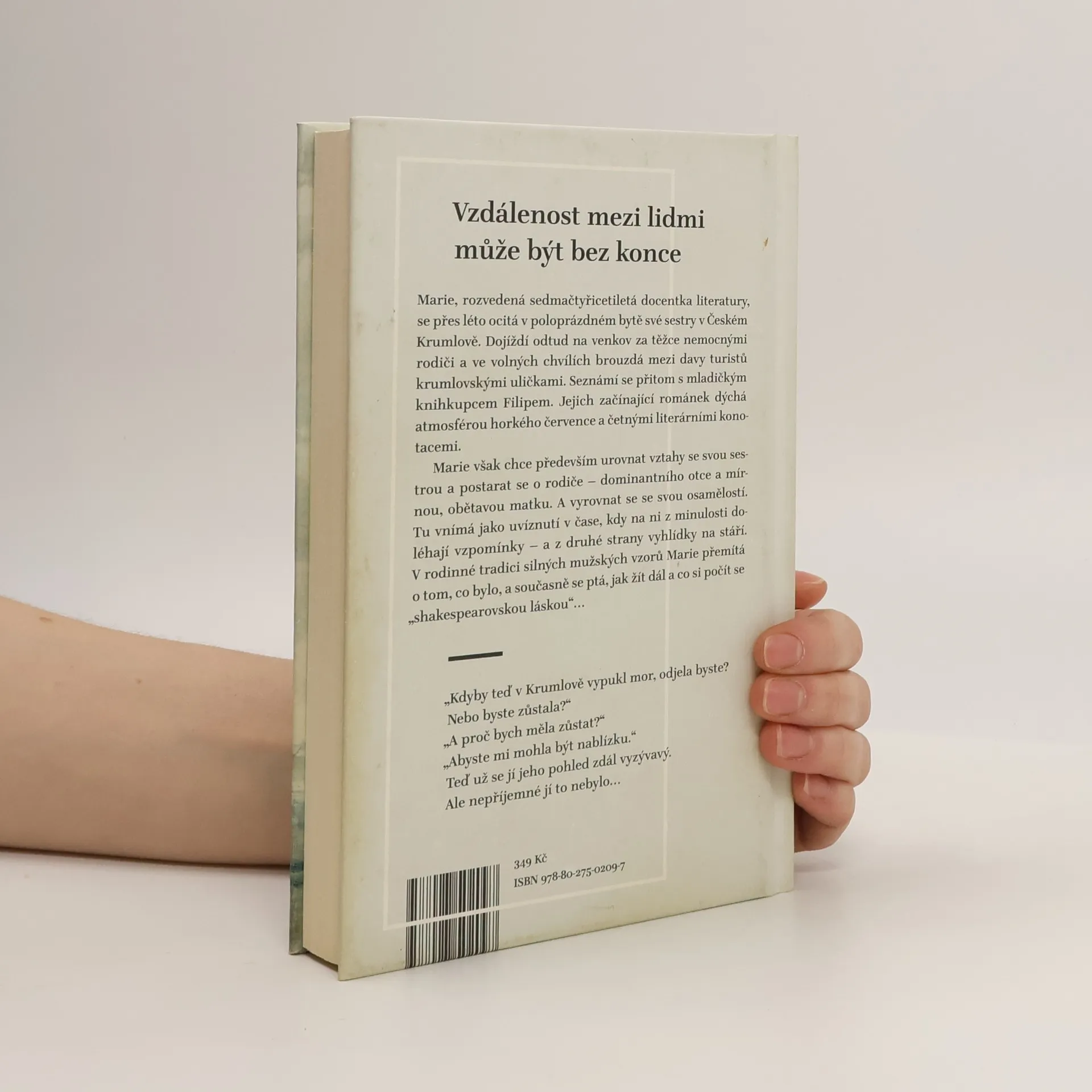 Marie, rozvedená sedmačtyřicetiletá docentka literatury, se přes léto ocitá v poloprázdném bytě své sestry v Českém Krumlově. Dojíždí odtud na venkov za těžce nemocnými rodiči a ve volných chvílích brouzdá mezi davy turistů krumlovskými uličkami. Seznámí se přitom s mladičkým knihkupcem Filipem. Jejich začínající románek dýchá atmosférou horkého července a četnými literárními konotacemi. Marie však chce především urovnat vztahy se svou sestrou a postarat se o rodiče – dominantního otce a mírnou, obětavou matku. A vyrovnat se se svou osamělostí. Tu vnímá jako uvíznutí v čase, kdy na ni z minulosti doléhají vzpomínky – a z druhé strany vyhlídky na stáří. V rodinné tradici silných mužských vzorů Marie přemítá o tom, co bylo, a současně se ptá, jak žít dál a co si počít se „shakespearovskou láskou“…