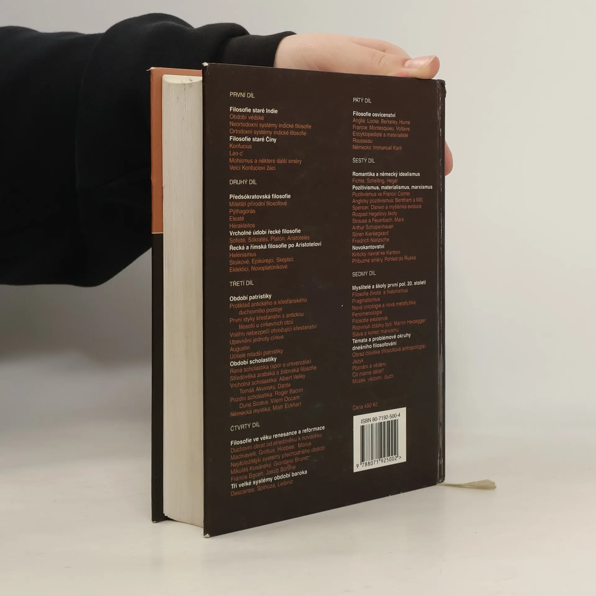U nás asi nejrozšířenější přehledné dějiny filosofie z pera německého autora vycházejí již po sedmé, v nové přepracované a rozšířené úpravě. Znovu si můžete připomenout, jakou úlohu hrálo myšlení v různých epochách, jaké řešení se nabízela na cestě poznání nebo jak se nahlížela otázka boha. Kniha je uspořádána chronologicky a dále podle osobností či směrů.
