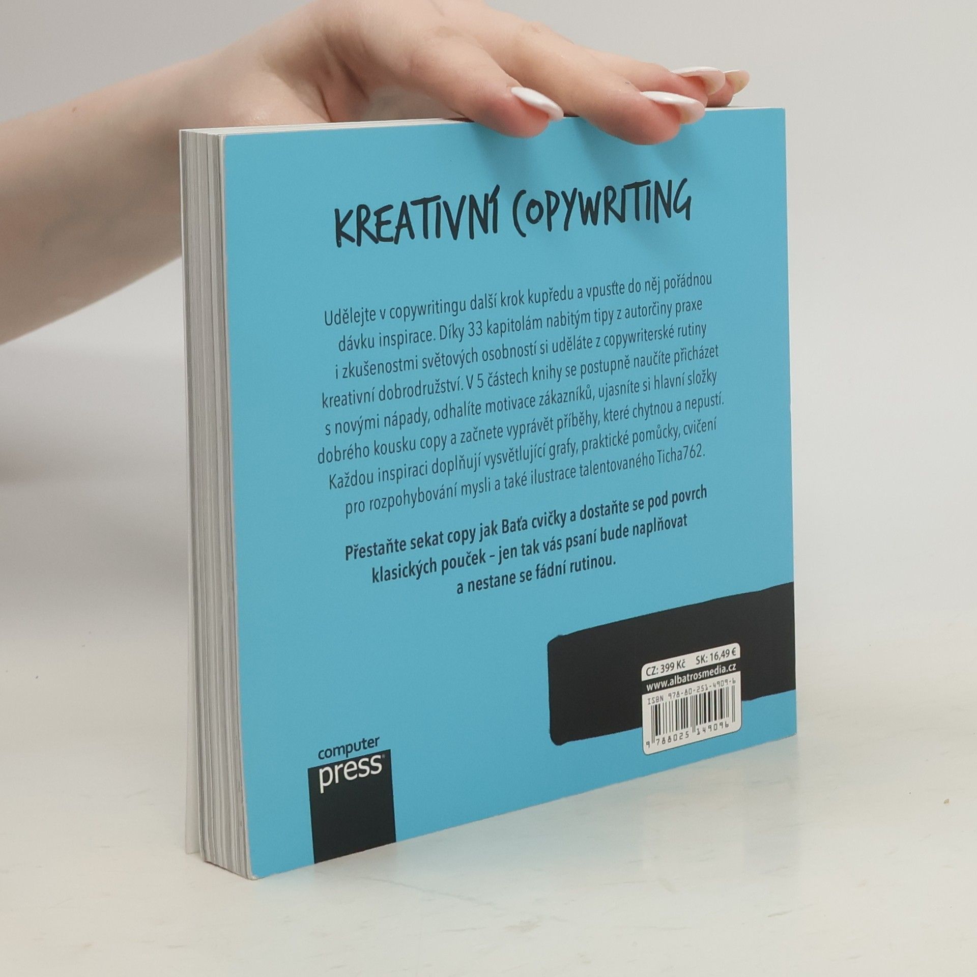 33 inspirací pro ještě lepší copywriting Udělejte v copywritingu další krok kupředu a vpusťte do něj pořádnou dávku inspirace. Díky 33 kapitolám nabitým tipy z autorčiny praxe i zkušenostmi světových osobností si uděláte z copywriterské rutiny kreativní dobrodružství. V 5 částech knihy se postupně naučíte přicházet s novými nápady, odhalíte motivace zákazníků, ujasníte si hlavní složky dobrého kousku copy a začnete vyprávět příběhy, které chytnou a nepustí. Každou inspiraci doplňují vysvětlující grafy, praktické pomůcky, cvičení pro rozpohybování mysli a také ilustrace talentovaného Ticha762. Přestaňte sekat copy jak Baťa cvičky a dostaňte se pod povrch klasických pouček – jen tak vás psaní bude naplňovat a nestane se fádní rutinou. O autorce: Anička Sálová se věnuje copywritingu a online marketingu přes 5 let. V tehdy největší online marketingové agentuře ČR – H1.cz – to dotáhla až na vedoucí tamního copytýmu. Odtud už byl jen krůček k založení vlastní obsahové agentury Content Wizards. Jako content strategist pomáhá online projektům najít vlastní hlas a školí veřejnost i firmy.
