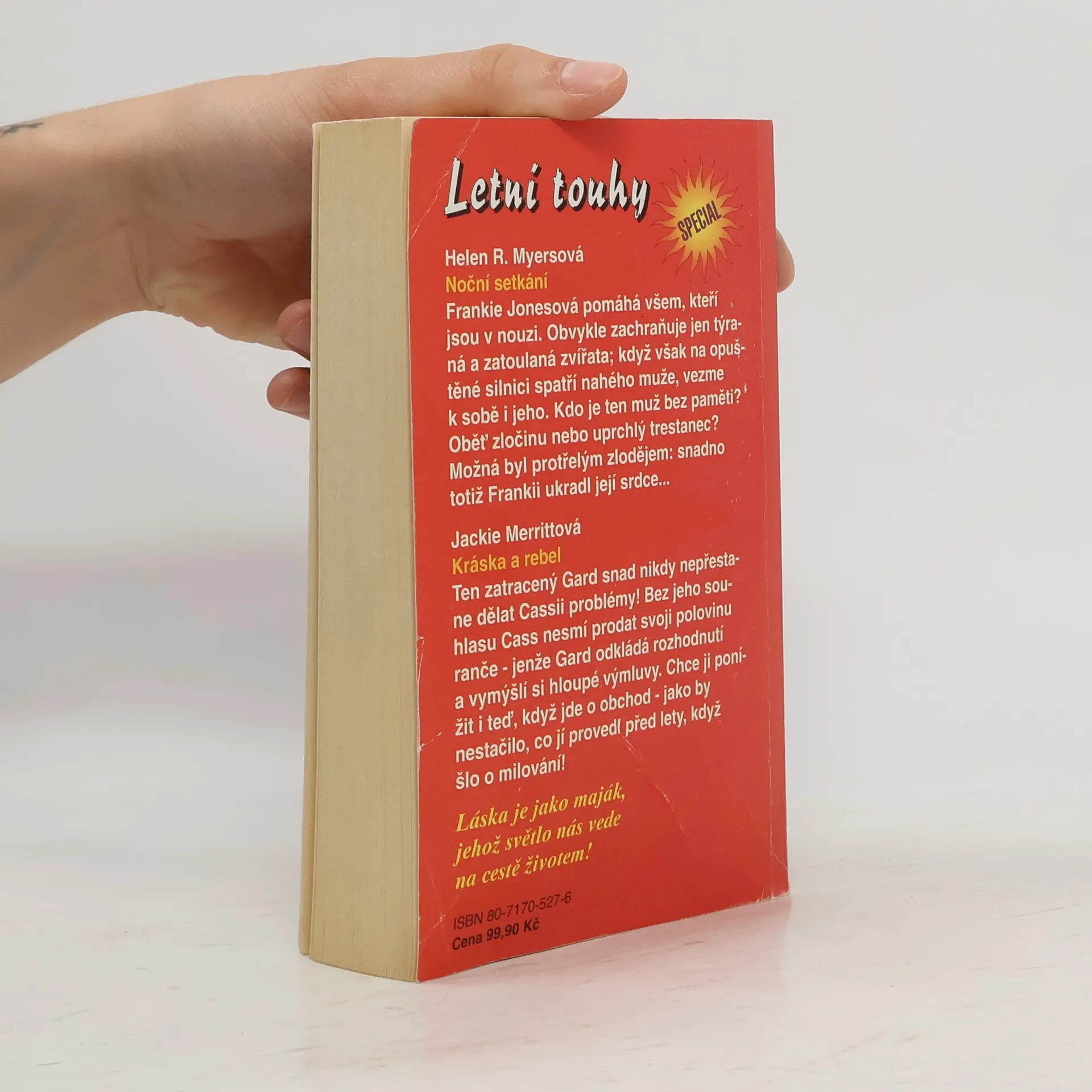 Noční setkání - Helen R. Myers Frankie Jonesová pomáhá všem, kteří jsou v nouzi. Obvykle zachraňuje jen týraná a zatoulaná zvířata; když však na opuštěné silnici spatří nahého muže, vezme k sobě i jeho. Kdo je ten muž bez paměti? Oběť zločinu nebo uprchlí trestanec? Možná byl protřelým zlodějem: snadno totiž Frankie ukradl její srdce... Kráska a rebel - Jackie Merritt Ten zatracený Gard snad nikdy nepřestane dělat Cassie problémy! Bez jeho souhlasu Cass nesmí prodat svoji polovinu ranče - jenže Gard odkládá rozhodnutí a vymýšlí si hloupé výmluvy. Chce ji ponížit i teď, když jde o obchod - jako by nestačilo, co ji provedl před lety, když šlo o milování!