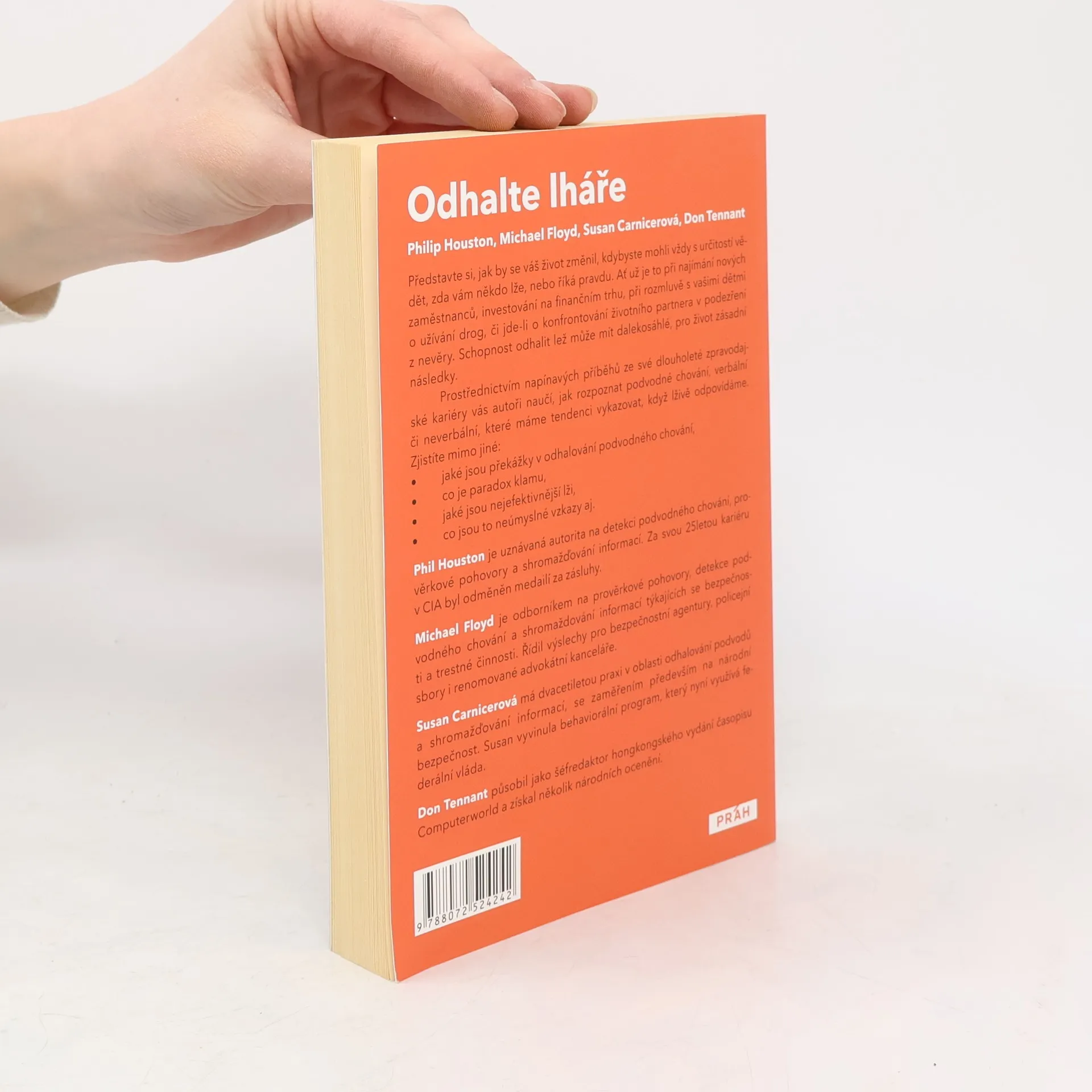 Představte si, jak by se váš život změnil, kdybyste mohli vždy s určitostí vědět, zda vám někdo lže, nebo říká pravdu. Ať už je to při najímání nových zaměstnanců, investování na finančním trhu, při rozmluvě s vašimi dětmi o užívání drog, či jde-li o konfrontování životního partnera v podezření z nevěry. Mít schopnost odhalit lež může mít dalekosáhlé, pro život zásadní následky. Prostřednictvím napínavých příběhů ze své dlouholeté zpravodajské kariéry vás autoři naučí, jak rozpoznat podvodné chování, verbální či neverbální, které máme tendenci vykazovat, když lživě odpovídáme. Zjistíte mimo jiné: " jaké jsou překážky v odhalování podvodného chování, " co je paradox klamu, " jaké jsou nejefektivnější lži, " co jsou to neúmyslné vzkazy aj.