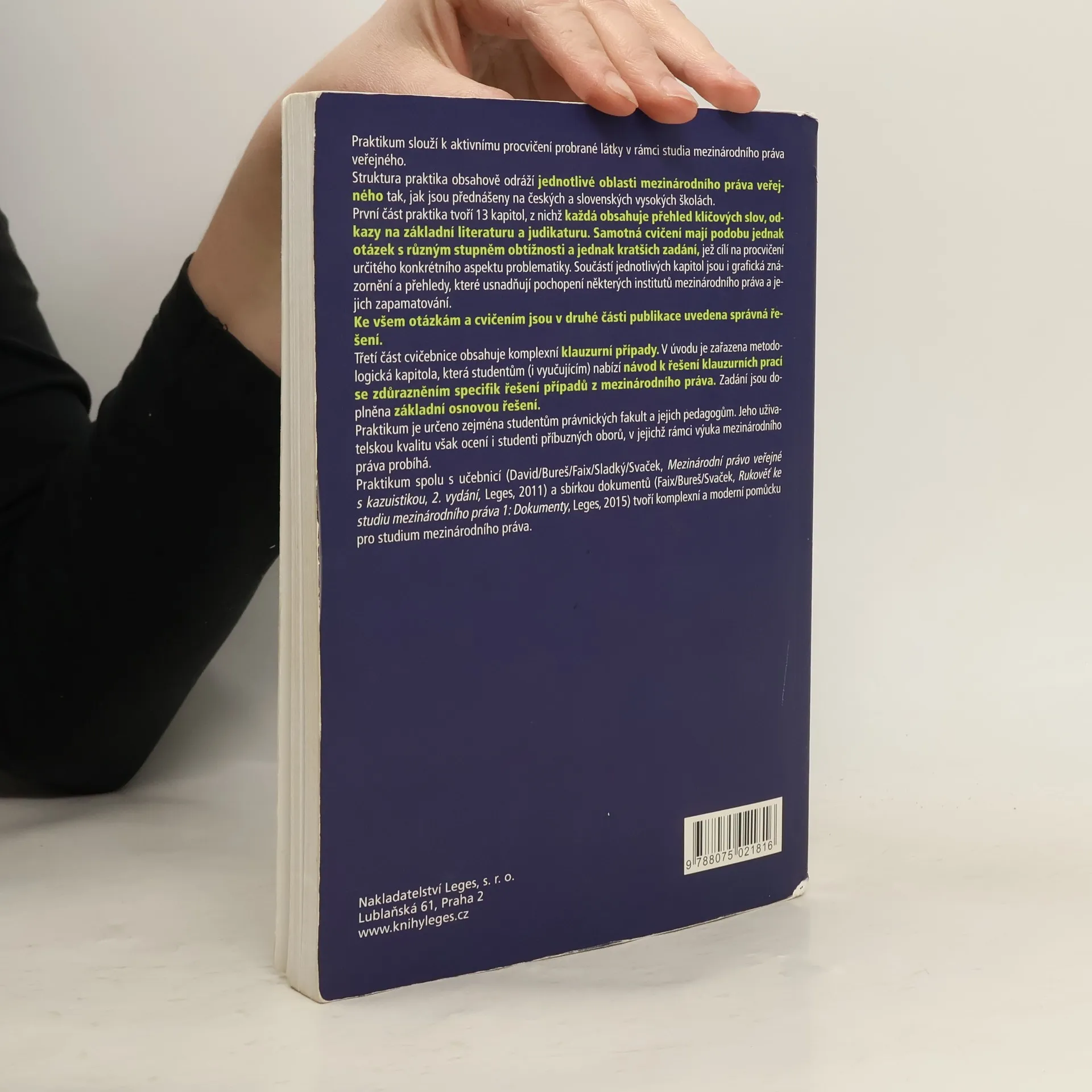 Praktikum slouží k aktivnímu procvičení mezinárodního práva veřejného a jeho struktura odráží oblasti probrané na českých a slovenských vysokých školách. První část obsahuje 13 kapitol, každou s přehledem klíčových slov, odkazy na literaturu a judikaturu. Cvičení zahrnují otázky různých obtížností a kratší zadání zaměřená na konkrétní aspekty problematiky. Kapitoly obsahují grafická znázornění a přehledy pro usnadnění porozumění a zapamatování institutů mezinárodního práva. Druhá část publikace poskytuje správná řešení ke všem otázkám a cvičením. Třetí část obsahuje komplexní klauzurní případy, doplněné metodologickou kapitolou, která nabízí návod k řešení klauzurních prací se zaměřením na specifika mezinárodního práva. Zadání jsou podpořena základní osnovou řešení. Praktikum je určeno především studentům právnických fakult a jejich pedagogům, ale také studentům příbuzných oborů, kde se vyučuje mezinárodní právo. Spolu s učebnicí a sbírkou dokumentů tvoří komplexní a moderní pomůcku pro studium mezinárodního práva.