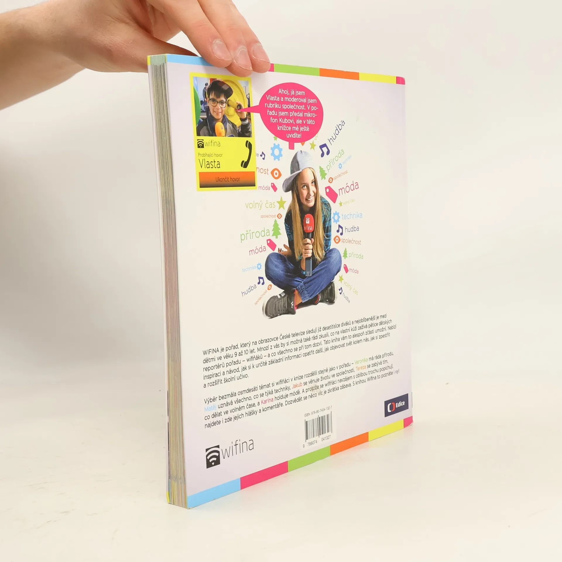 WIFINA je pořad, který se na obrazovce České televize objevil spolu se startem jejího dětského kanálu Déčko v září 2013. Dnes ho sledují již desetitisíce diváků a nejoblíbenější je mezi dětmi ve věku 9 až 10 let. Mnozí z nich by si také rádi zkusili, co na vlastní kůži zažívá pětice dětských reportérů – wifiňáků a co všechno se přitom dozví. KNIHA WIFINA jim to také umožní. Nabízí inspiraci a návod, jak si k určité základní informaci opatřit další, jak objevovat svět kolem nás, zpestřit si a rozšířit školní učivo. Výběr bezmála osmdesáti témat si wifiňáci v knize rozdělili stejně jako v pořadu – Veronika má ráda přírodu, Matěj uznává všechno, co se týká techniky, Jakub se věnuje životu ve společnosti, Tereza se zabývá tím, co dělat ve volném čase, a Karina holduje módě a hudbě. A protože se wifiňáci navzájem s oblibou trochu popichují, najdete i zde jejich „hlášky“ a komentáře. Dozvědět se něco víc je zkrátka zábava. S knihou Wifina to poznáte i vy!