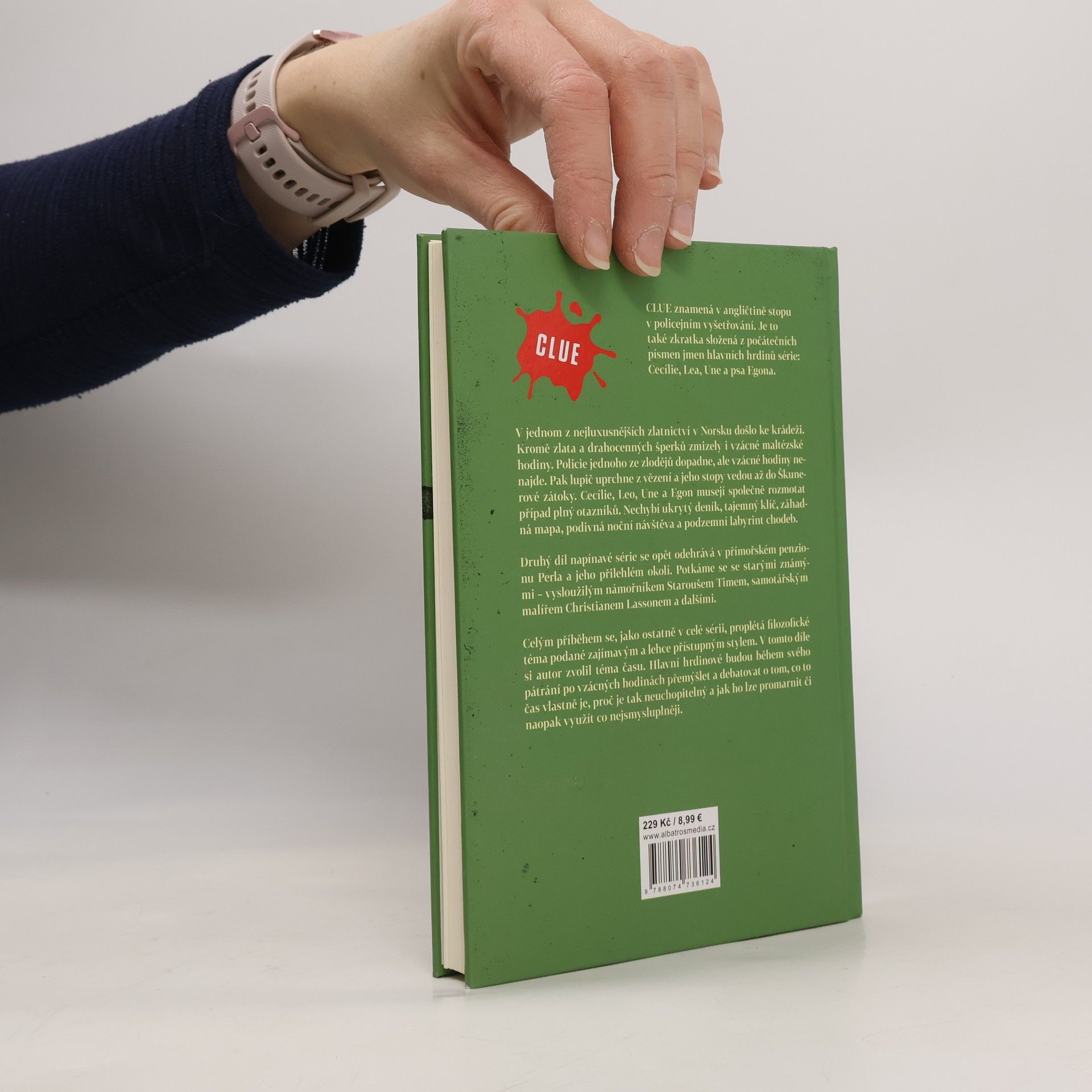 CLUE znamená v angličtině stopu v policejním vyšetřování. Je to také název detektivní série pro mladé čtenáře ve věku 9–14 let. A konečně je to i složenina z počátečních písmen jmen hlavních hrdinů série: Cecílie, Lea, Une a psa Egona. Jedno z nejluxusnějších zlatnictví v Norsku bylo vykradeno. Kromě zlata a drahocenných šperků zmizely i vzácné maltézské hodiny. Zloději byli dopadeni, ale cenné hodiny se nenašly. Pak jeden z lupičů uprchne z vězení a jeho stopy vedou až do Škunerové zátoky. Cecílie, Leo, Une a Egon musejí společně rozmotat případ plný otazníků. Nechybí ukrytý deník, tajemný klíč, záhadná mapa, podivná noční návštěva a podzemní labyrint chodeb. Celým příběhem se, jako ostatně v celé sérii, proplétá filozofické téma podané zajímavým a lehce přístupným stylem. V tomto díle si autor jako leitmotiv zvolil téma času. Hlavní hrdinové budou během svého pátrání po vzácných hodinách přemýšlet a debatovat o tom, co to čas vlastně je, proč je tak neuchopitelný a jak ho lze promarnit či naopak využít co nejsmysluplněji.