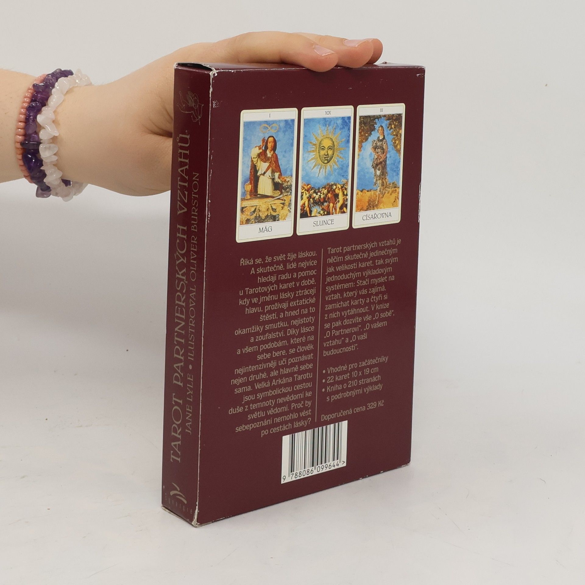 Říká se, že svět žije láskou. A skutečně, lidé nejvíce hledají radu a pomoc u Tarotových karet v době, kdy ve jménu lásky ztrácejí hlavu, prožívají extatické štěstí, a hned na to okamžiky smutku, nejistoty a zoufalství. Díky lásce a všem podobám, které na sebe bere, se člověk nejintenzivněji učí poznávat nejen druhé, ale hlavně sebe sama. Velká Arkána Tarotu jsou symbolickou cestou duše z temnoty nevědomí ke světlu vědomí. Proč by sebepoznání nemohlo vést po cestách lásky? Tarot partnerských vztahů je něčím skutečně jedinečným jak velikostí karet, tak svým jednoduchým výkladovým systémem. Stačí myslet na vztah, zamíchat karty a čtyři vytáhnout. V knize se pak dozvíte vše "O sobě", "O partnerovi", "O vašem vztahu" a "O vaší budoucnosti". vhodné pro začátečníky, 22 karet 10x19 cm a kniha o 210 stranách s podrobným výkladem
