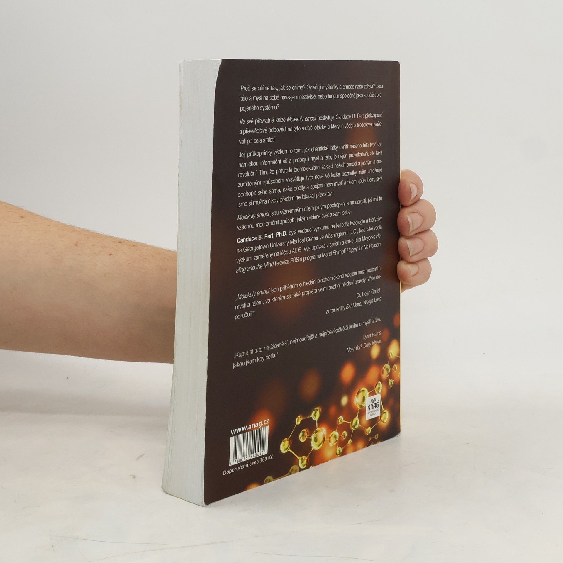 Proč se cítíme tak, jak se cítíme? Jak naše myšlenky a emoce ovlivňují naše zdraví? Jsou naše tělo a mysl od sebe navzájem odlišné, nebo fungují společně jako součást propojeného systému? Propojení těla a mysli. Ve své průkopnické knize Molekuly emocí Candace Pert poskytuje překvapivé a přesvědčivé odpovědi na tyto a další náročné otázky, o kterých vědci a filozofové uvažovali už po staletí. Její průkopnický výzkum o tom, jak chemikálie uvnitř našich těl tvoří dynamickou informační síť, propojující mysl a tělo, není pouze provokativní, nýbrž revoluční. Na základě stanovení biomolekulárního základu našich emocí a vysvětlení těchto nových vědeckých poznatků jasným a přístupným způsobem nám autorka umožňuje pochopit sama sebe, své pocity a spojení mezi naší myslí a naším tělem – těla-mysli – způsobem, který jsme si možná nikdy předtím nemohli představit. Molekuly emocí je dominantní dílo, plné pochopení a moudrosti a ovládnutí této vzácné síly ke změně způsobu, jakým vidíme svět a sami sebe.