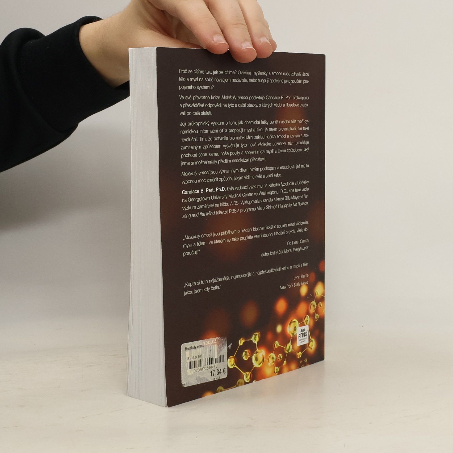 Proč se cítíme tak, jak se cítíme? Jak naše myšlenky a emoce ovlivňují naše zdraví? Jsou naše tělo a mysl od sebe navzájem odlišné, nebo fungují společně jako součást propojeného systému? Propojení těla a mysli. Ve své průkopnické knize Molekuly emocí Candace Pert poskytuje překvapivé a přesvědčivé odpovědi na tyto a další náročné otázky, o kterých vědci a filozofové uvažovali už po staletí. Její průkopnický výzkum o tom, jak chemikálie uvnitř našich těl tvoří dynamickou informační síť, propojující mysl a tělo, není pouze provokativní, nýbrž revoluční. Na základě stanovení biomolekulárního základu našich emocí a vysvětlení těchto nových vědeckých poznatků jasným a přístupným způsobem nám autorka umožňuje pochopit sama sebe, své pocity a spojení mezi naší myslí a naším tělem – těla-mysli – způsobem, který jsme si možná nikdy předtím nemohli představit. Molekuly emocí je dominantní dílo, plné pochopení a moudrosti a ovládnutí této vzácné síly ke změně způsobu, jakým vidíme svět a sami sebe.