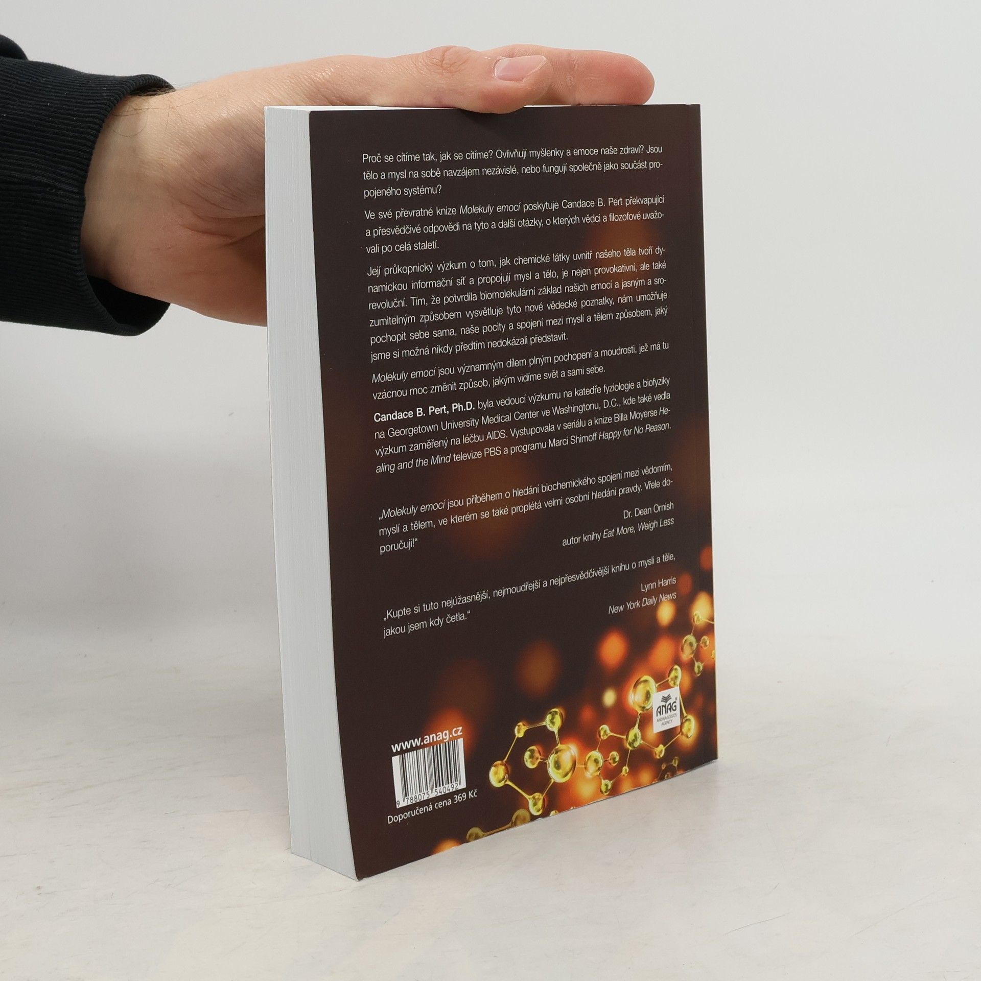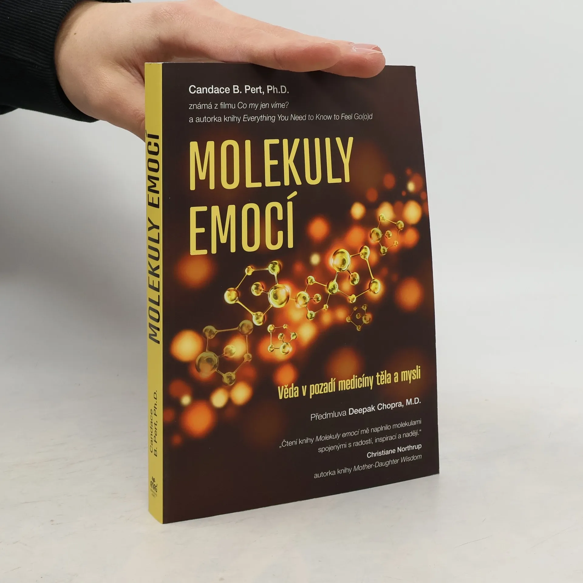 Proč se cítíme tak, jak se cítíme? Jak naše myšlenky a emoce ovlivňují naše zdraví? Jsou naše tělo a mysl od sebe navzájem odlišné, nebo fungují společně jako součást propojeného systému? Propojení těla a mysli. Ve své průkopnické knize Molekuly emocí Candace Pert poskytuje překvapivé a přesvědčivé odpovědi na tyto a další náročné otázky, o kterých vědci a filozofové uvažovali už po staletí. Její průkopnický výzkum o tom, jak chemikálie uvnitř našich těl tvoří dynamickou informační síť, propojující mysl a tělo, není pouze provokativní, nýbrž revoluční. Na základě stanovení biomolekulárního základu našich emocí a vysvětlení těchto nových vědeckých poznatků jasným a přístupným způsobem nám autorka umožňuje pochopit sama sebe, své pocity a spojení mezi naší myslí a naším tělem – těla-mysli – způsobem, který jsme si možná nikdy předtím nemohli představit. Molekuly emocí je dominantní dílo, plné pochopení a moudrosti a ovládnutí této vzácné síly ke změně způsobu, jakým vidíme svět a sami sebe.