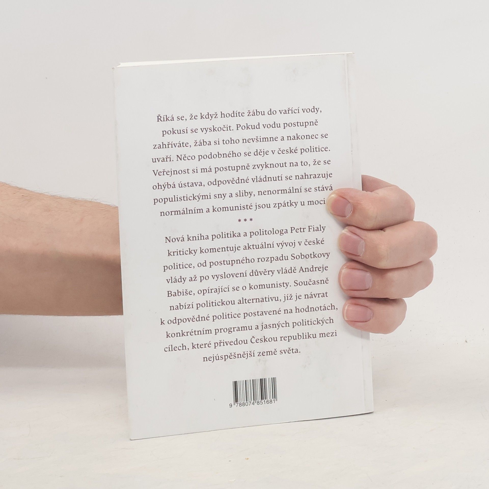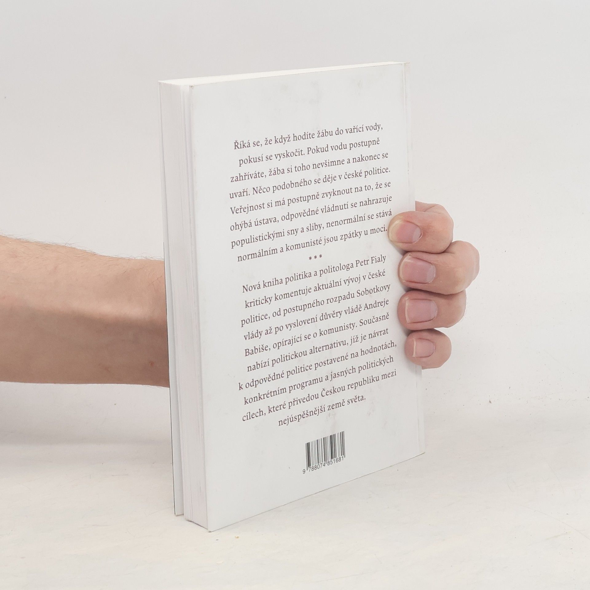 Podtitul: Od vládní agonie k polokomunistické vládě V české politice se děje něco podobného jako s žábou v postupně zahřívané vodě. Veřejnost si má zvyknout na ohýbání ústavy, nahrazování odpovědného vládnutí populistickými sliby a návrat komunistů k moci. Nová kniha Petra Fialy komentuje vývoj od rozpadu Sobotkovy vlády po získání důvěry vlády Andreje Babiše, která se opírá o komunisty. Autor jako politik a politolog odhaluje oslabování demokracie a manipulaci veřejnosti, která se má přizpůsobit novým mocenským hrám prezidenta Zemana a premiéra Babiše. Zmiňuje porušování ústavních pravidel, rostoucí byrokracii a úbytek svobody, stejně jako změnu zahraničněpolitické orientace. Kritizuje programovou prázdnotu vlády a její manažerská selhání, vyvrací výmluvy levice obhajující spolupráci s komunisty. Kniha však není pouze kritická; nabízí alternativu. Navrhuje návrat k odpovědné politice založené na hodnotách a konkrétním programu, která občanům přináší měřitelné cíle. Oproti nesplnitelným snům a chaotickému přístupu ukazuje cestu, která může Českou republiku přivést mezi nejúspěšnější země světa. To je důstojný politický cíl, který si můžeme dát v roce stého výročí naší moderní státnosti.