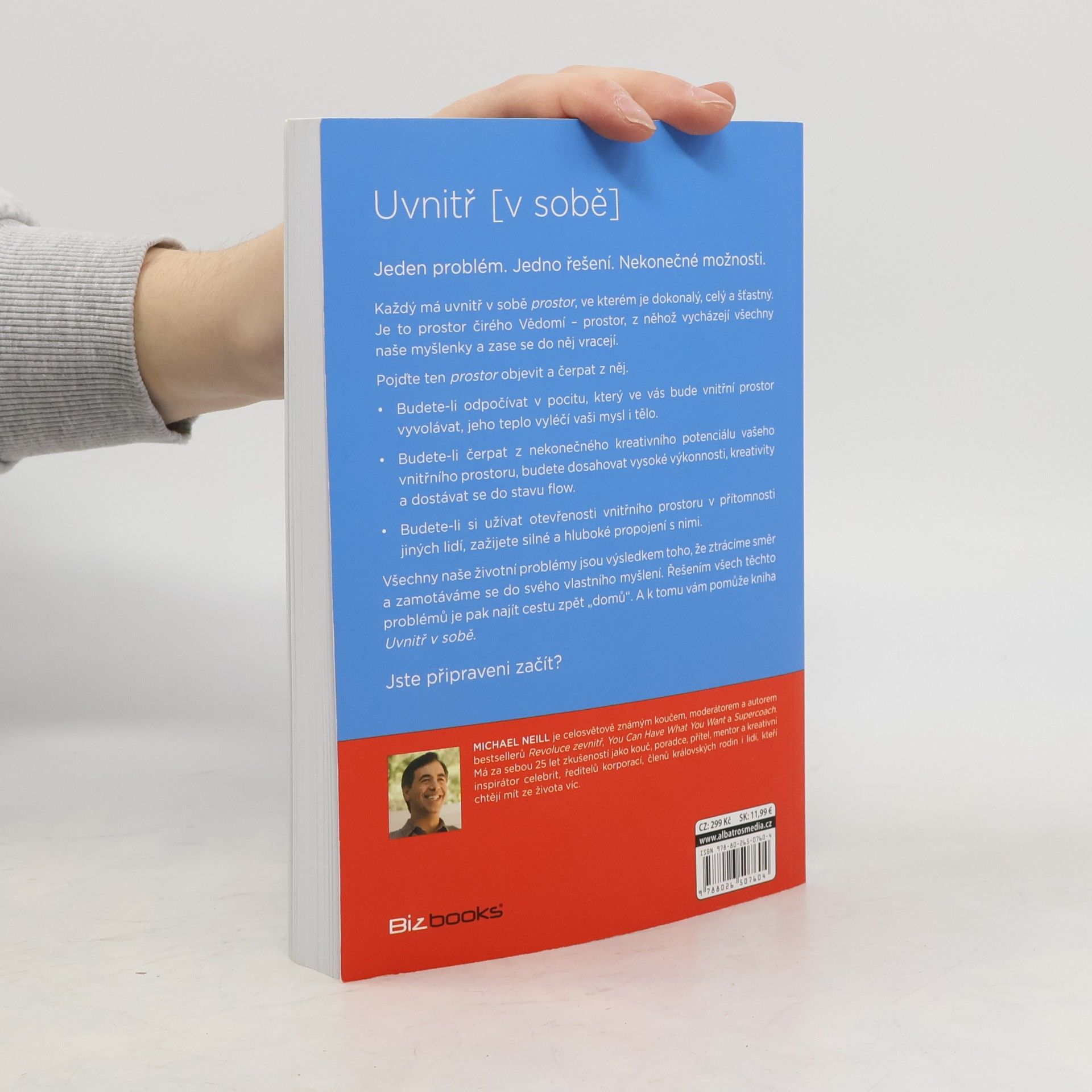 Jeden problém. Jedno řešení. Nekonečné možnosti. Každý má uvnitř v sobě prostor, ve kterém je dokonalý, celý a šťastný. Je to prostor čirého Vědomí – prostor, z něhož vycházejí všechny naše myšlenky a zase se do něj vracejí. Pojďte ten prostor objevit a čerpat z něj. - Když budete odpočívat v pocitu, který ve vás bude vnitřní prostor vyvolávat, jeho teplo vyléčí vaši mysl i tělo. - Když budete čerpat z nekonečného kreativního potenciálu vašeho vnitřního prostoru, budete dosahovat vysoké výkonnosti, kreativity a dostávat se do stavu flow. - Když si budete užívat otevřenosti vnitřního prostoru v přítomnosti jiných lidí, zažijete silné a hluboké propojení s nimi. Všechny naše životní problémy jsou výsledkem toho, že ztrácíme směr a zamotáváme se do svého vlastního myšlení. Řešením všech těchto problémů je pak najít cestu zpět „domů“. A k tomu vám pomůže kniha Uvnitř v sobě. Jste připraveni začít? MICHAEL NEILL je celosvětově známým koučem, moderátorem a autorem bestselerů Revoluce zevnitř, You Can Have What You Want a Supercoach. Má za sebou 25 let zkušeností jako kouč, poradce, přítel, mentor a kreativní inspirátor celebrit, ředitelů korporací, členů královských rodin i lidí, kteří chtějí mít ze života víc.
