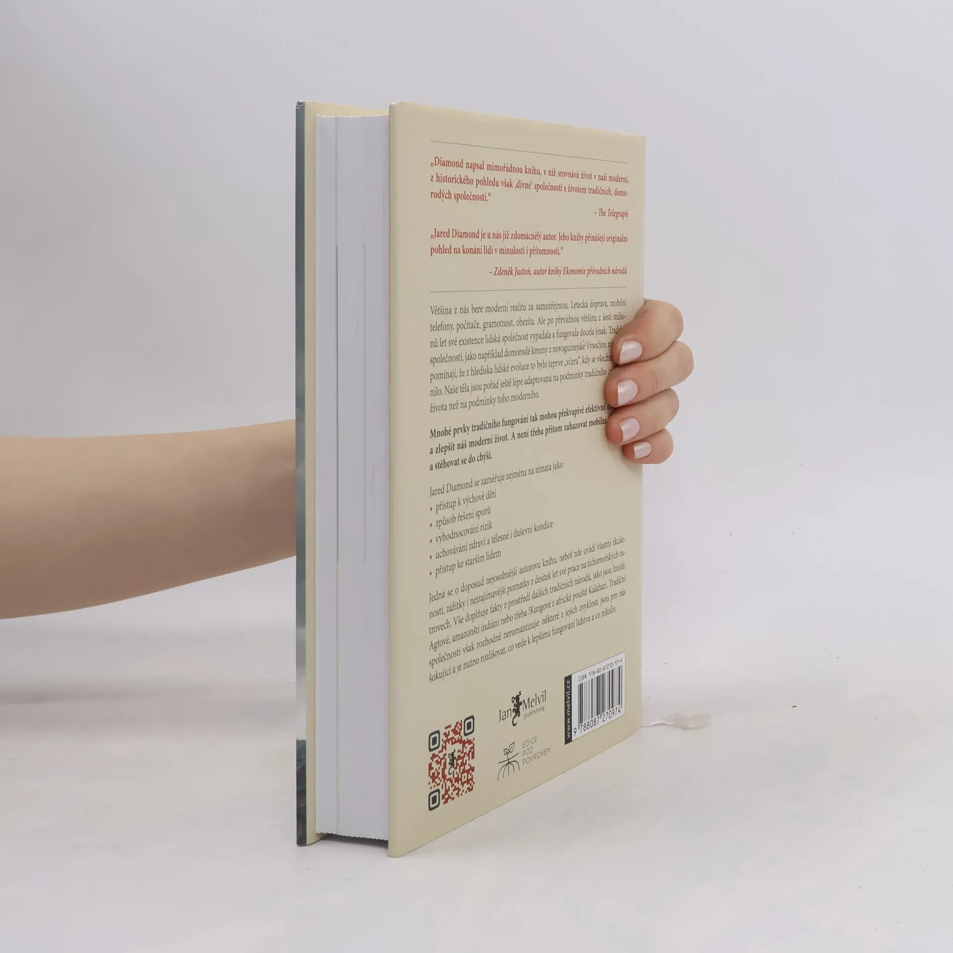 Nositel Pulitzerovy ceny předkládá jedinečné dílo, v němž se zamýšlí nad tím, jak by mohly určité prvky tradičního fungování obohatit a zlepšit náš moderní život. Většina z nás bere moderní realitu za samozřejmou. Letecká doprava, mobilní telefony, počítače, gramotnost, obezita. Ale po převážnou většinu z šesti milionů let své existence lidská společnost vypadala a fungovala docela jinak. Tradiční společnosti, jako například domorodé kmeny z novoguinejské Vysočiny, nám připomínají, že z hlediska lidské evoluce to bylo teprve „včera“, kdy se všechno změnilo. Naše těla jsou pořád ještě lépe adaptovaná na podmínky tradičního způsobu života než na podmínky toho moderního. V KNIZE SE DOČTETE: o přístupech k výchově dětí, o způsobech řešení sporů, o metodách vyhodnocování rizik, o metodách uchovávání zdraví, tělesné i duševní kondice, o přístupu ke starším lidem. Jared Diamond tentokráte čtenářům předkládá vlastní zkušenosti, zážitky i nejzajímavejší poznatky z desítek let své práce na tichomořských ostrovech. Vše doplňuje fakty z prostředí dalších tradičních národu, jako jsou Inuité, Agtové, amazonští indiáni nebo třeba !Kungové z africké pouště Kalahari. Tradiční společnosti však rozhodně neromantizuje: některé z jejich zvyklostí jsou pro nás šokující a je nutno rozlišovat, co vede k lepšímu fungování lidstva a co nikoliv.