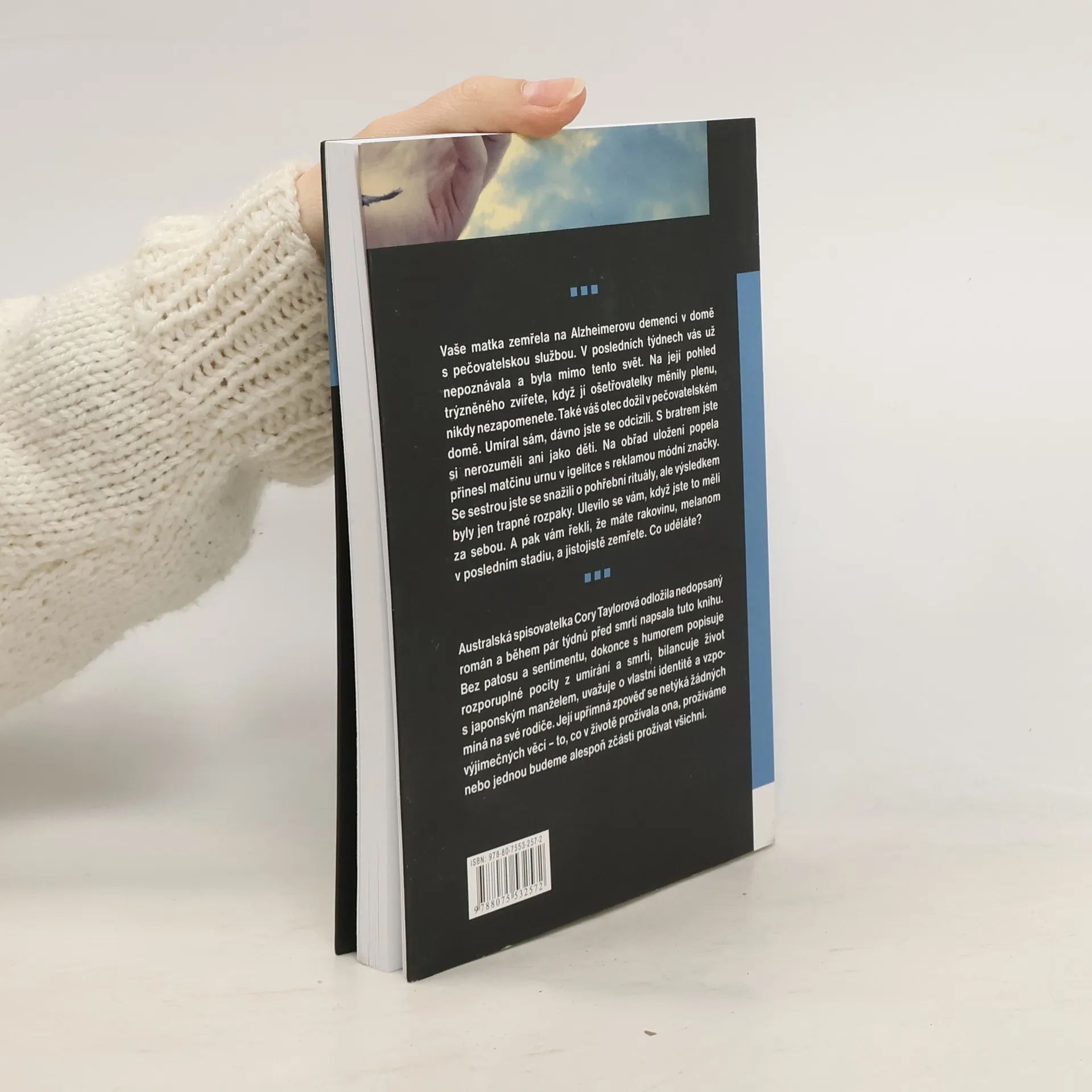 Vaše matka zemřela na Alzheimerovu demenci v domě s pečovatelskou službou. V posledních týdnech vás už nepoznávala a byla mimo tento svět. Na její pohled trýzněného zvířete, když jí ošetřovatelky měnily plenu, nikdy nezapomenete. Také váš otec dožil v pečovatelském domě. Umíral sám, dávno jste se odcizili. S bratrem jste si nerozuměli ani jako děti. Na obřad uložení popela přinesl matčinu urnu v igelitce s reklamou módní značky. Se sestrou jste se snažili o pohřební rituály, ale výsledkem byly jen trapné rozpaky. Ulevilo se vám, když jste to měli za sebou. A pak vám řekli, že máte rakovinu, melanom v posledním stadiu, a jistojistě zemřete. Co uděláte? Australská spisovatelka Cory Taylorová odložila nedopsaný román a během pár týdnů před smrtí napsala tuto knihu. Bez patosu a sentimentu, dokonce s humorem popisuje rozporuplné pocity z umírání a smrti, bilancuje život s japonským manželem, uvažuje o vlastní identitě a vzpomíná na své rodiče. Její upřímná zpověď se netýká žádných výjimečných věcí – to, co v životě prožívala ona, prožíváme nebo jednou budeme alespoň zčásti prožívat všichni.