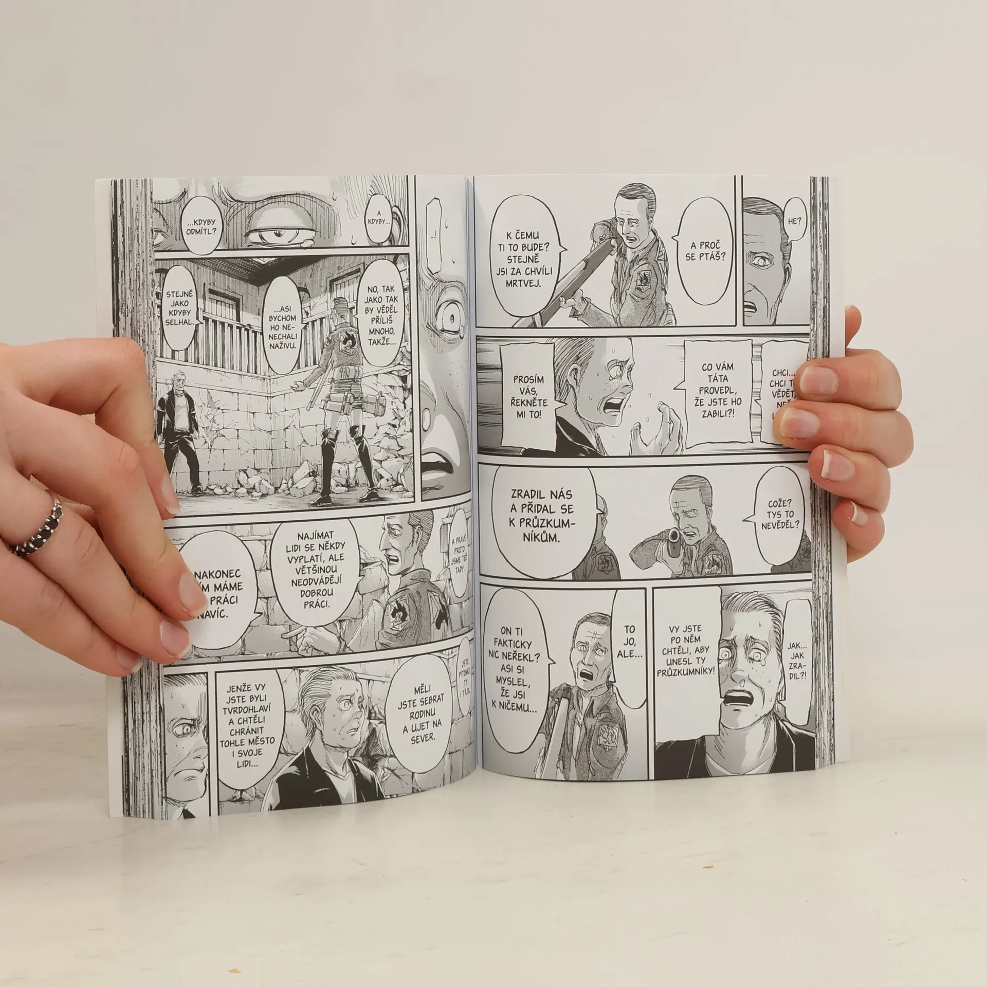 Manga. Zatímco velitel Erwin bojuje s pomocí starých přátel o holý život, Leviho oddíl získává novou posilu a společně se vydávají na pomoc Erenovi a Historii. Ti se mezitím ocitají v podivné společnosti Roda Reisse, jehož role v celém spiknutí zůstává nejasná – jisté je pouze to, že jen on je schopen vrátit Erenovi jeho vzpomínky a rozluštit tak záhadu zmizení jeho otce.