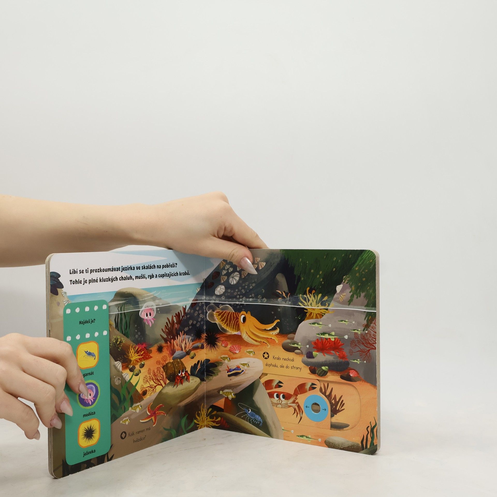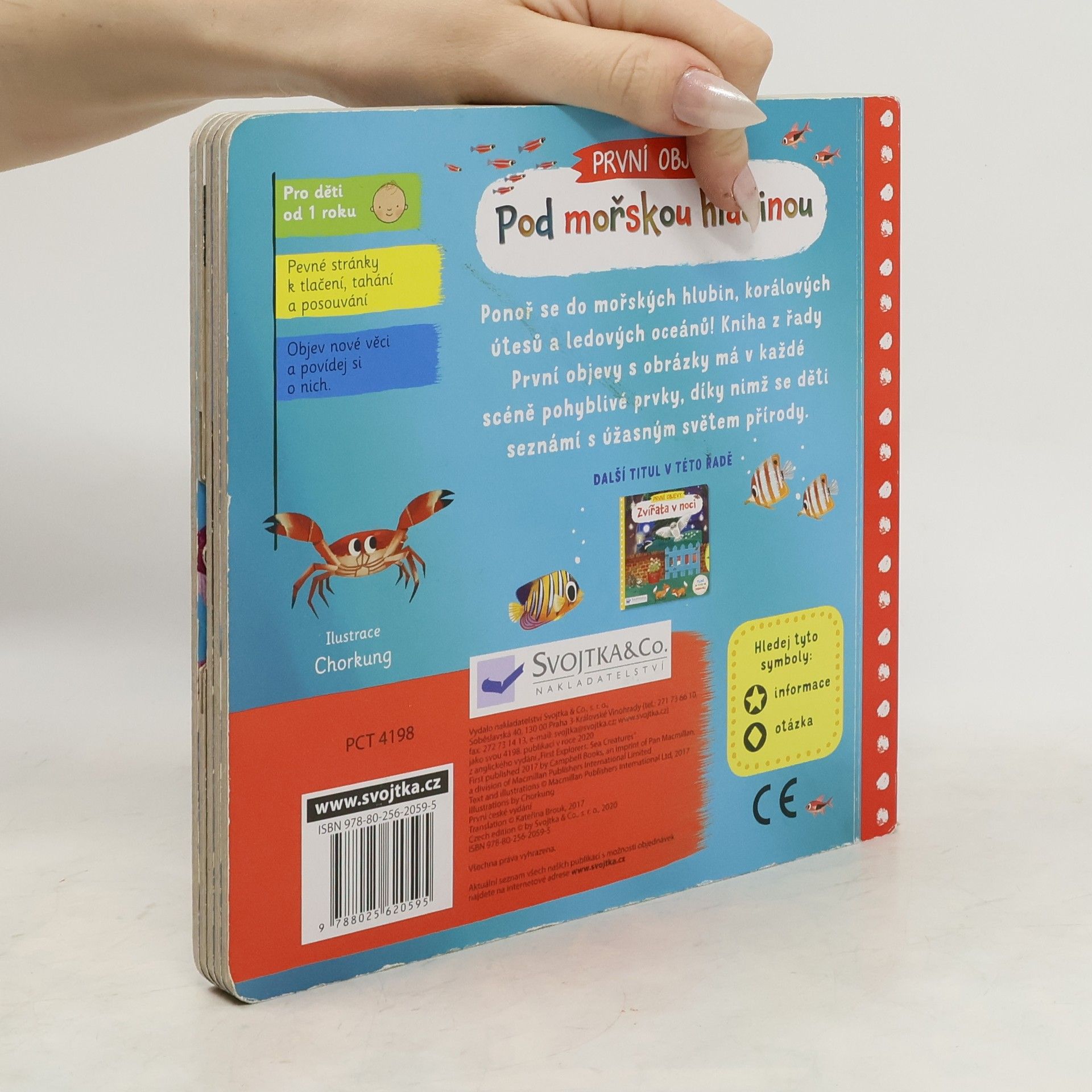 Ponoř se do mořských hlubin, mezi korálové útesy a pod hladinu ledových oceánů! Objevíš úžasně barevné rybky, dravé žraloky a v hlubinách ukryté rejnoky a chobotnice. Otevři knížku a seznam se s nimi! Najdi mořského koníka, který se ukrývá mezi korály, a spolu s tučňáky se sklouzni po ledě. Kniha z řady První objevy s obrázky má v každé scéně pohyblivé prvky, díky nimž se děti seznámí s úžasným světem přírody.