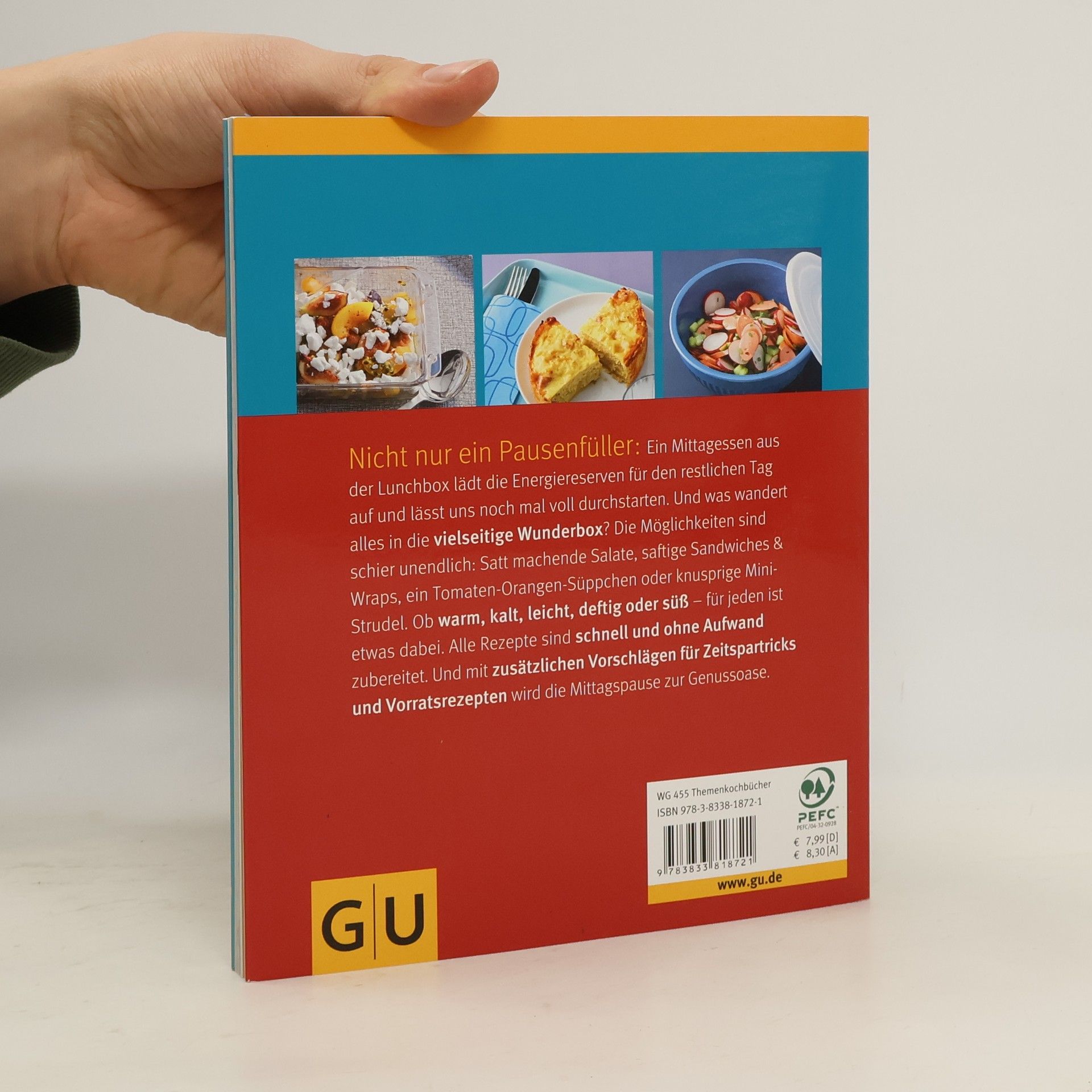 Eine selbst mitgebrachte Brotzeit aus der Brotbox ist längst nicht mehr nur etwas für Kinder. Die Lunchbox ist mittlerweile überall gefragt, wo mittags nicht viel Zeit zum Kochen bleibt. Ein Mittagessen aus der Lunchbox lädt die Energiereserven für den restlichen Tag wieder auf. Ob Wiener-Würstchen-Salat mit Radieschen, Lachs-Tramezzini mit Wasabi-Creme, oder Ministrudel mit Mango und Schweinefleisch - es gibt über 40 abwechslungsreiche, leckere und gesunde Rezepte. Alle lassen sich in weniger als 30 Minuten vor- oder zubereiten und sicher in Folie, stylischem Aluminiumbehälter, Stapelbox, Schraubgläsern etc. in die Pause transportieren. Für einen warmen Mittagstisch lassen sich viele Gerichte im Nu erwärmen, aber sie schmecken kalt genau so gut. So kann nach der der Mittagspause wieder voll durchgestartet werden! Mit Tipps zur Auswahl der richtigen Lunchbox für jede Gelegenheit, Zeitspartricks, und feinen Zusatzrezepten für Aufstriche, Salatdressings und den Vorrat.