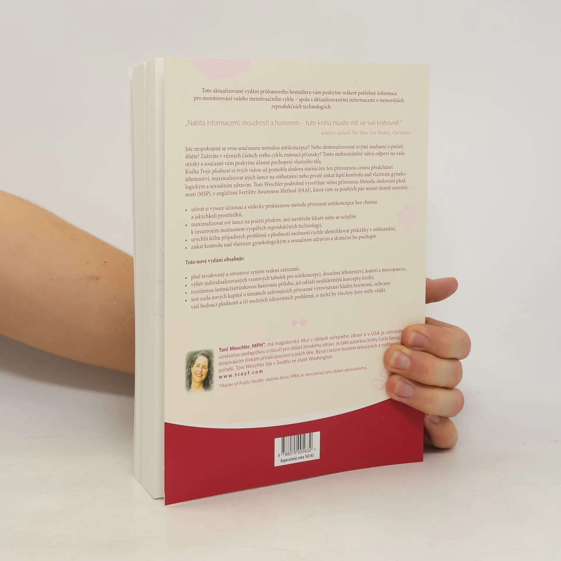 Aktualizované vydání průlomového bestselleru nabízí veškeré potřebné informace pro monitorování menstruačního cyklu a nejnovější reprodukční technologie. Tato kniha je nezbytným zdrojem pro ženy, které nejsou spokojené se svou antikoncepcí, snaží se o početí nebo zažívají matoucí příznaky během cyklu. Pomohla již statisícům žen přirozeně předcházet těhotenství, maximalizovat šance na otěhotnění a získat kontrolu nad gynekologickým a sexuálním zdravím. Toni Weschlerová podrobně vysvětluje Metodu sledování plodnosti (MSP), která umožňuje efektivní a vědecky prokázanou metodu přirozené antikoncepce bez chemie. Tato metoda také pomáhá identifikovat překážky v otěhotnění a urychlit léčbu problémů s plodností. Aktualizované vydání obsahuje plně revidovaný a intuitivní systém vedení záznamů, individualizované vzorové tabulky pro různé životní fáze, rozšířenou barevnou přílohu shrnující klíčové koncepty a šest nových kapitol o přirozeném vyrovnávání hormonů, ochraně plodnosti a důležitých zdravotních problémech, které by měly znát všechny ženy.