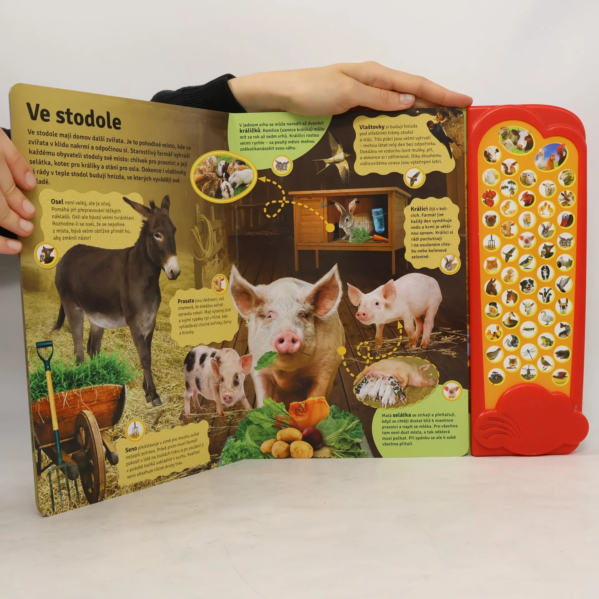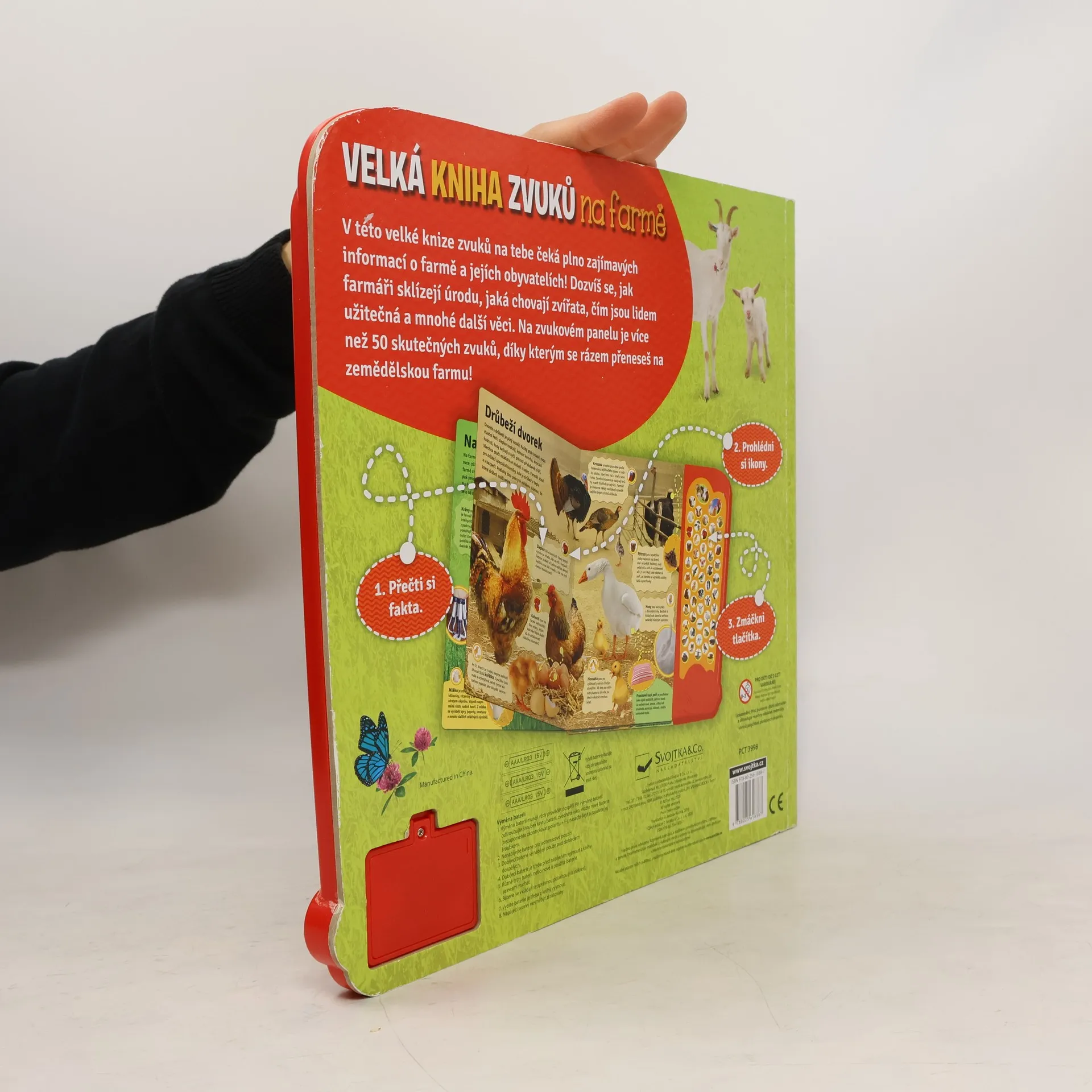 Na farmě je opravdu živo. Chovají tam mnoho zvířat a pořád se něco děje. V této knize najdete mnoho zajímavostí o farmě a jejích obyvatelích! Dozvíte se, jak farmáři sklízejí úrodu, chovají zvířata, čím jsou jednotlivá zvířata lidem užitečná a mnohé další věci. Čtení a prohlížení si můžete zpestřit více než padesáti opravdovými zvuky. Na každé stránce najdete plno fotografií ze života na farmě. U jednotlivých výjevů jsou obrázkové ikony a zajímavá fakta, a pokud na zvukovém panelu najdete stejný obrázek a zmáčknete jej, rázem se ocitnete uprostřed hlučné farmy. Pobavte se s touto velkou knihou zvuků a naučte se o životě farmě něco nového!