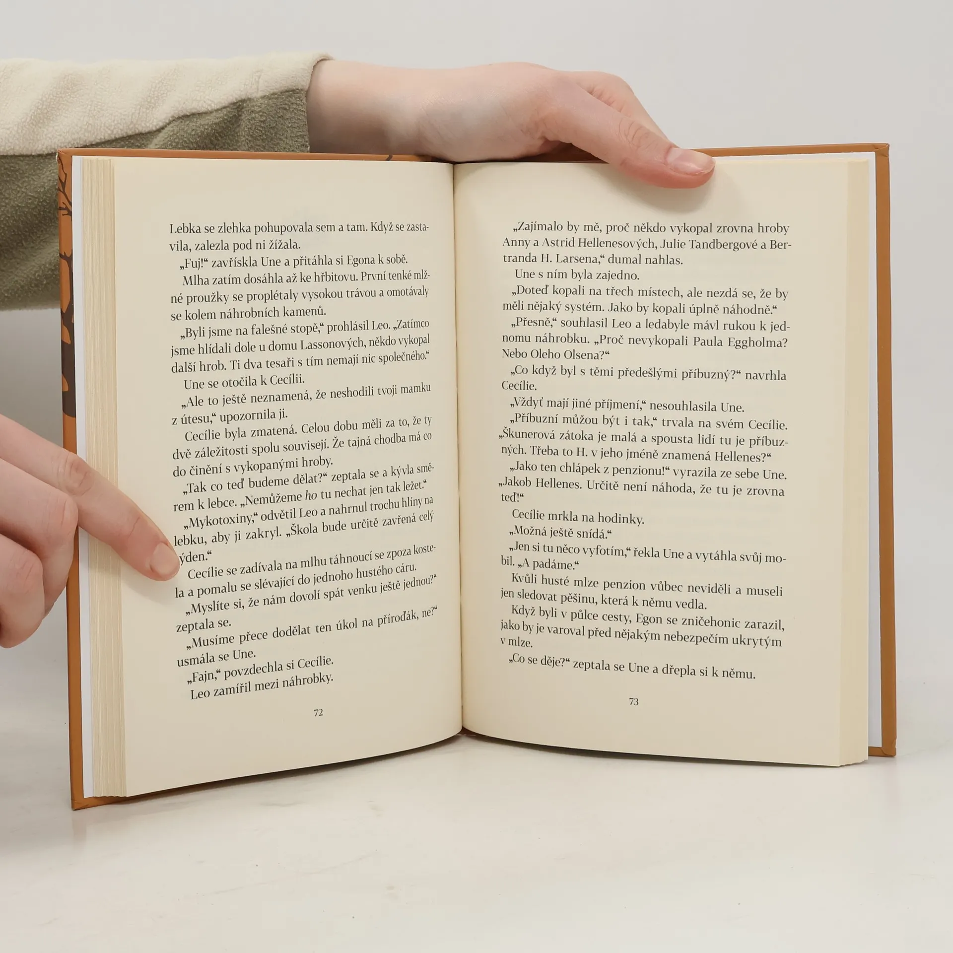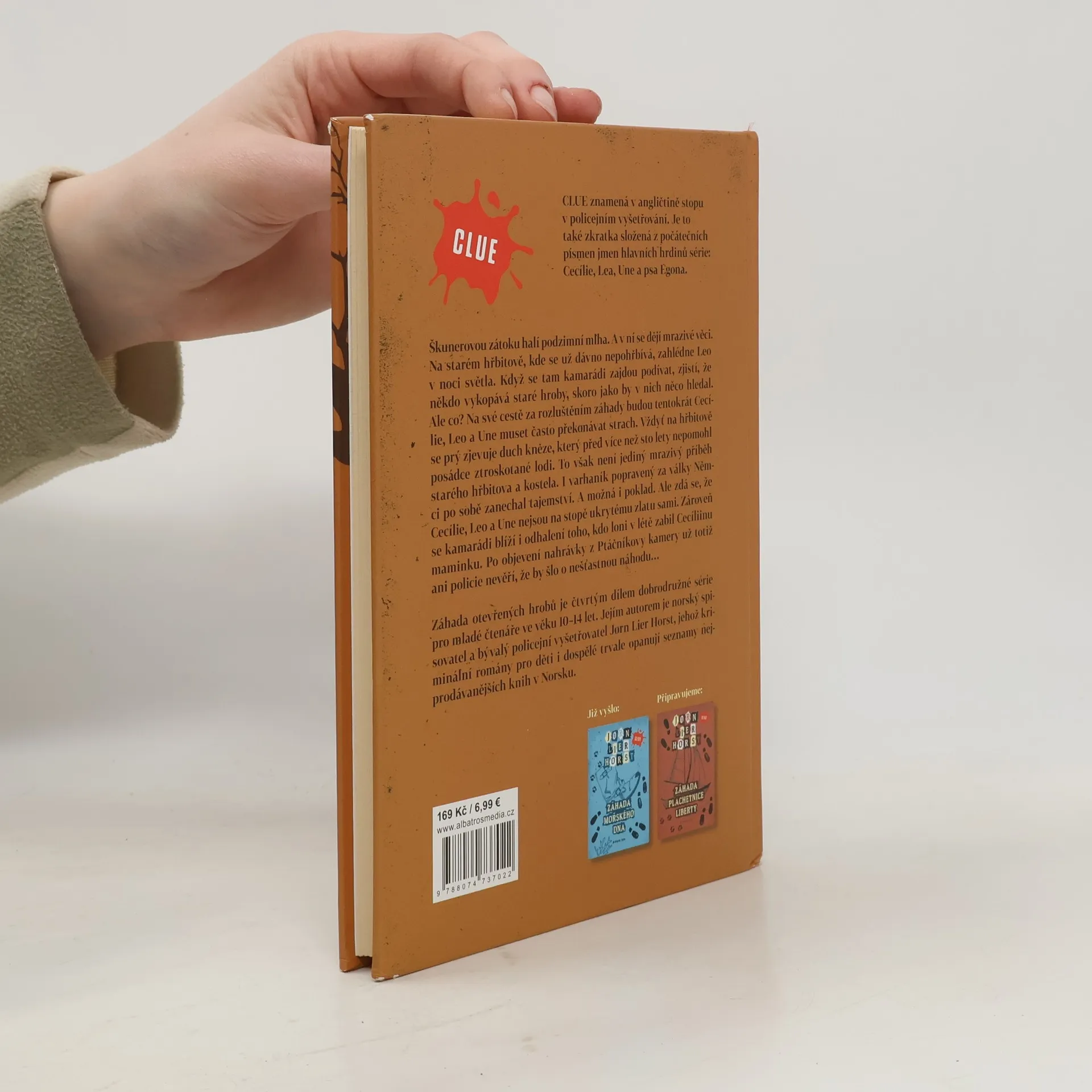 Cecílie, Leo a Une a pes Egon na stopě záhadného pokladu! Škunerovou zátoku halí podzimní mlha. A v ní se dějí mrazivé věci. Na starém hřbitově, kde se už dávno nepohřbívá, zahlédne Leo v noci světla. Když se tam kamarádi zajdou podívat, zjistí, že někdo vykopává staré hroby, skoro jako by v nich něco hledal. Ale co? Na své cestě za rozluštěním záhady budou tentokrát Cecílie, Leo a Une muset často překonávat strach. Vždyť na hřbitově se prý zjevuje duch kněze, který před více než sto lety nepomohl posádce ztroskotané lodi. To však není jediný mrazivý příběh starého hřbitova a kostela. I varhaník popravený za války Němci po sobě zanechal tajemství. A možná i poklad. Ale zdá se, že Cecílie, Leo a Une nejsou na stopě ukrytému zlatu sami. Zároveň se kamarádi blíží i odhalení toho, kdo loni v létě zabil Cecíliinu maminku. Po objevení nahrávky z Ptáčníkovy kamery už totiž ani policie nevěří, že by šlo o nešťastnou náhodu...