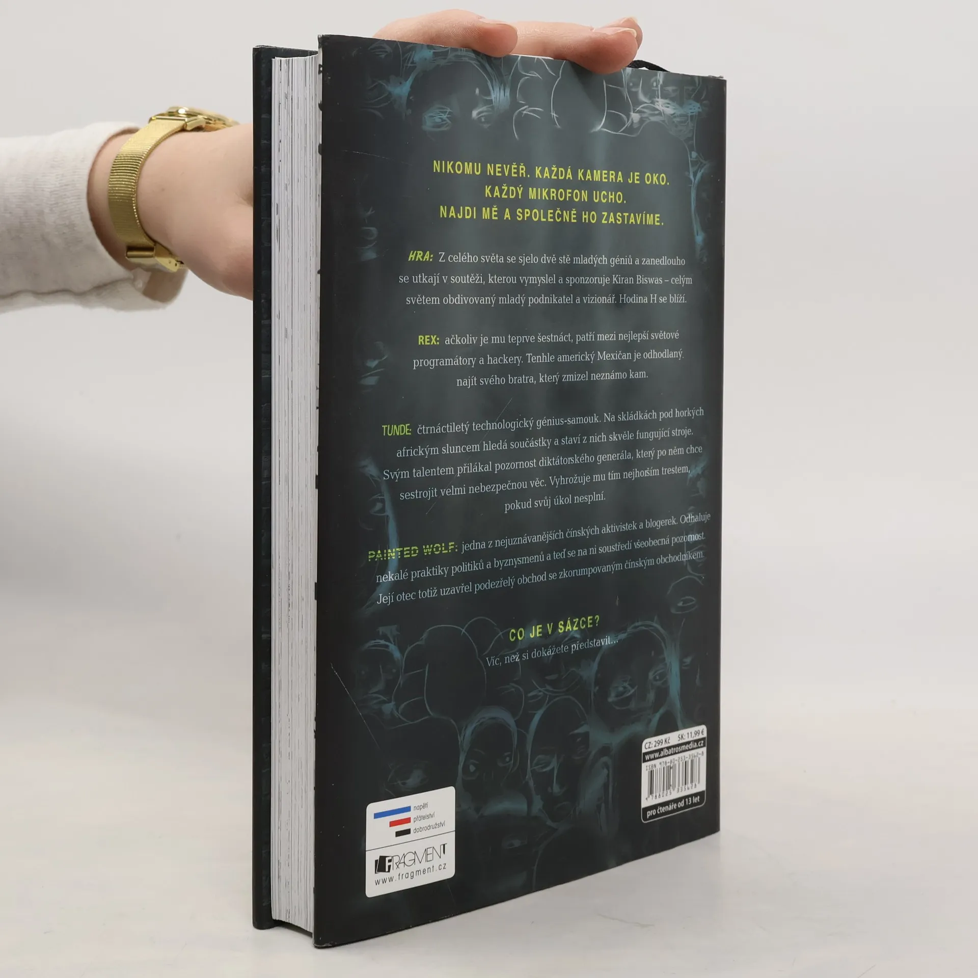 Nikomu nevěř. Každá kamera je oko. Každý mikrofon ucho. Najdi mě a společně ho zastavíme. Hra: Z celého světa se sjelo dvě stě mladých géniů a zanedlouho se utkají v soutěži, kterou vymyslel a sponzoruje Kiran Biswas – celým světem obdivovaný mladý podnikatel a vizionář. Hodina H se blíží. Hráči: Rex – ačkoliv je mu teprve šestnáct, patří mezi nejlepší světové programátory a hackery. Tenhle americký Mexičan je odhodlaný najít svého bratra, který zmizel neznámo kam. Tunde – čtrnáctiletý technologický génius-samouk. Na skládkách pod horkých africkým sluncem hledá součástky a staví z nich skvěle fungující stroje. Svým talentem přilákal pozornost diktátorského generála, který po něm chce sestrojit velmi nebezpečnou věc. Vyhrožuje mu tím nejhorším trestem, pokud svůj úkol nesplní. Barevná vlčice – jedna z nejuznávanějších čínských aktivistek a blogerek. Odhaluje nekalé praktiky politiků a byznysmenů a teď se na ni soustředí všeobecná pozornost. Její otec totiž uzavřel podezřelý obchod se zkorumpovaným čínským obchodníkem. Co je v sázce? Víc, než si dokážete představit...