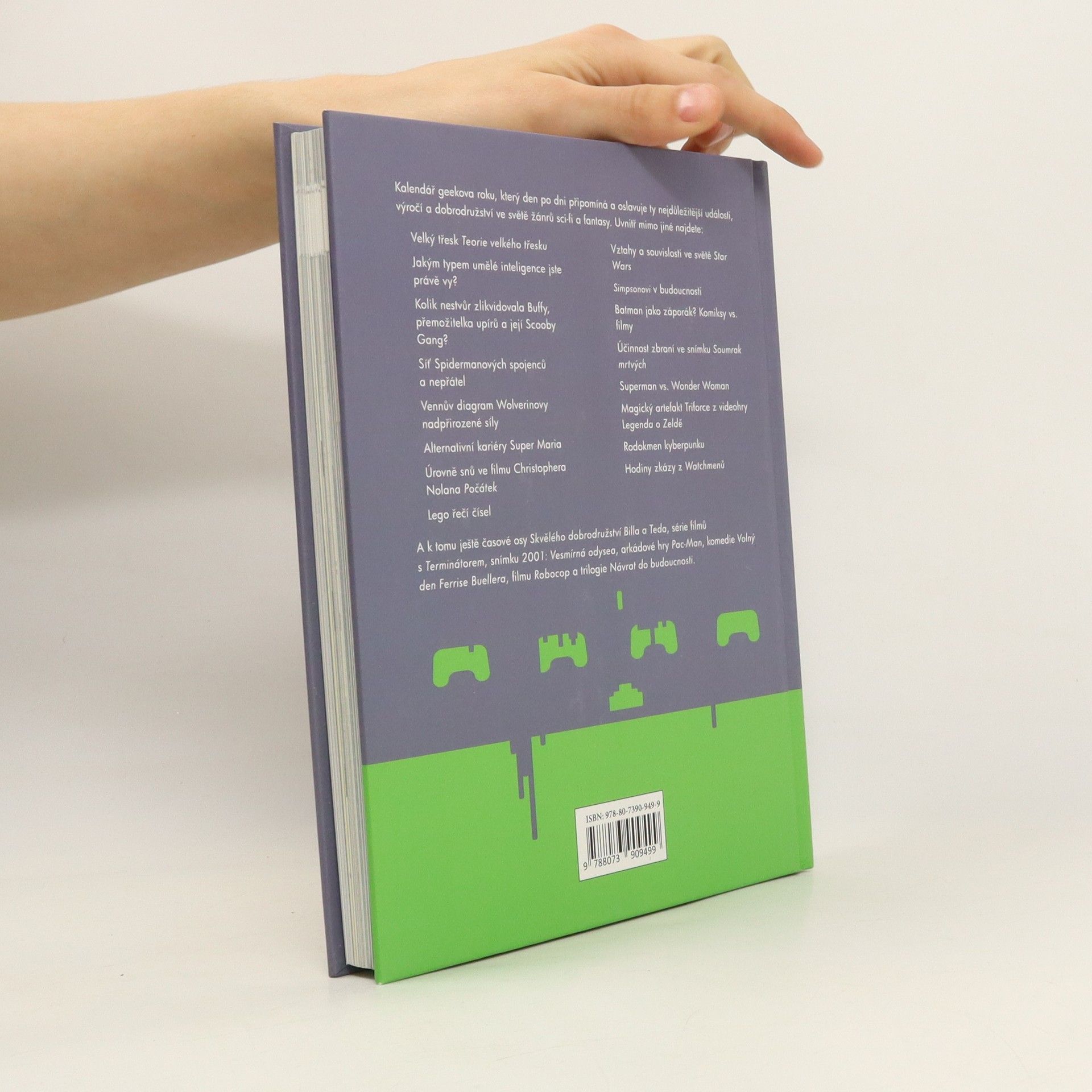 Kalendář geekova roku, který den po dni připomíná a oslavuje ty nejdůležitější události výročí a dobrodružství ve světě žánrů sci-fi a fantasy. Uvnitř mimo jiné najdete: Velký třesk Teorie velkého třesku Jakým typem umělé inteligence jste právě vy? Kolik nestvůr zlikvidovala Buffy, přemožitelka upírů a její Scooby Gang? A k tomu ještě časové osy Skvělého dobrodružství Billa a Teda, série filmů s Terminátorem, snímku 2001: Vesmírná odysea, arkádové hry Pac-Man, komedie Volný den Ferrise Buellera, filmu Robocop a trilogie Návrat do budoucnosti.