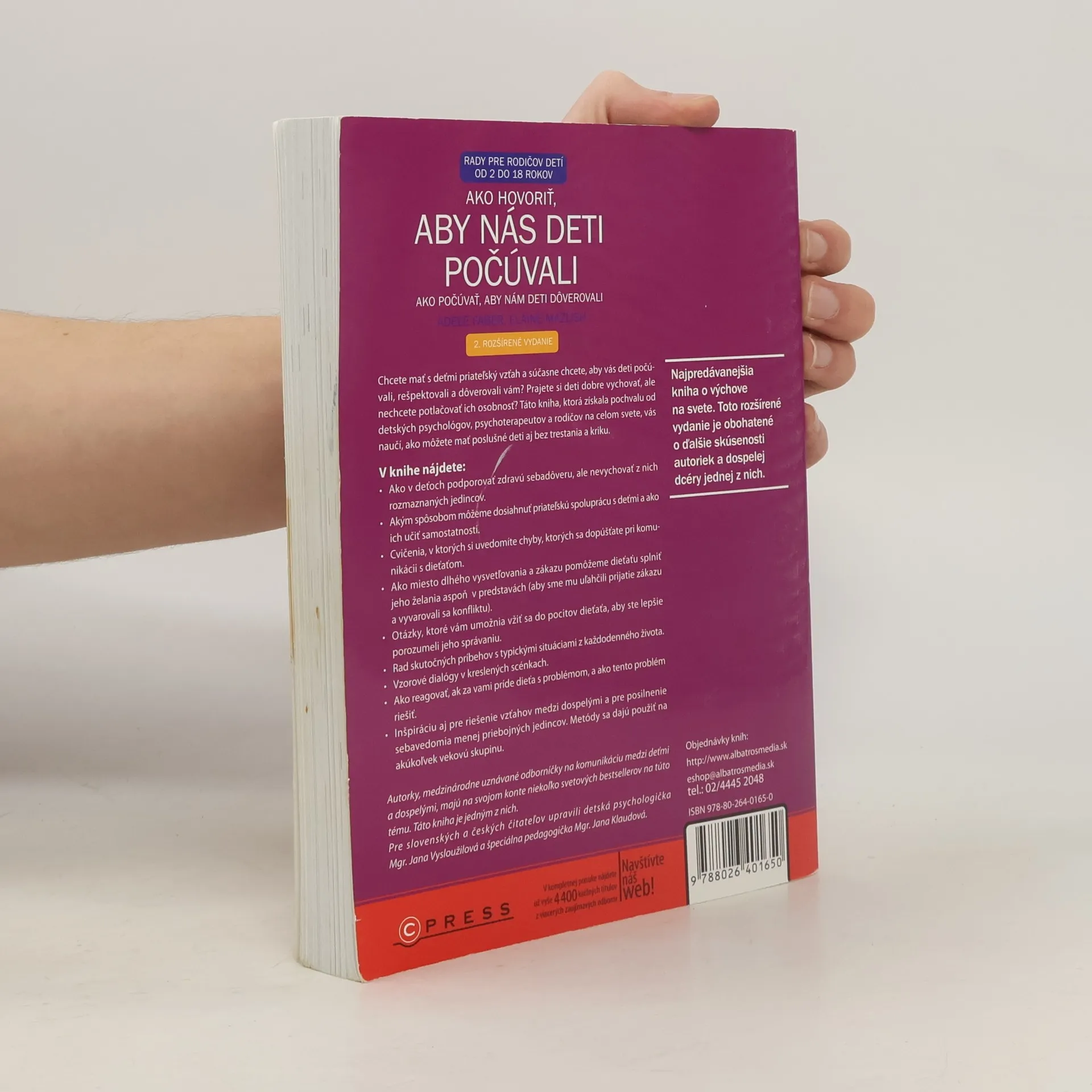 Adele Faber a Elaine Mazlish, uznávané psychologičky a odborníčky na komunikáciu, vás v tomto medzinárodnom bestselleri naučia krok za krokom techniky, ktoré vám pomôžu zlepšiť a obohatiť vzťahy s deťmi. V knihe sa nachádzajú nové postrehy a návrhy, ako aj časom preverené metódy k riešeniu spoločných problémov. Taktiež v nej môžeme nájsť inovatívne spôsoby ako sú napríklad: zapojiť ochotnú spoluprácu vášho dieťaťa určiť si pevné hranice a udržiavať dobrú vôľu používať alternatívy namiesto trestu, ktoré podporujú sebadisciplínu pochopiť rozdiel medzi ústretovou a nevhodnou pochvalou vyriešiť rodinné konflikty mierovou cestou pomôcť dieťaťu dosiahnuť pozitívne vnímania seba samého ako sa vyrovnať s negatívnymi pocitmi svojho dieťaťa, ako je frustrácia, hnev a sklamanie Kniha je číslo jedna medzi príručkami o vzťahu rodičov k deťom, pretože vzťahy s deťmi všetkých vekových kategórií robí menej stresujúce a viac obohacujúce a pomáha budovať základy pre trvalé vzťahy.