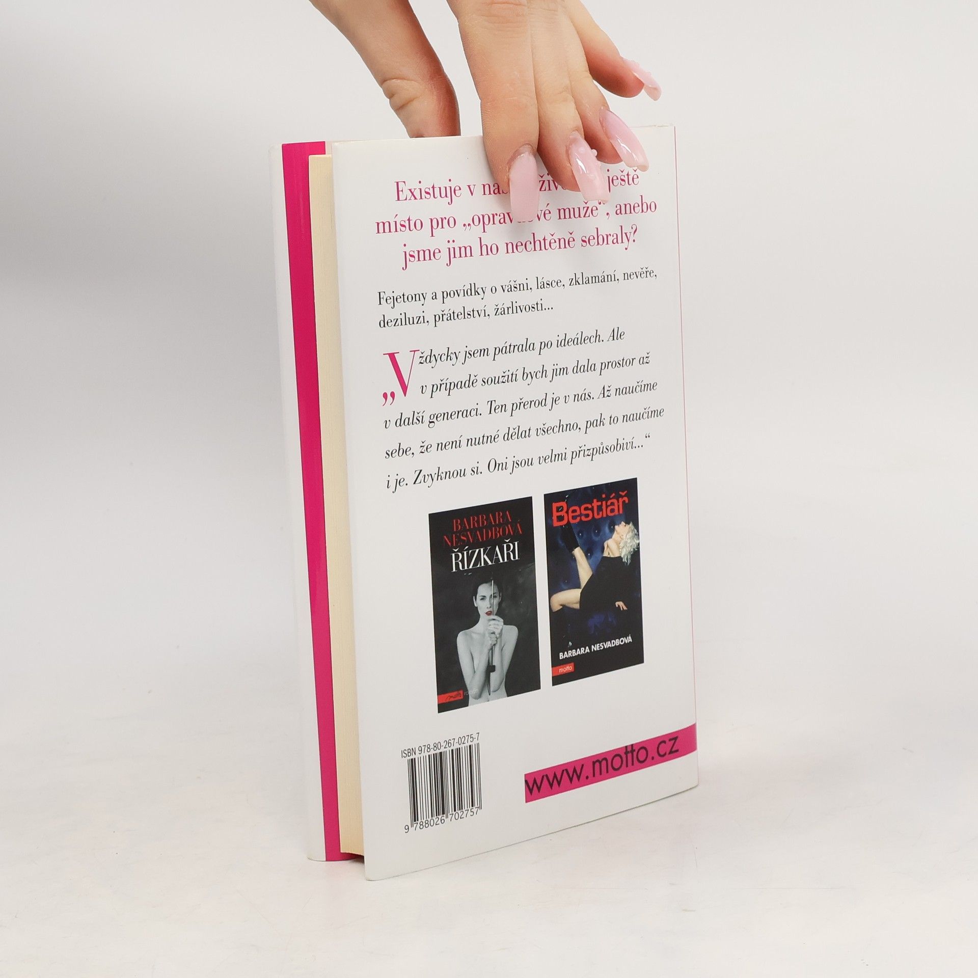 Existuje v našich životech ještě místo pro „opravdové muže“, a nebo jsme jim ho nechtěně sebraly? Fejetony a povídky Barbary Nesvadbové o vášni, lásce, zklamání, nevěře, deziluzi, zášti, přátelství i žárlivosti.