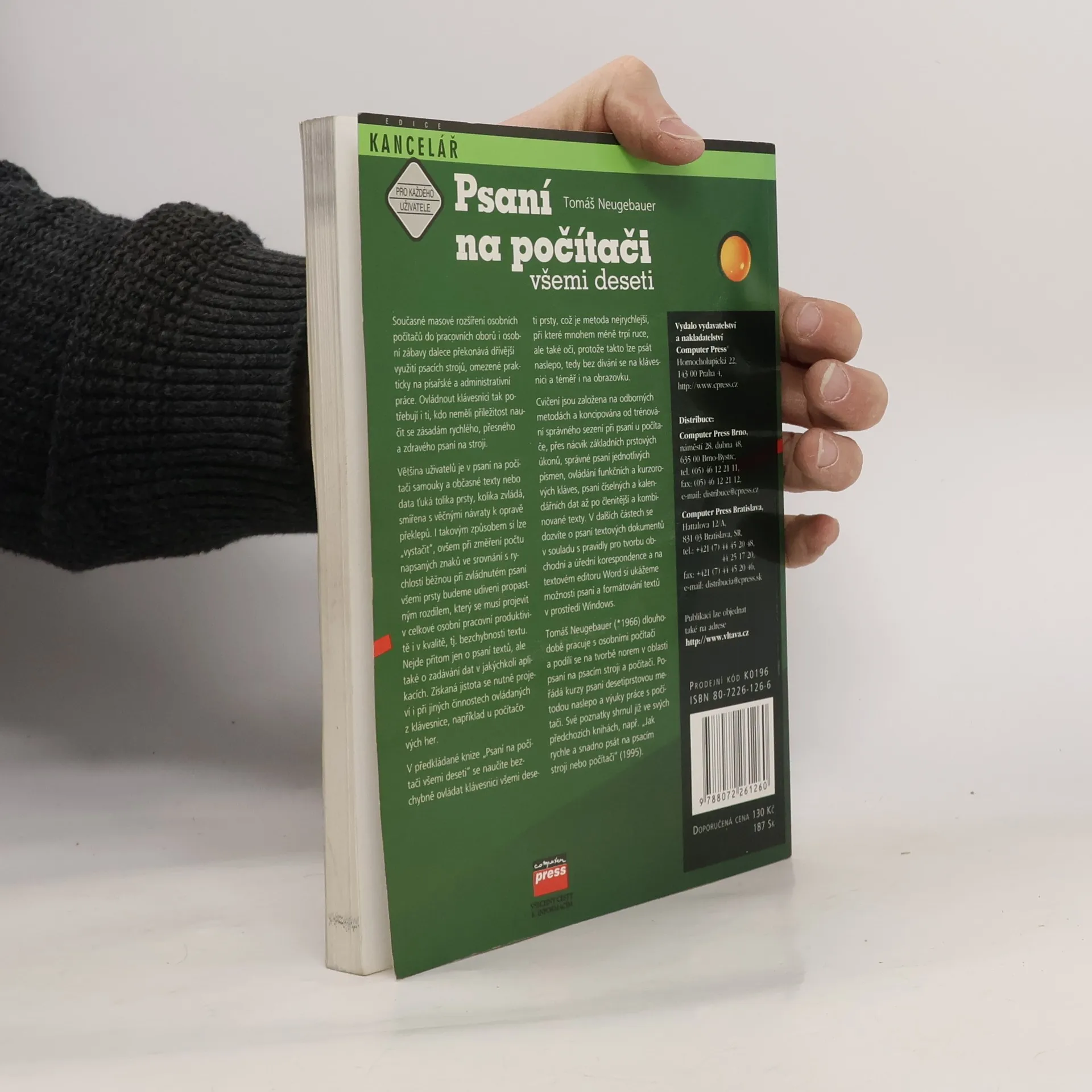 V předkládané knize „Psaní na počítači všemi deseti“ se naučíte bezchybně ovládat klávesnici všemi deseti prsty, což je metoda nejrychlejší, při které také mnohem méně trpí ruce, ale i oči, protože takto lze psát naslepo, tedy bez dívání se na klávesnici a téměř i na obrazovku. Cvičení jsou založena na odborných metodách a koncipována od trénování správného sezení při psaní u počítače, přes nácvik základních prstových úkonů, správné psaní jednotlivých písmen, ovládání funkčních a kurzorových kláves, psaní číselných a kalendářních dat až po členitější a kombinované texty. V dalších částech se dozvíte o psaní textových dokumentů v souladu s pravidly pro tvorbu obchodní a úřední korespondence a na textovém editoru Word si ukážeme možnosti psaní a formátování textů v prostředí Windows.
