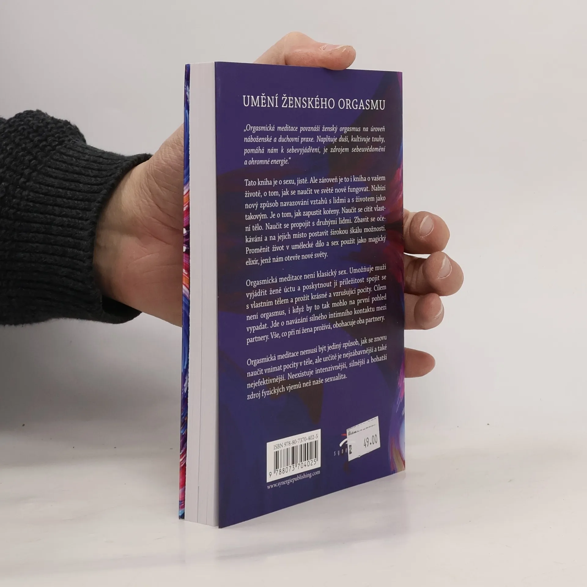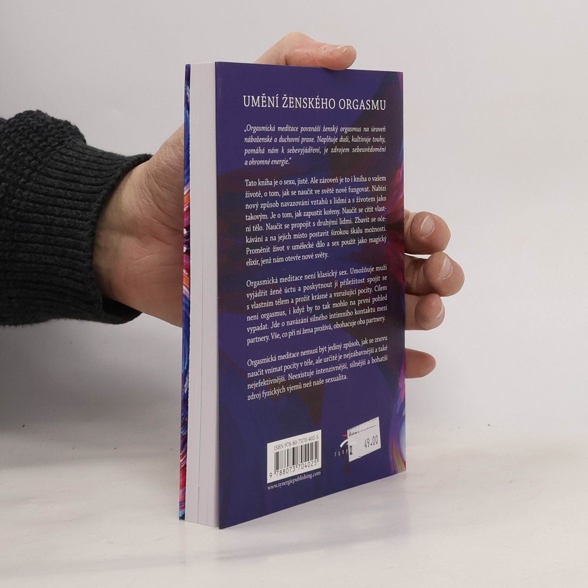 „Orgasmická meditace povznáší ženský orgasmus na úroveň náboženské a duchovní praxe. Naplňuje duši, kultivuje touhy, pomáhá nám k sebevyjádření, je zdrojem sebeuvědomění a ohromné energie.“ Tato kniha je o sexu, jistě. Ale zároveň je to i kniha o vašem životě, o tom, jak se naučit ve světě nově fungovat. Nabízí nový způsob navazování vztahů s lidmi a s životem jako takovým. Je o tom, jak zapustit kořeny. Naučit se cítit vlastní tělo. Naučit se propojit s druhými lidmi. Zbavit se očekávání a na jejich místo postavit širokou škálu možností. Proměnit život v umělecké dílo a sex použít jako magický elixír, jenž nám otevře nové světy. Orgasmická meditace není klasický sex. Umožňuje muži vyjádřit ženě úctu a poskytnout jí příležitost spojit se s vlastním tělem a prožít krásné a vzrušující pocity. Cílem není orgasmus, i když by to tak mohlo na první pohled vypadat. Jde o navázání silného intimního kontaktu mezi partnery. Vše, co při ní žena prožívá, obohacuje oba dva. Orgasmická meditace nemusí být jediný způsob, jak se znovu naučit vnímat pocity v těle, ale určitě je nejzábavnější a také nejefektivnější. Neexistuje intenzivnější, silnější a bohatší zdroj fyzických vjemů než naše sexualita.