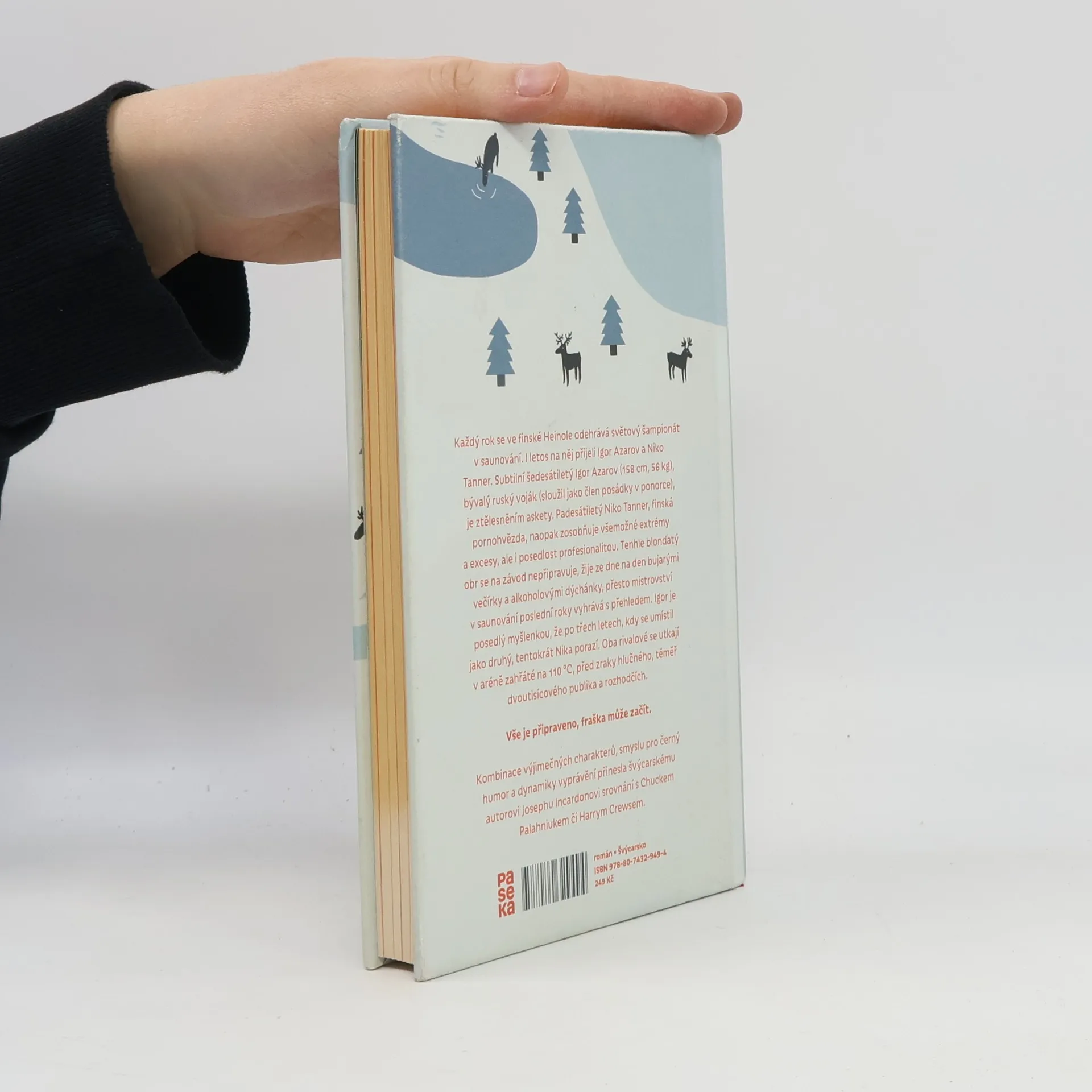Každý rok se ve finské Heinole odehrává světový šampionát v saunování. Letos na něj přijeli i dva hrdinové tohoto románu, kteří působí jako vzájemné protiklady. Subtilní šedesátiletý Igor Azarov (158 cm, 56 kg), bývalý ruský voják (sloužil jako člen posádky v ponorce), je ztělesnění askety. Padesátiletý Niko Tanner, finská pornohvězda, naopak zosobňuje všemožné extrémy a excesy, ale i posedlost profesionální kvalitou. Tenhle blonďatý obr se na závod nepřipravuje, žije ze dne na den bujarými večírky a alkoholovými dýchánky, přesto mistrovství v saunování poslední roky vyhrává s přehledem. Igor je posedlý myšlenkou, že po třech letech, kdy se umístil jako druhý, tentokrát Nika porazí. Oba rivalové se utkají v aréně zahřáté na 110° Celsia, před zraky hlučného, téměř dvoutisícového publika a rozhodčích. Vše je připraveno, fraška může začít.