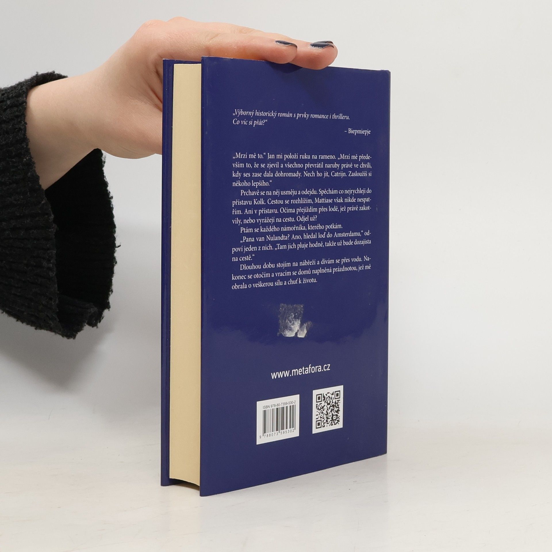 Příběh jako z obrazů holandských mistrů, připomínající Dívku s perlou. Poutavý historický román o vzniku delftské modré keramiky. Holandsko druhé poloviny 17. století. Výtvarně nadaná Catrijn se po smrti svého o dost staršího manžela vydává z rodné vesnice poblíž Alkmaaru žít do města, jak vždy toužila. Získá místo hospodyně u bohaté rodiny v Amsterdamu, kde v té době žije a tvoří i Rembrandt van Rijn. Catrijn je zde šťastná, záhy je však kvůli stínu z minulosti nucena dobré místo opustit a odejít až do vzdáleného Delftu. Přijme nabídku pracovat jako malířka v keramické dílně a podílí se na zrození věhlasné holandské fajánse. Najde tu blízké přátele, mezi jinými i Jana Vermeera, a také svou životní lásku. Přicházejí však těžké časy. V Delftu dojde k obrovskému výbuchu muničního skladu, který v roce 1654 zničil velkou část města. A vzápětí do příběhu razantně vstoupí morová rána, která ve stejném roce postihla většinu země a jež navždy změní i život Catrijn.