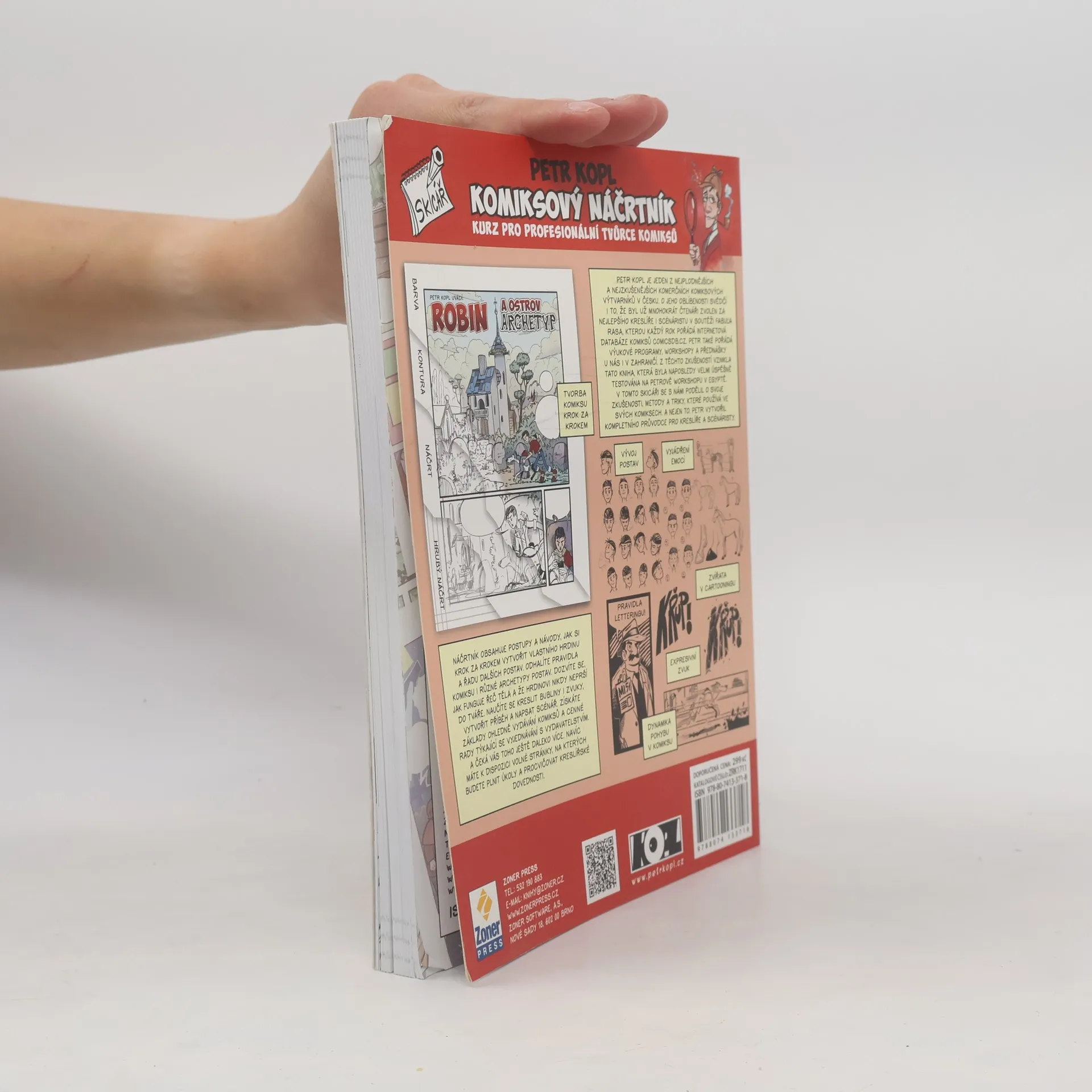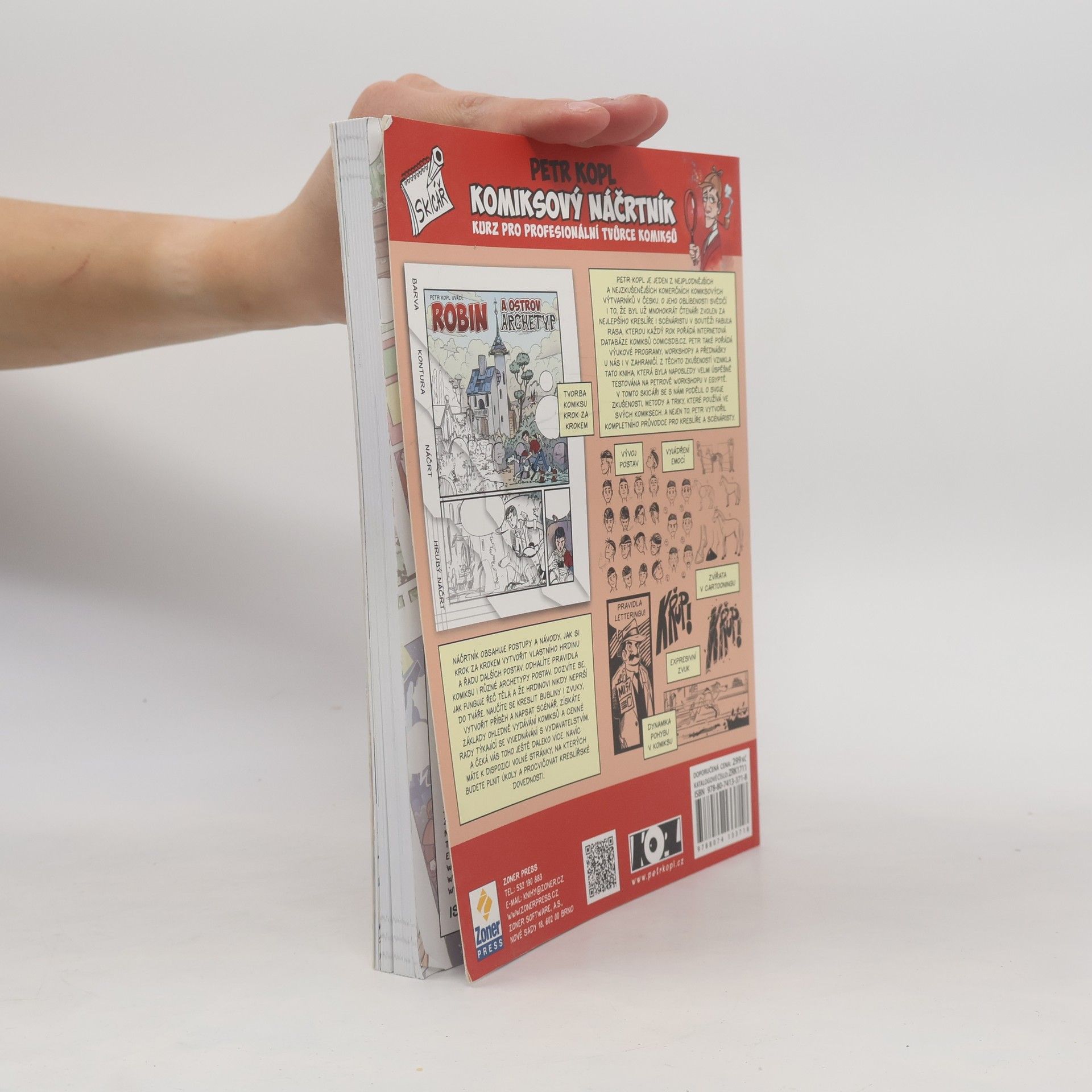 Staňte se úspěšnými tvůrci komiksu pod vedením zkušeného komiksového výtvarníka Petra Kopla. Odhalí vám všechna tajemství tohoto specifického výtvarného odvětví. Od toho, jak vytvořit vlastního hrdinu, přes kreslení různých dalších postav, zvířat a prostředí, bublin, psaní textů, textové efekty, rozvržení panelů, barvení až po vytvoření kompletního komiksu včetně scénáře a to, jak jednat s vydavatelem a co vše si předtím připravit. Komiksový náčrtník, jak už název napovídá, slouží k tomu, abyste do něj kreslili. Autor si pro vás připravil řadu úkolů, které budete průběžně vypracovávat a ihned procvičovat na volné listy speciálně uzpůsobené pro vaše kresby. Postupně si tak osvojíte všechny schopnosti potřebné pro úspěšné zvládnutí komiksové tvorby. Náčrtník je určený začátečníkům i profesionálům, mladým i starým, všem, co rádi kreslí, mají rádi komiks nebo tvorbu Petra Kopla. Pokud si s vypracováním úkolů nebudete vědět rady, můžete si pomocí odkazu, který najdete uvnitř knihy, stáhnout ukázky toho, jak úkoly vypracoval sám autor.