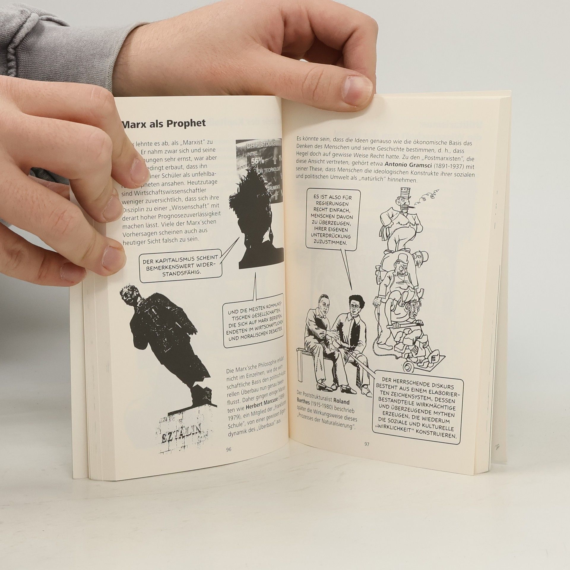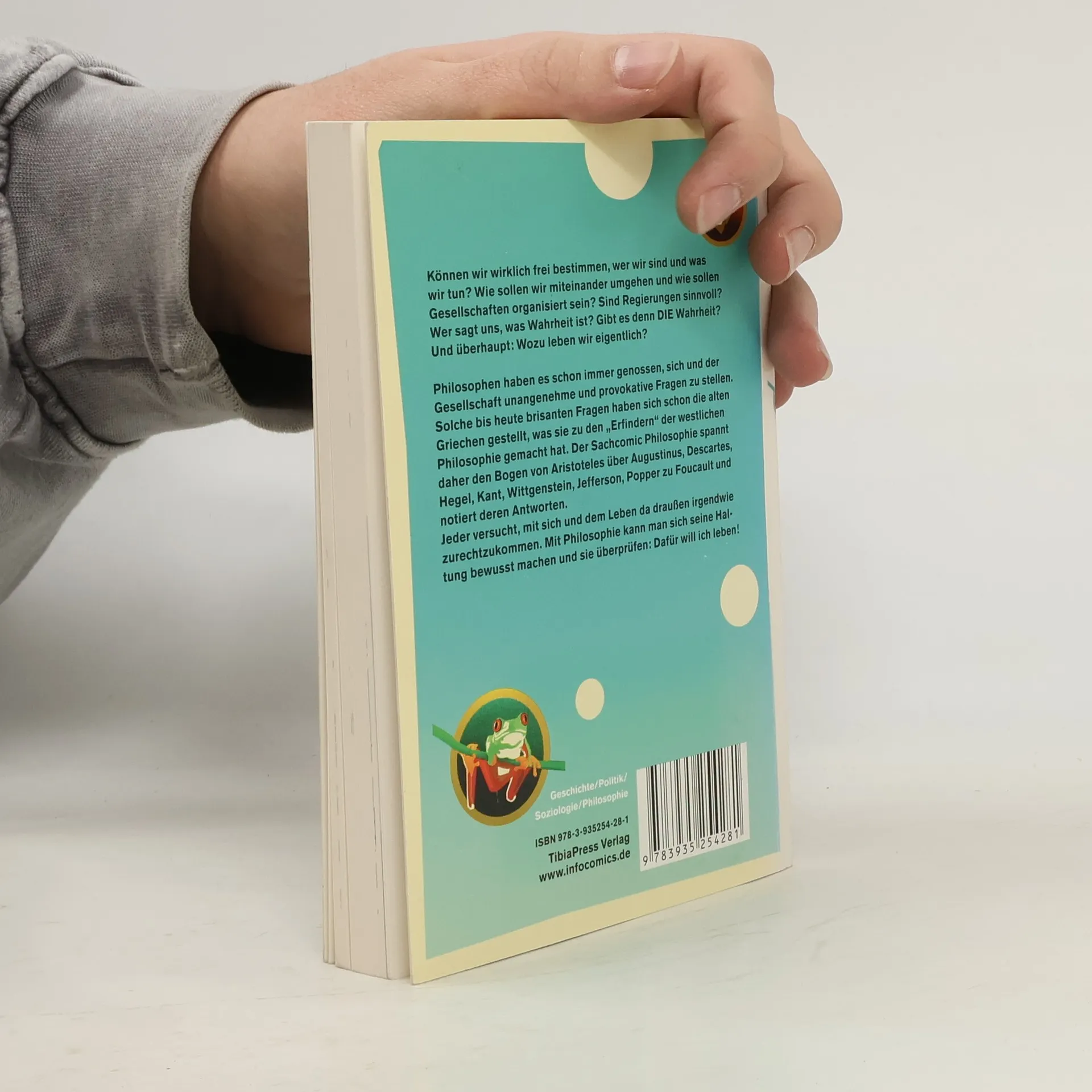 Hilft menschliche Sprache bei der Wahrheitsfindung, wenn ja wie? Sind Regierungen sinnvoll? Können wir wirklich frei bestimmen, wer wir sind und was wir tun? Wer sagt uns was Wahrheit ist? Was ist das Besondere am menschlichen Geist und Bewusstsein? Wie sollen wir miteinander umgehen und wie sollen Gesellschaften organisiert sein? Und überhaupt: Wozu leben wir eigentlich? Philosophen haben es schon immer genossen sich und der Gesellschaft unangenehme und provokative Fragen zu stellen. Diese zeitlosen und nach wie vor brisanten Fragen haben sich schon die alten Griechen gestellt, was sie zu den „Erfindern“ der westlichen Philosophie gemacht hat. Das Sachcomic Philosophie spannt daher den Bogen von Aristoteles über Augustinus, Descartes, Hegel, Kant, Wittgenstein, Jefferson, Karl Popper zu Foucault und notiert deren Antworten. Irgendeine Einstellung zu sich und dem Leben da draußen hat jeder. Hier kann man sie sich bewußt machen und sie überprüfen: dafür will ich leben!
