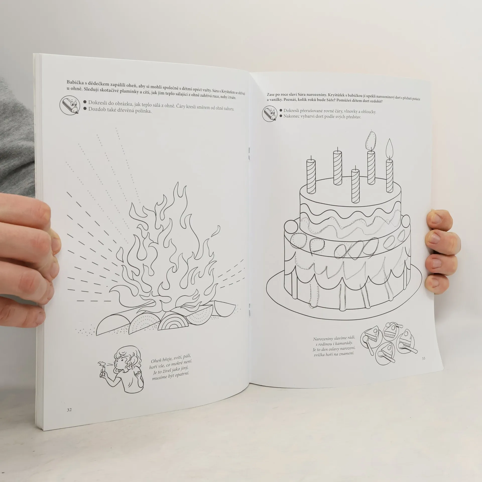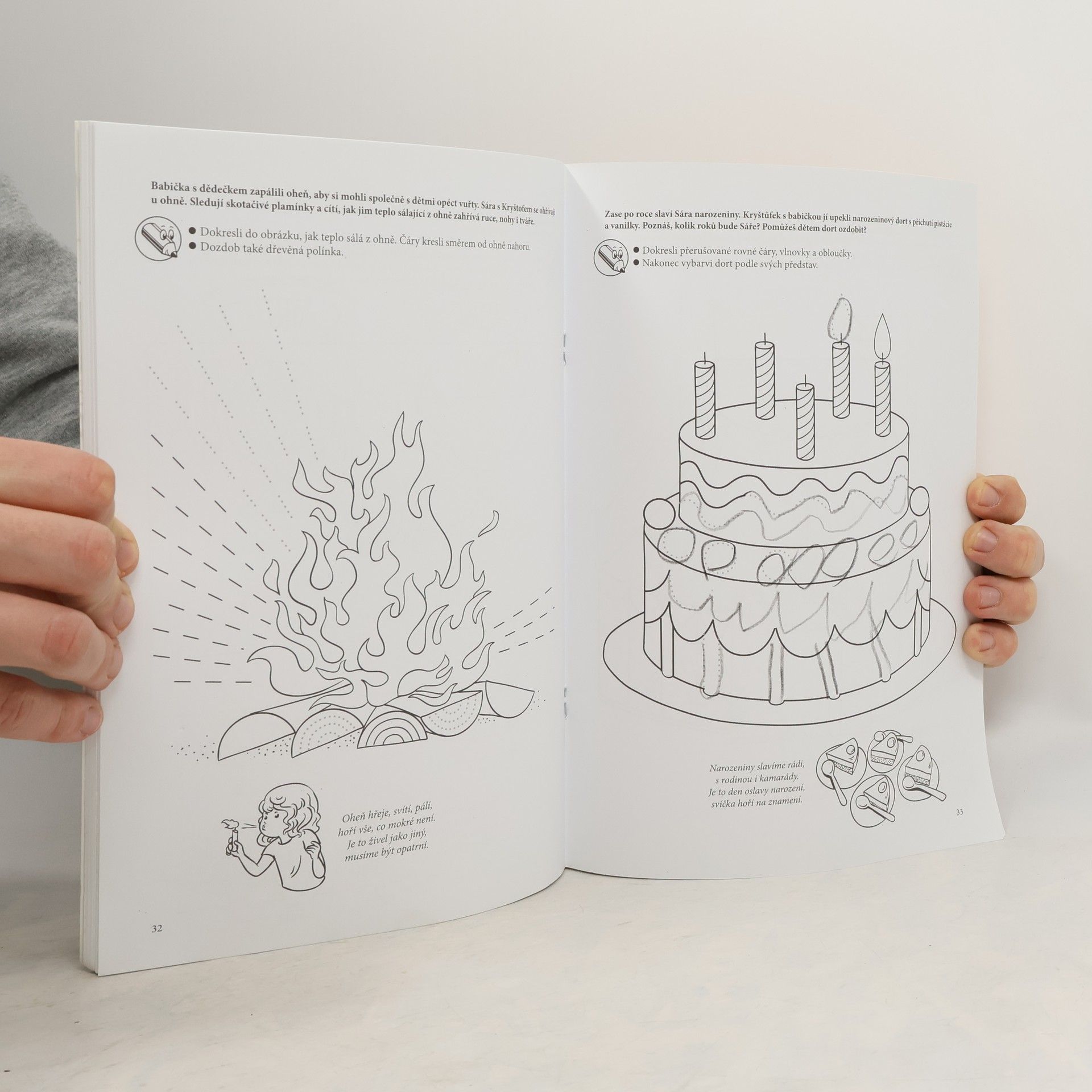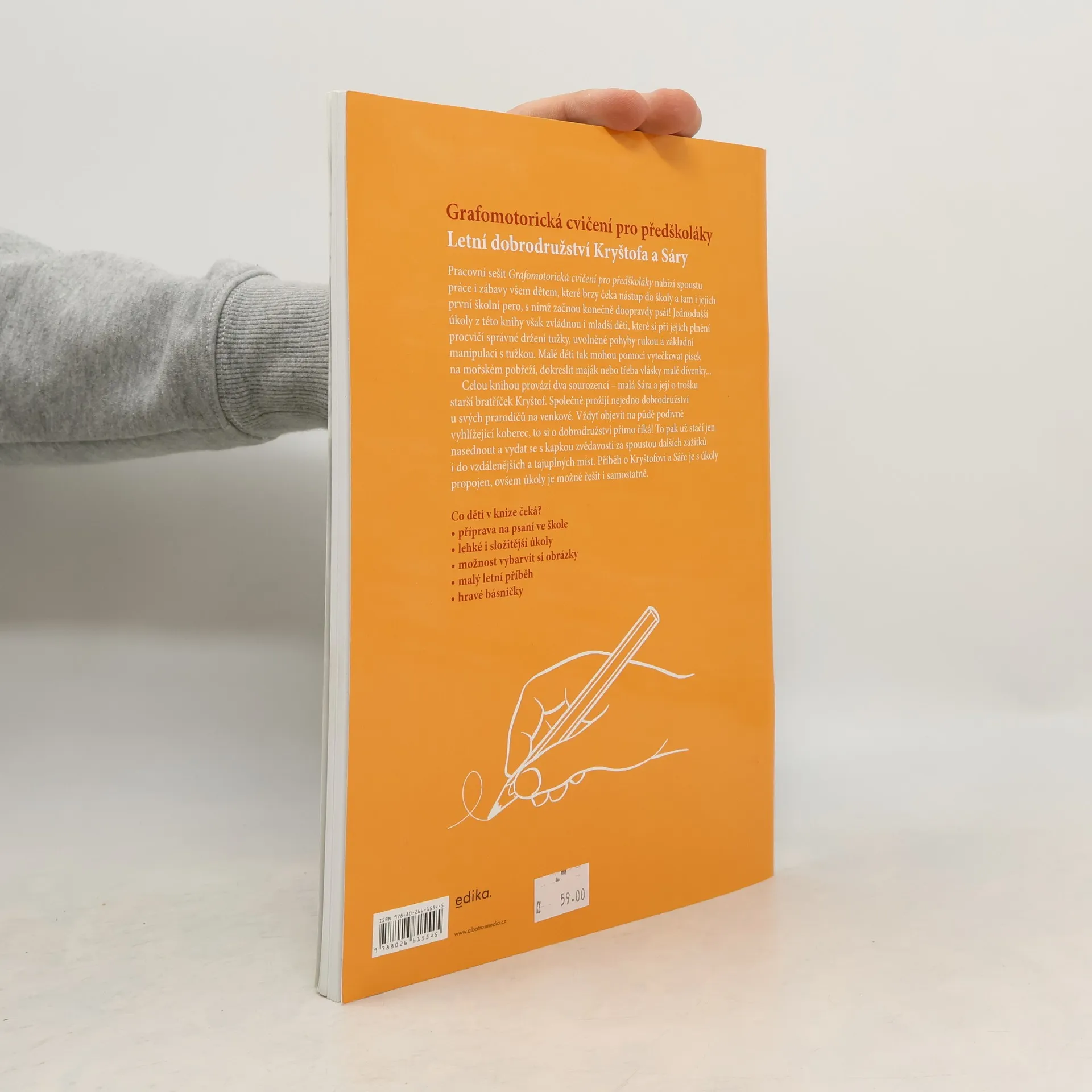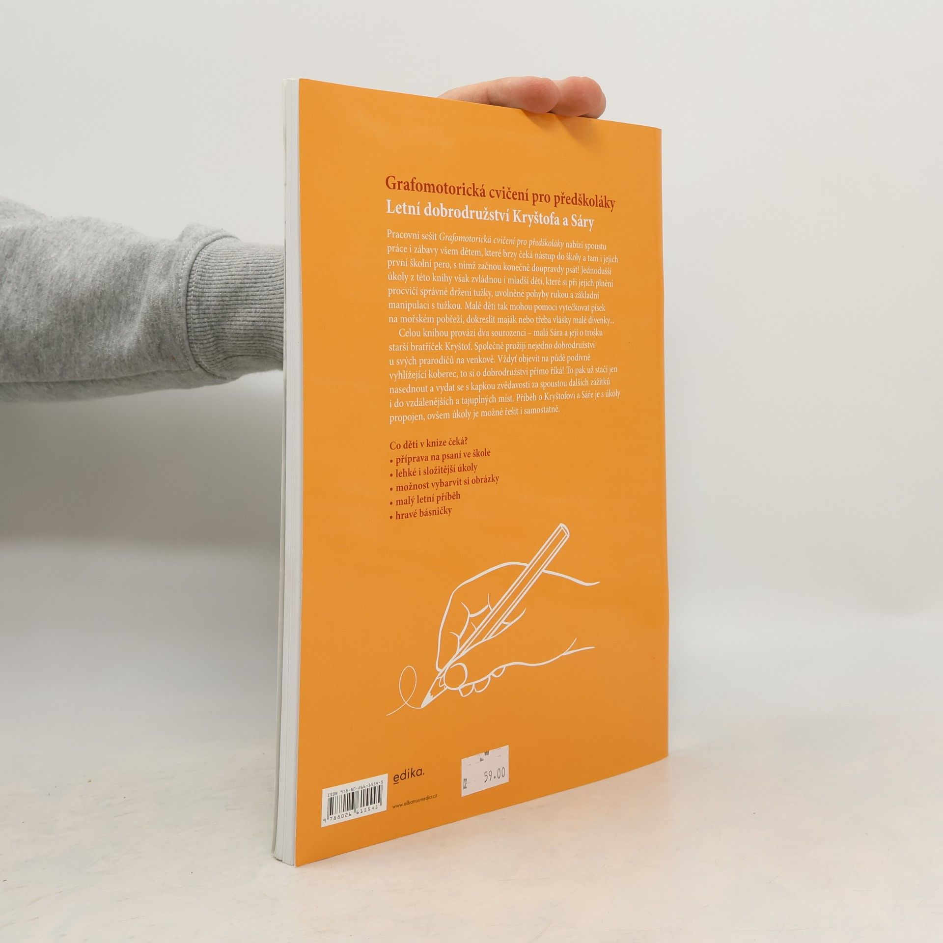 Grafomotorická cvičení pro předškoláky Letní dobrodružství Kryštofa a Sáry Pracovní sešit Grafomotorická cvičení pro předškoláky nabízí spoustu práce i zábavy všem dětem, které brzy čeká nástup do školy a tam i jejich první školní pero, s nímž začnou konečně doopravdy psát! Jednodušší úkoly z této knihy však zvládnou i mladší děti, které si při jejich plnění procvičí správné držení tužky, uvolněné pohyby rukou a základní manipulaci s tužkou. Malé děti tak mohou pomoci vytečkovat písek na mořském pobřeží, dokreslit maják nebo třeba vlásky malé dívenky... Celou knihou provází dva sourozenci – malá Sára a její o trošku starší bratříček Kryštof. Společně prožijí nejedno dobrodružství u svých prarodičů na venkově. Vždyť objevit na půdě podivně vyhlížející koberec, to si o dobrodružství přímo říká! To pak už stačí jen nasednout a vydat se s kapkou zvědavosti za spoustou dalších zážitků i do vzdálenějších a tajuplných míst. Příběh o Kryštofovi a Sáře je s úkoly propojen, ovšem úkoly je možné řešit i samostatně. Co děti v knize čeká? * příprava na psaní ve škole * lehké i složitější úkoly * možnost vybarvit si obrázky * malý letní příběh * hravé básničky