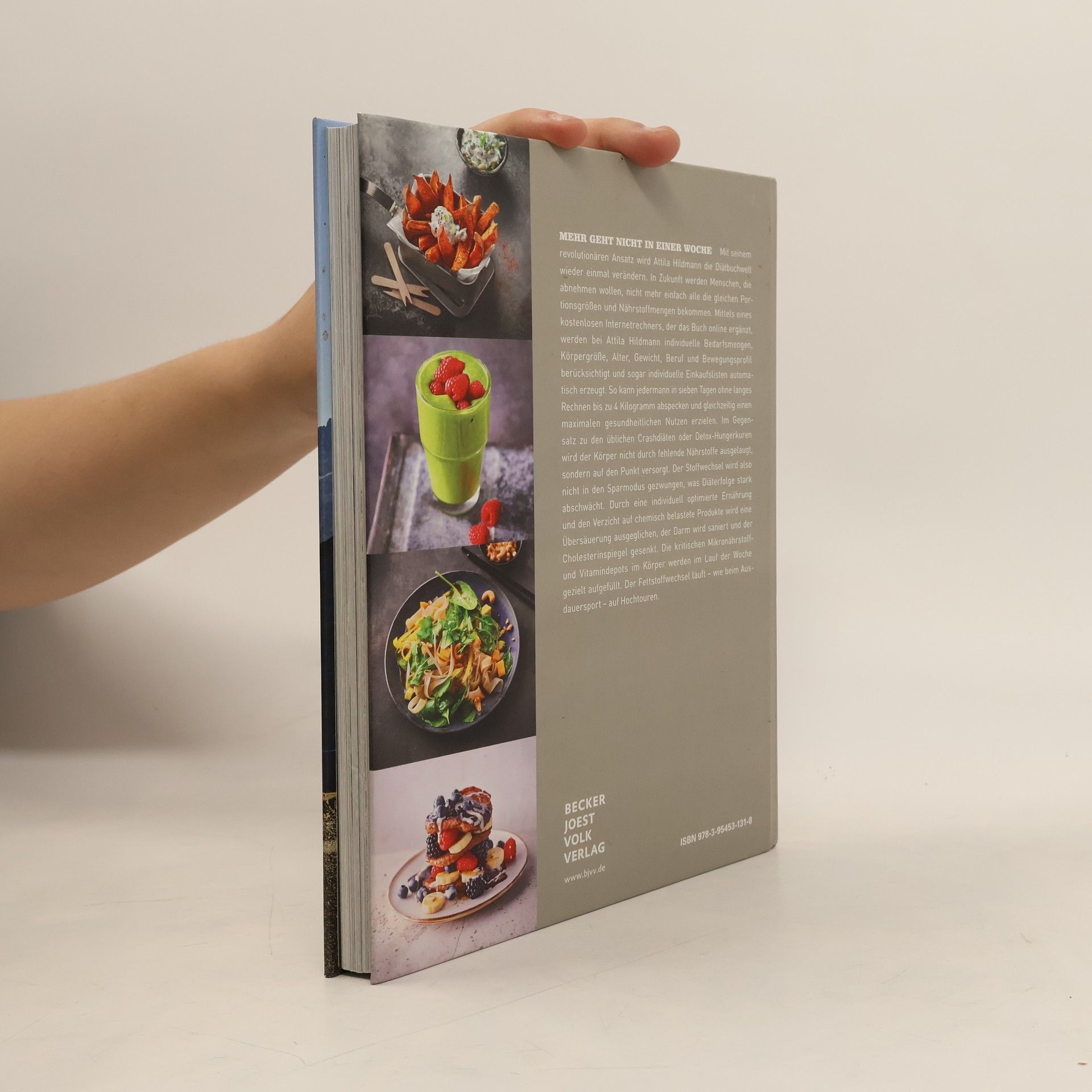 Mehr geht nicht in einer Woche Mit seinem revolutionären Ansatz wird Attila Hildmann die Diät-Buch-Welt wieder einmal verändern. In Zukunft werden Menschen, die abnehmen wollen, nicht mehr einfach alle die gleichen Portionsgrößen und Nährstoffe bekommen. Mittels eines kostenlosen Internet-Rechners, der das Buch online ergänzt, werden bei Attila Hildmann individuelle Bedarfsmengen, Körpergröße, Alter, Gewicht, Beruf und Bewegungsprofil berücksichtigt und sogar die individuellen Einkaufslisten automatisch erzeugt. So kann jedermann in 7 Tagen ohne langes Rechnen bis zu 4 Kilo abspecken und gleichzeitig einen maximalen gesundheitlichen Nutzen erzielen. Im Gegensatz zu den üblichen Crash-Diäten oder Detox-Hunger-Kuren wird der Körper nicht durch fehlende Nährstoffe ausgelaugt, sondern auf Punkt versorgt. Der Stoffwechsel wird also nicht in den Sparmodus gezwungen, was Diäterfolge stark abschwächt. Durch individuell optimierte Ernährung und Verzicht auf chemisch belastete Produkte wird eine Übersäuerung ausgeglichen, der Darm wird saniert und der Cholesterinspiegel gesenkt. Die kritischen Mikronährstoff- und Vitamindepots im Körper werden im Laufe der Woche gezielt aufgefüllt. Der Fettstoffwechsel läuft, so wie beim Ausdauersport, auf Hochtouren.