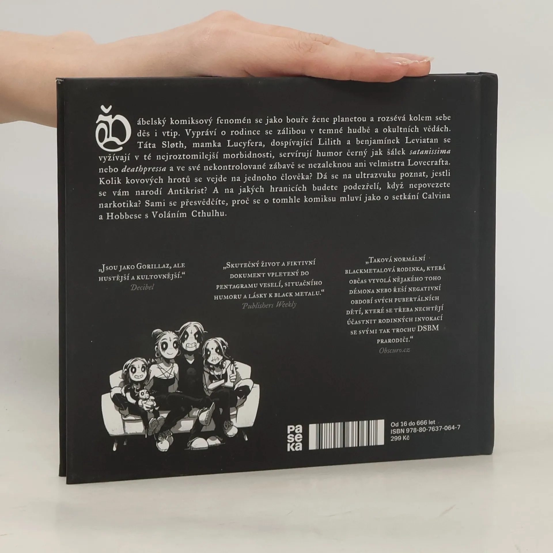 Ďábelský komiksový fenomén se jako bouře žene planetou a rozsévá kolem sebe děs i vtip. Vypráví o rodince se zálibou v temné hudbě a okultních vědách. Táta Sløth, mamka Lucyfera, dospívající Lilith a benjamínek Leviatan se vyžívají v té nejroztomilejší morbidnosti, servírují humor černý jak šálek satanissima a ve své nekontrolované zábavě se nezaleknou ani velmistra Lovecrafta. Kolik kovových hrotů se vejde na jednoho člověka? Dá se na ultrazvuku poznat, jestli se vám narodí Antikrist? A na jakých hranicích budete podezřelí, když nepovezete narkotika? Sami se přesvědčíte, proč se o tomhle komiksu mluví jako o setkání Calvina a Hobbese s Voláním Cthulhu.