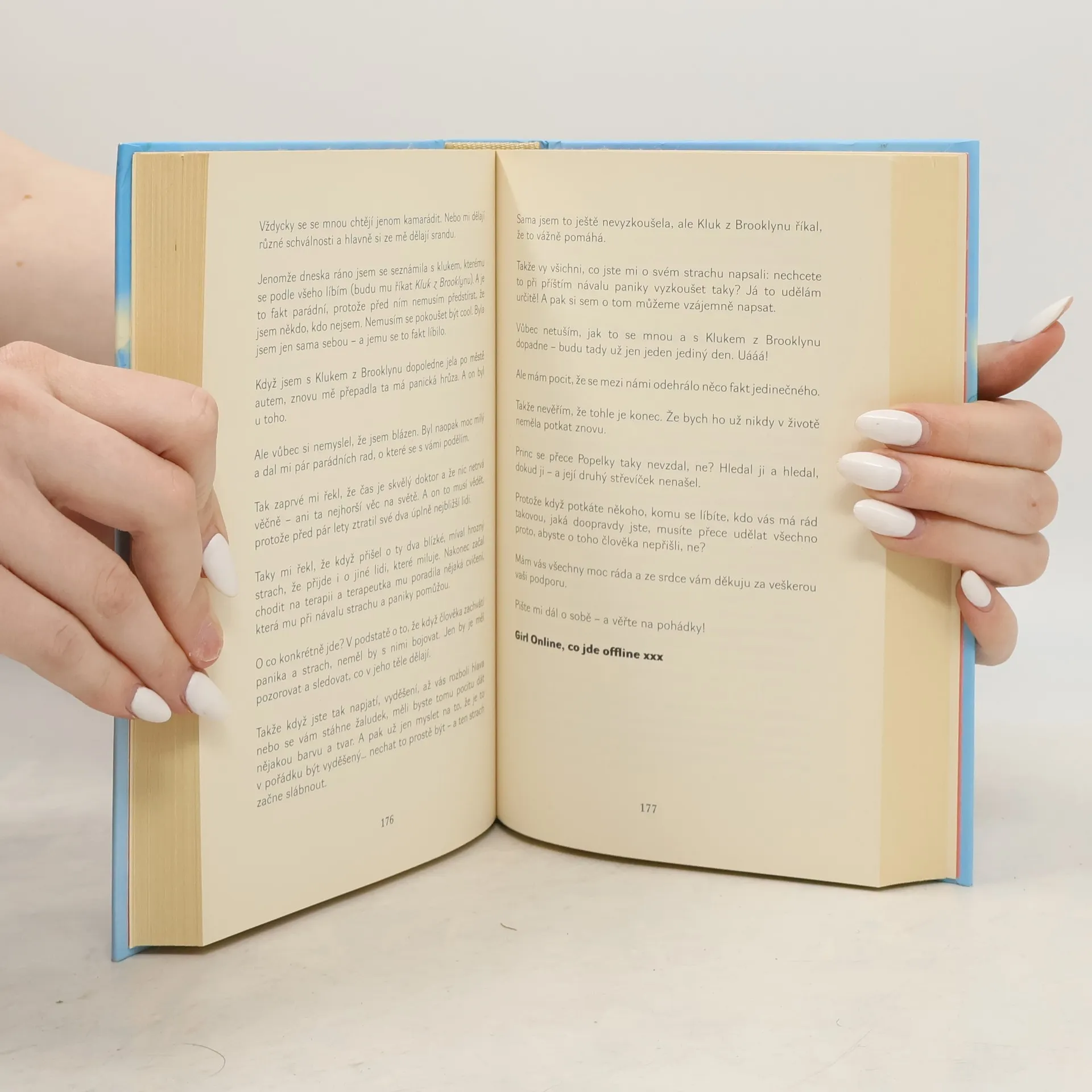 Penny má tajemství. Pod přezdívkou Girl Online si začne psát blog o svém každodenním životě – o klucích a kamarádkách, o trablech ve škole i doma, ale také o záchvatech paniky a úzkosti, kterými v poslední době trpí. Když ji na školním představení potká ten ,,největší trapas", který díky internetu uvidí ,,celý svět", a situace začne být na všech frontách na pováženou, rodiče ji vezmou na pár dnů do New Yorku. A tam Penny potká Noaha: úžasného charismatického muzikanta, kterému se prostě nedá odolat. A vůbec poprvé v životě se doopravdy zamiluje. A jak jinak (je přece blogerka!), o své pocity se upřímně podělí se všemi čtenářkami svého anonymního blogu. Jenomže Noah má taky svoje tajemství. A kvůli němu její anonymita na webu jednoho dne praskne jako mýdlová bublina – a v ohrožení se neocitne jenom ona, ale i její vztahy k nejbližším přátelům.