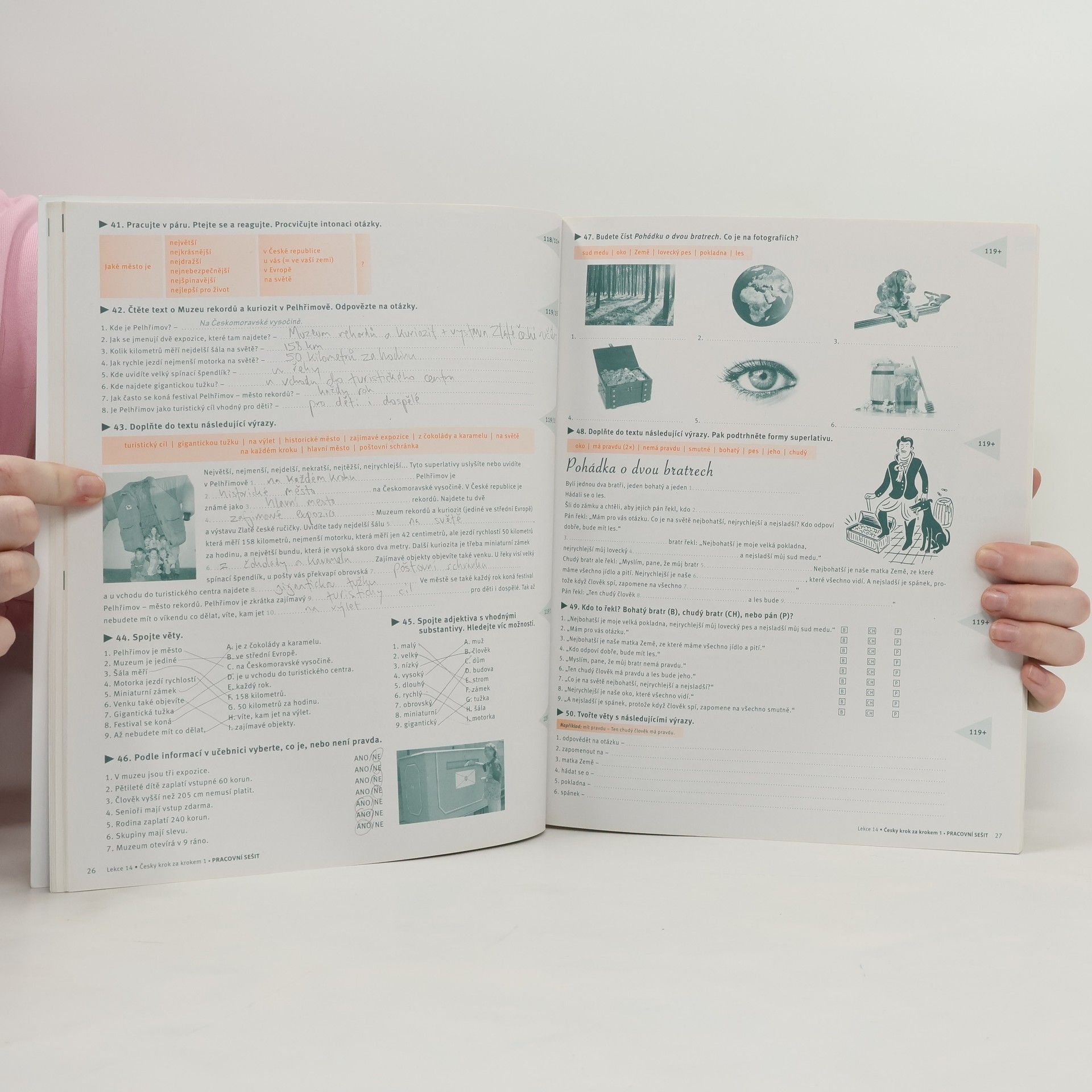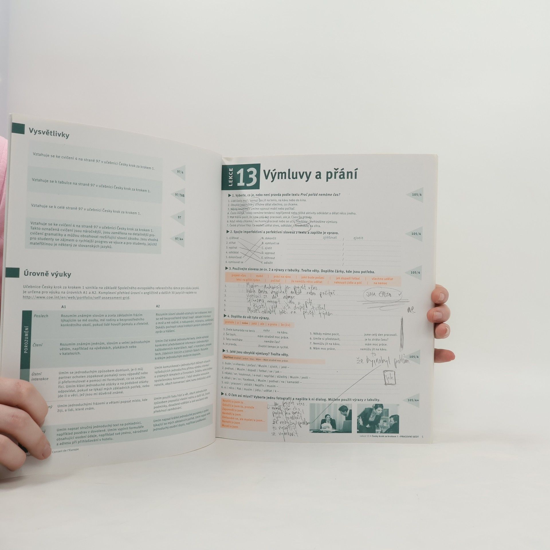 Pracovní sešit 13–24 je součástí učebnice češtiny pro začátečníky na úrovních A1-A2. Obsahuje cvičení zaměřená na rozvoj jazykových dovedností, včetně čtení, psaní, poslechu a mluvení. Každá kapitola se věnuje různým tématům, jako jsou každodenní situace, rodina, volný čas a cestování, což pomáhá studentům osvojit si základní slovní zásobu a gramatiku. Sešit nabízí praktické úkoly, které podporují aktivní učení a usnadňují procvičování jazyka v kontextu. Důraz je kladen na interakci a komunikaci, což umožňuje studentům lépe se orientovat v reálných situacích. Tento pracovní sešit je určen pro samostatné učení i jako doplněk k výuce ve třídě.
