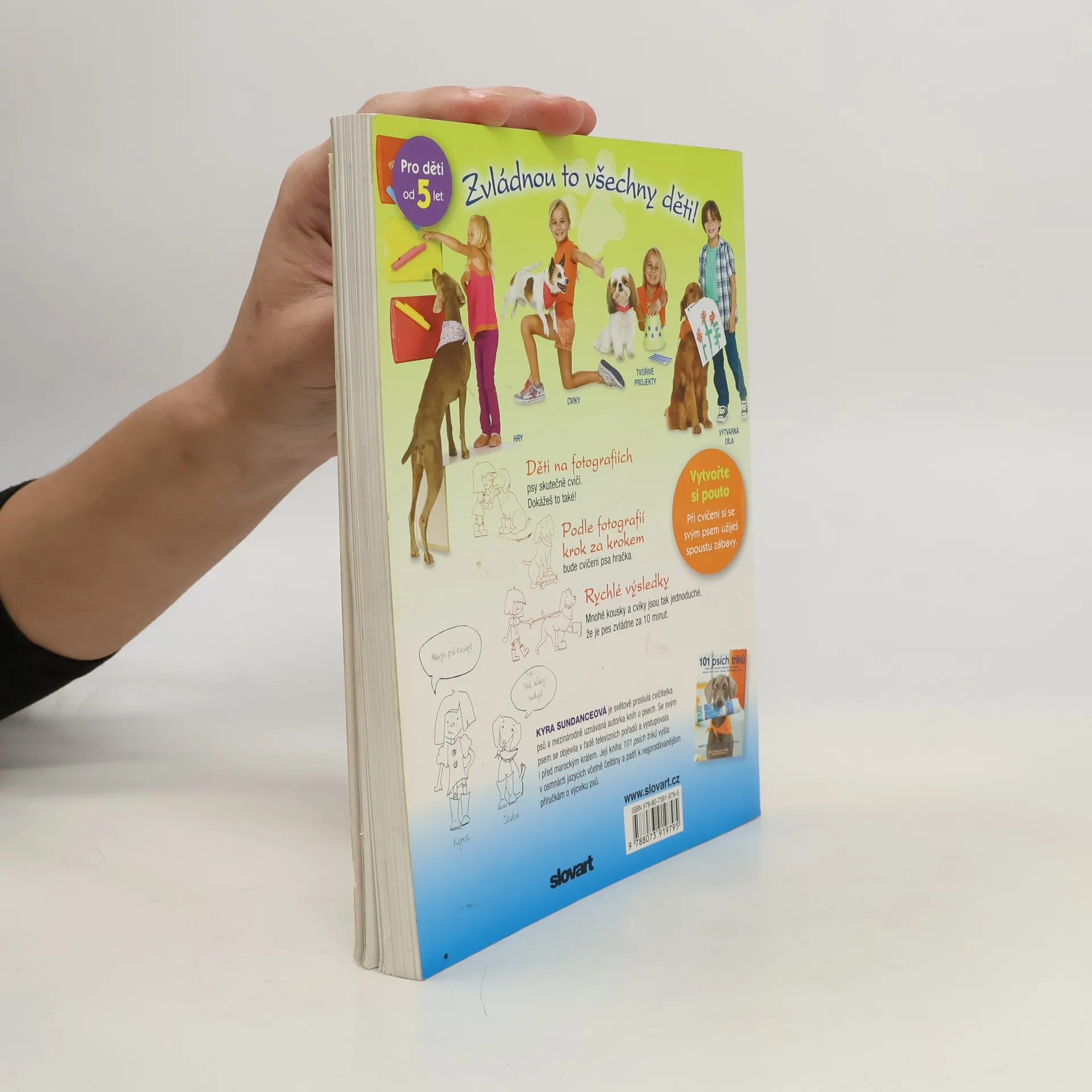 Knížka 101 psích triků pro děti proslulé cvičitelky psů a autorky mnoha bestsellerů Kyry Sundanceové volně navazuje na veleúspěšnou publikaci 101 psích triků téže autorky. Cvičitelka krok za krokem a pro děti přitažlivou formou podává návody, jak mohou děti samy naučit své psí miláčky celé řadě kousků, a dokonce s nimi či pro ně realizovat zajímavé tvořivé projekty. Společný nácvik je skvělý způsob, jak si může dítě se svým psem vybudovat silné pouto, jak mu pomoci začlenit se rodiny a jak jej udržovat v dobré fyzické i psychické kondici. Všechny kousky a cviky byly vybrány s ohledem na dětské schopnosti. Mnohé z nich jsou tak jednoduché, že je pes dokáže zvládnout již během 10 minut. Všechny návody doprovázejí fotografie, které nácvik ilustrují krok za krokem.