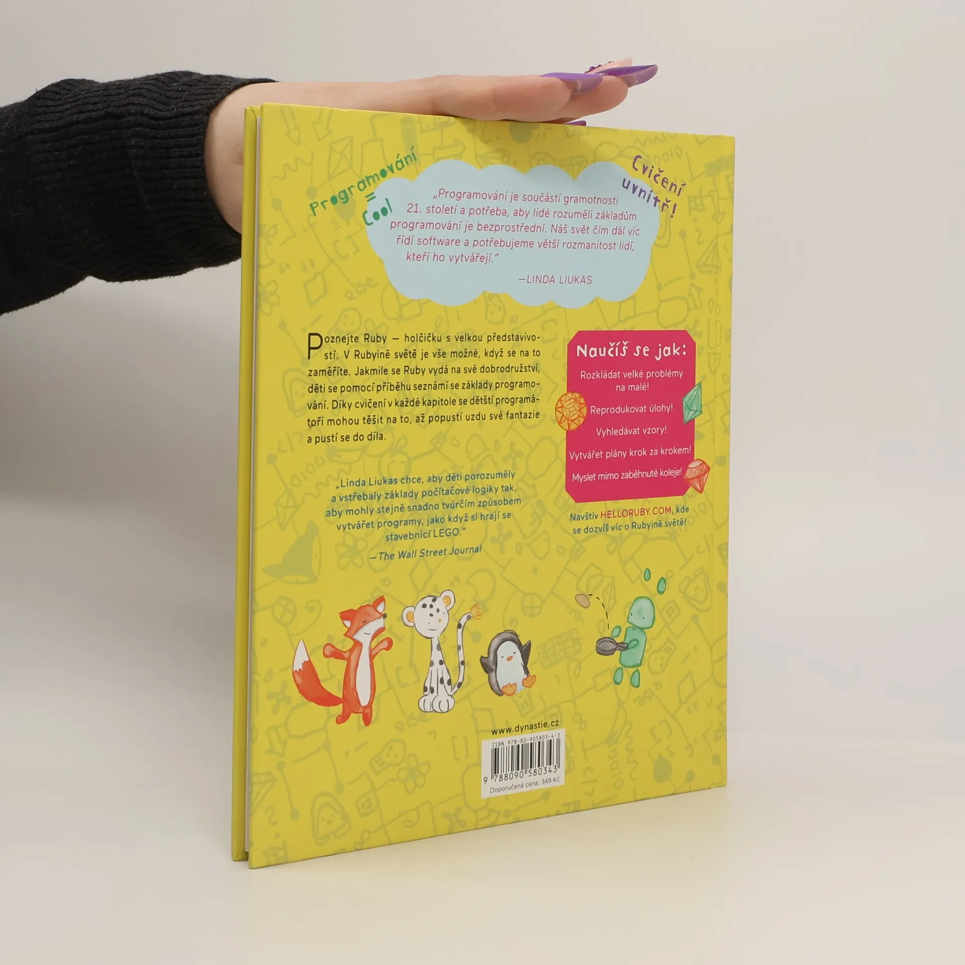 Poznejte Ruby — holčičku s velkou představivostí. V Rubyině světě je vše možné, když se na to zaměříte. Jakmile se Ruby vydá na své dobrodružství, děti se pomocí příběhu seznámí se základy programování. Díky cvičení v každé kapitole se dětští programátoři mohou těšit na to, až popustí uzdu své fantazie a pustí se do díla. Děti díky knize HELLO RUBY porozumí a vstřebají základy počítačové logiky tak, že budou moci stejně snadno tvůrčím způsobem vytvářet programy, jako když si hrají se stavebnicí nebo s LEGO kostičkami. „Programování je součástí gramotnosti 21. století a potřeba, aby lidé rozuměli základům programování je bezprostřední. Náš svět čím dál víc řídí software a potřebujeme větší rozmanitost lidí, kteří ho vytvářejí.” Linda Liukas S HELLO RUBY se děti naučí jak: - rozkládat velké problémy na malé - reprodukovat úlohy - vyhledávat vzory! - vytvářet plány krok za krokem - myslet mimo zaběhnuté koleje