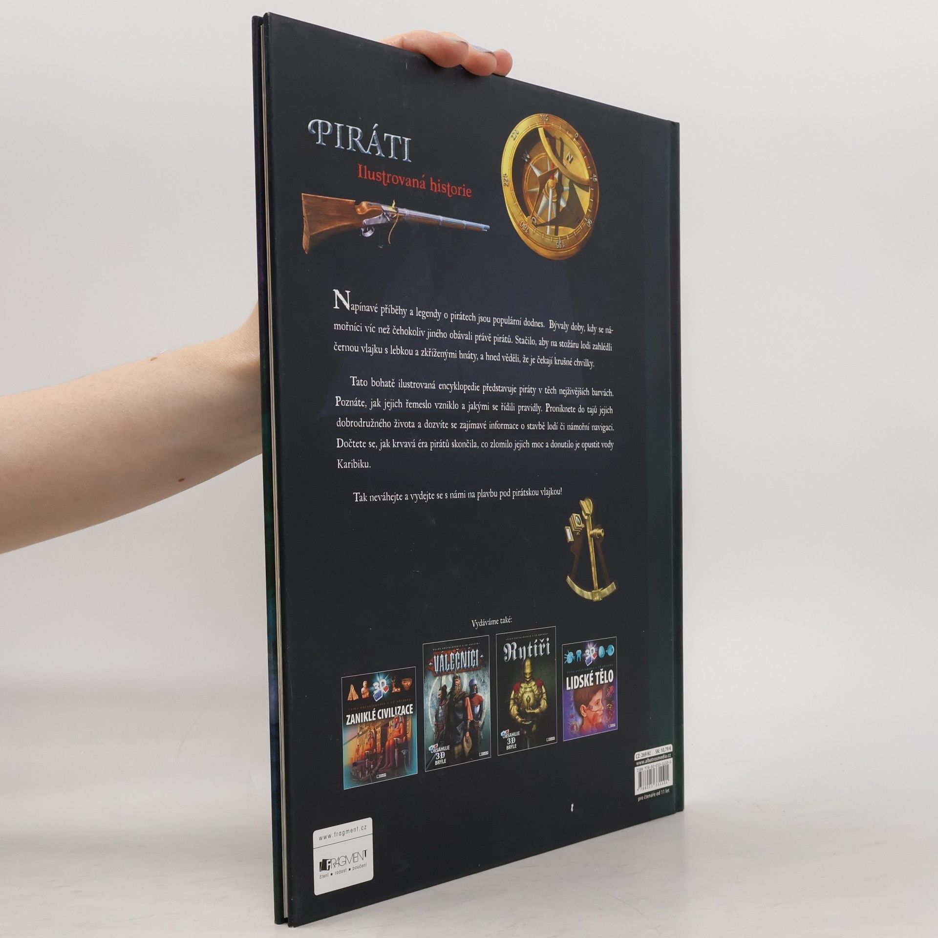 Napínavé příběhy a legendy o pirátech jsou populární dodnes. Bývaly doby, kdy se námořníci víc než čehokoliv jiného obávali právě pirátů. Stačilo, aby na stožáru lodi zahlédli černou vlajku s lebkou a zkříženými hnáty, a hned věděli, že je čekají krušné chvilky. Tato bohatě ilustrovaná encyklopedie představuje piráty v těch nejživějších barvách. Poznáte, jak jejich řemeslo vzniklo a jakými se řídili pravidly. Proniknete do tajů jejich dobrodružného života a dozvíte se zajímavé informace o stavbě lodí či námořní navigaci. Dočtete se, jak krvavá éra pirátů skončila, co zlomilo jejich moc a donutilo je opustit vody Karibiku. Tak neváhejte a vydejte se s námi na plavbu pod pirátskou vlajkou!