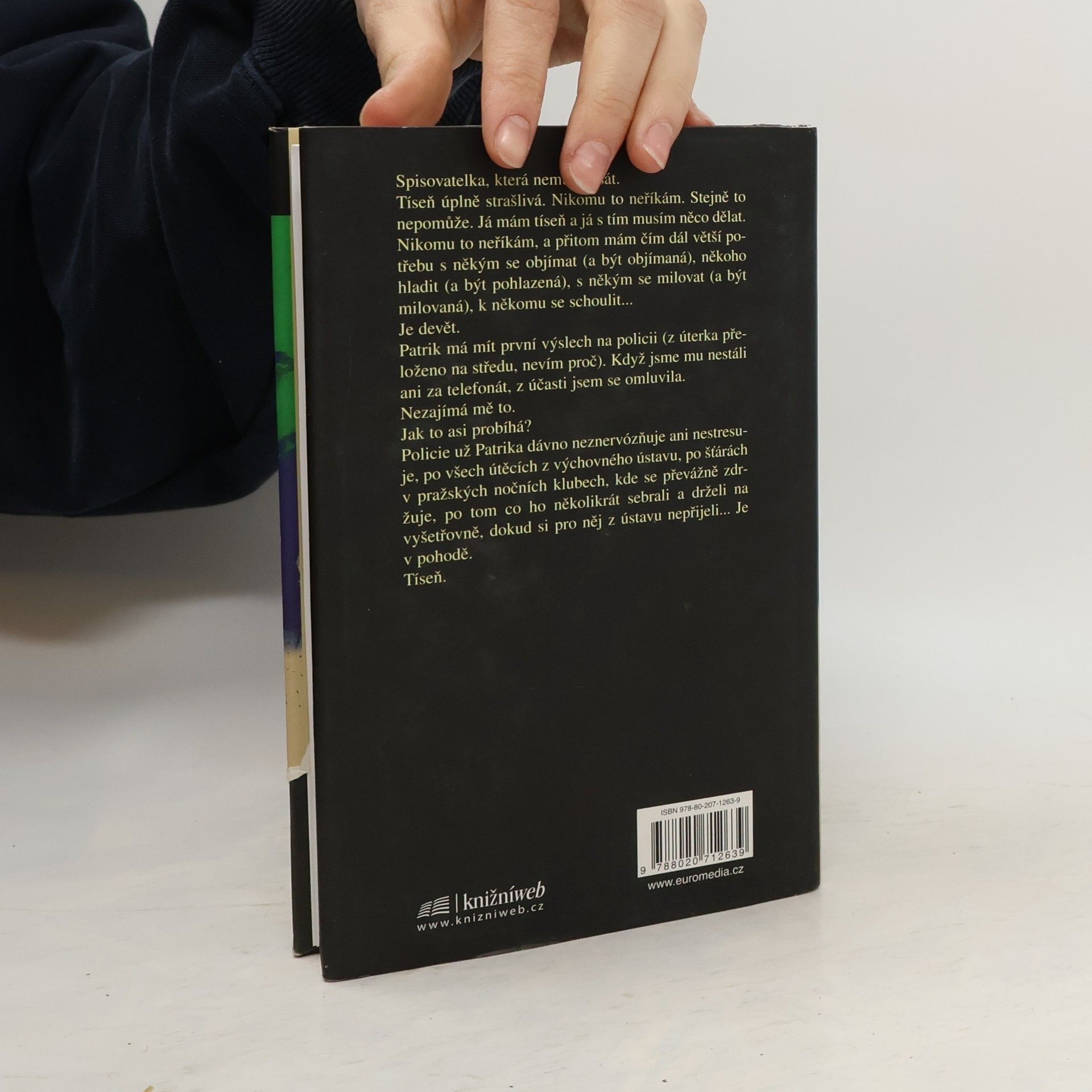 Spisovatelka, která nemůže psát. Tíseň úplně strašlivá. Nikomu to neříkám. Stejně to nepomůže. Já mám tíseň a já s tím musím něco dělat. Nikomu to neříkám a přitom mám čím dál větší potřebu s někým se objímat (a být objímaná), někoho hladit (a být pohlazená), s někým se milovat (a být milovaná), k někomu se schoulit... Je devět. Patrik má mít první výslech na policii (z úterka přeloženo na středu, nevím proč). Když jsme mu nestáli ani za telefonát, z účasti jsem se omluvila. Nezajímá mě to. Jak to asi probíhá? Policie už Patrika dávno neznervózňuje ani nestresuje, po všech útěcích z výchovného ústavu, po šťárách v pražských nočních klubech, kde se převážně zdržuje, po tom, co ho několikrát sebrali a drželi na vyšetřovně, dokud si pro něj z ústavu nepřijeli... Je v pohodě. Tíseň.
