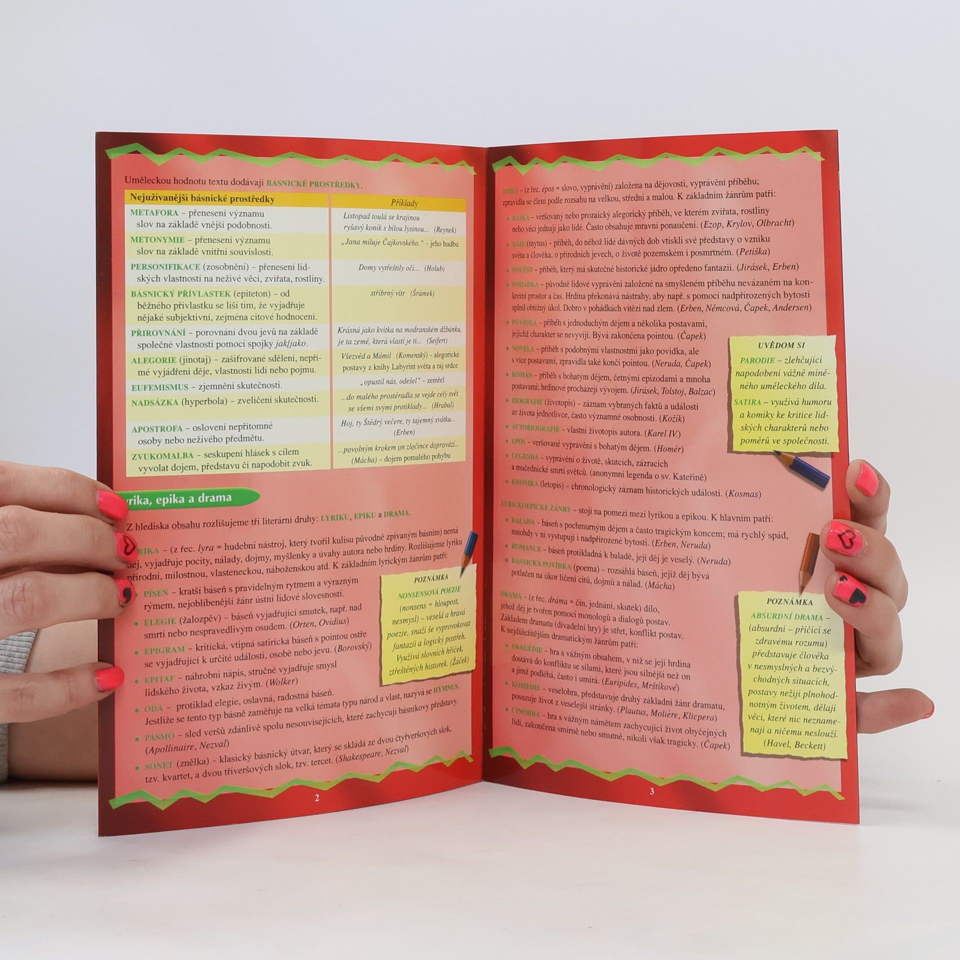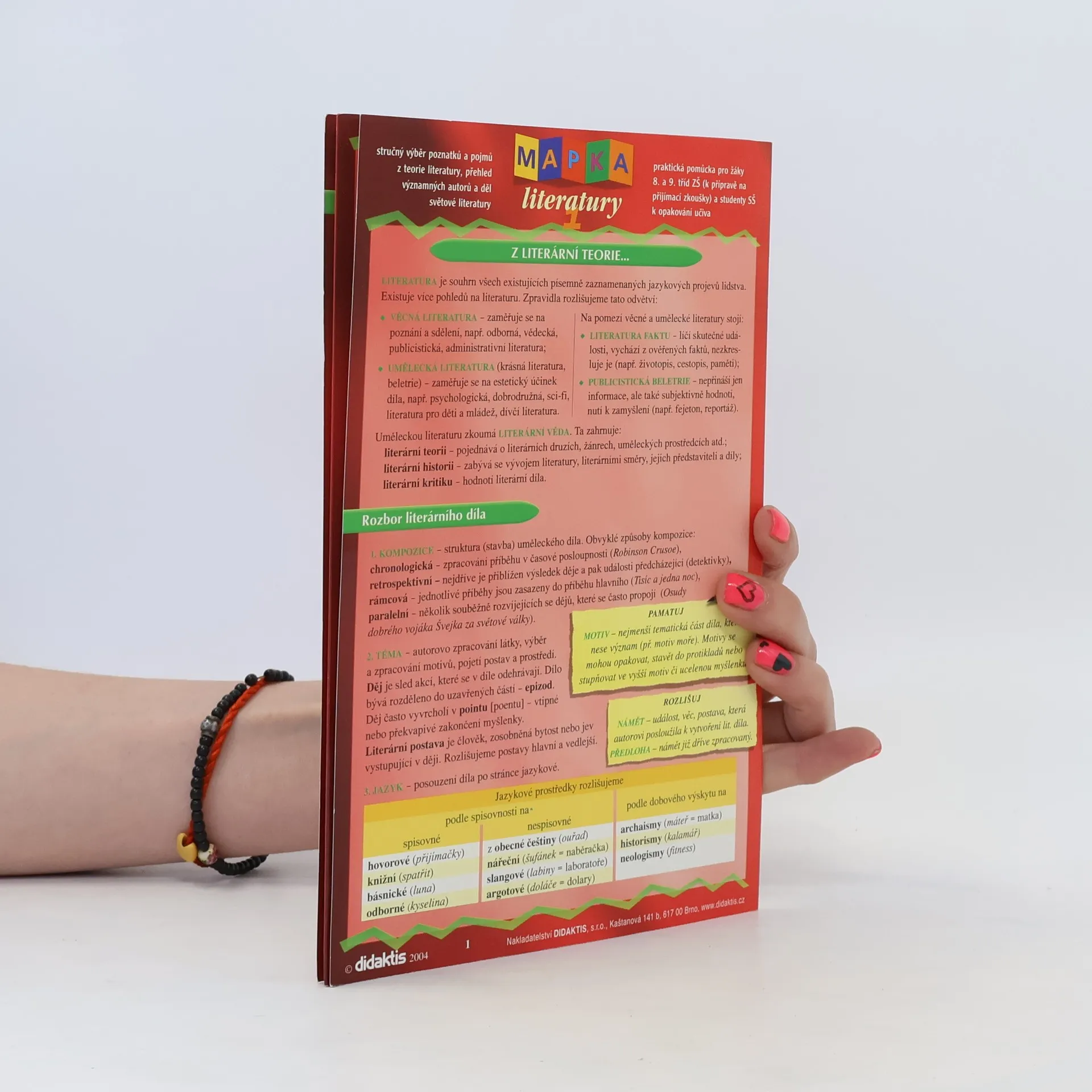 8 stran přehledně zpracovaných témat z literární teorie a světové historie. Jedinečná učební pomůcka ve formátu harmoniky nahrazuje zdlouhavé vyhledávání ve starých sešitech. Kvalitní povrchová úprava zabraňuje poškození častým užíváním. Určeno především žákům 2. stupně ZŠ, ale i studentům prvních ročníků SŠ.